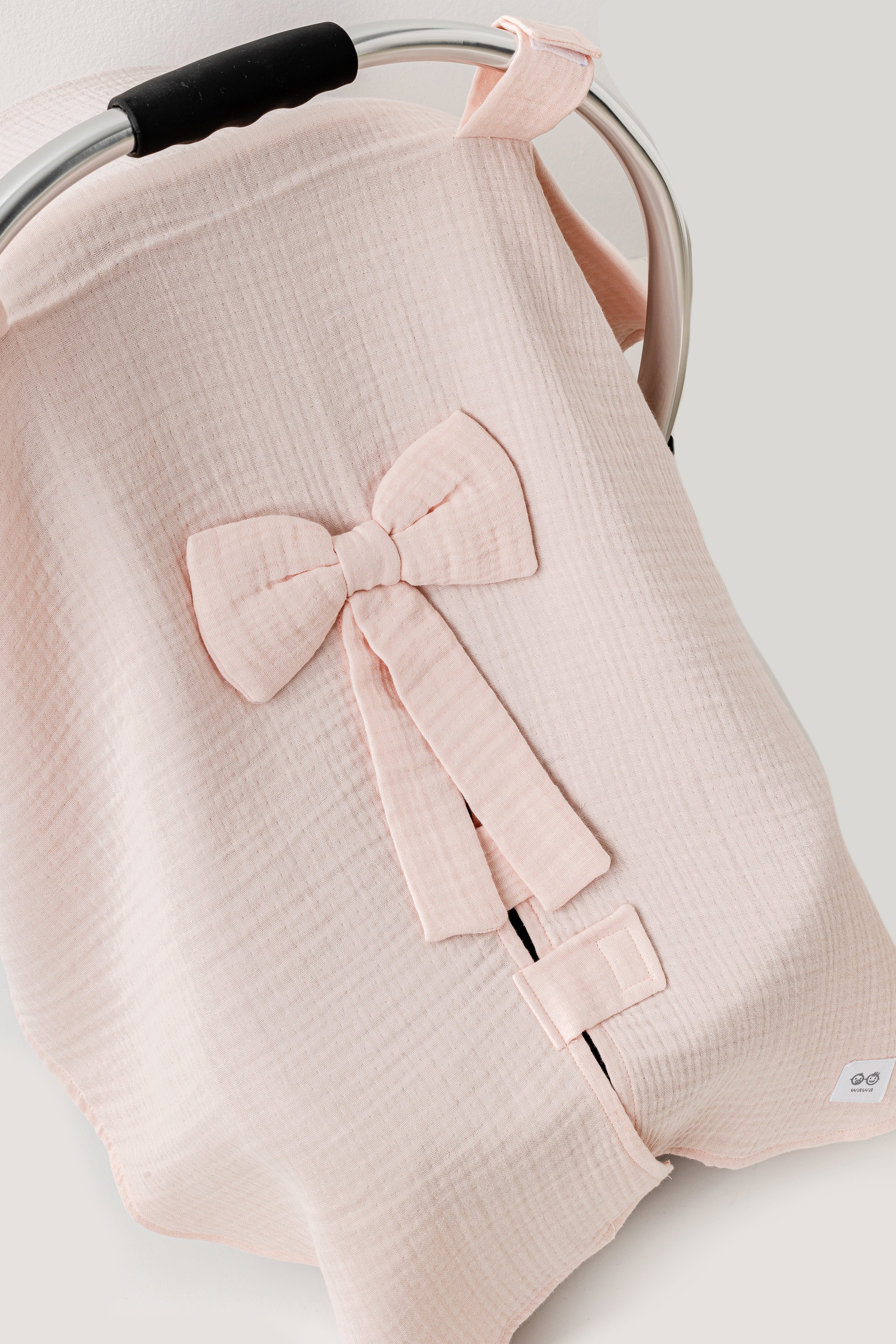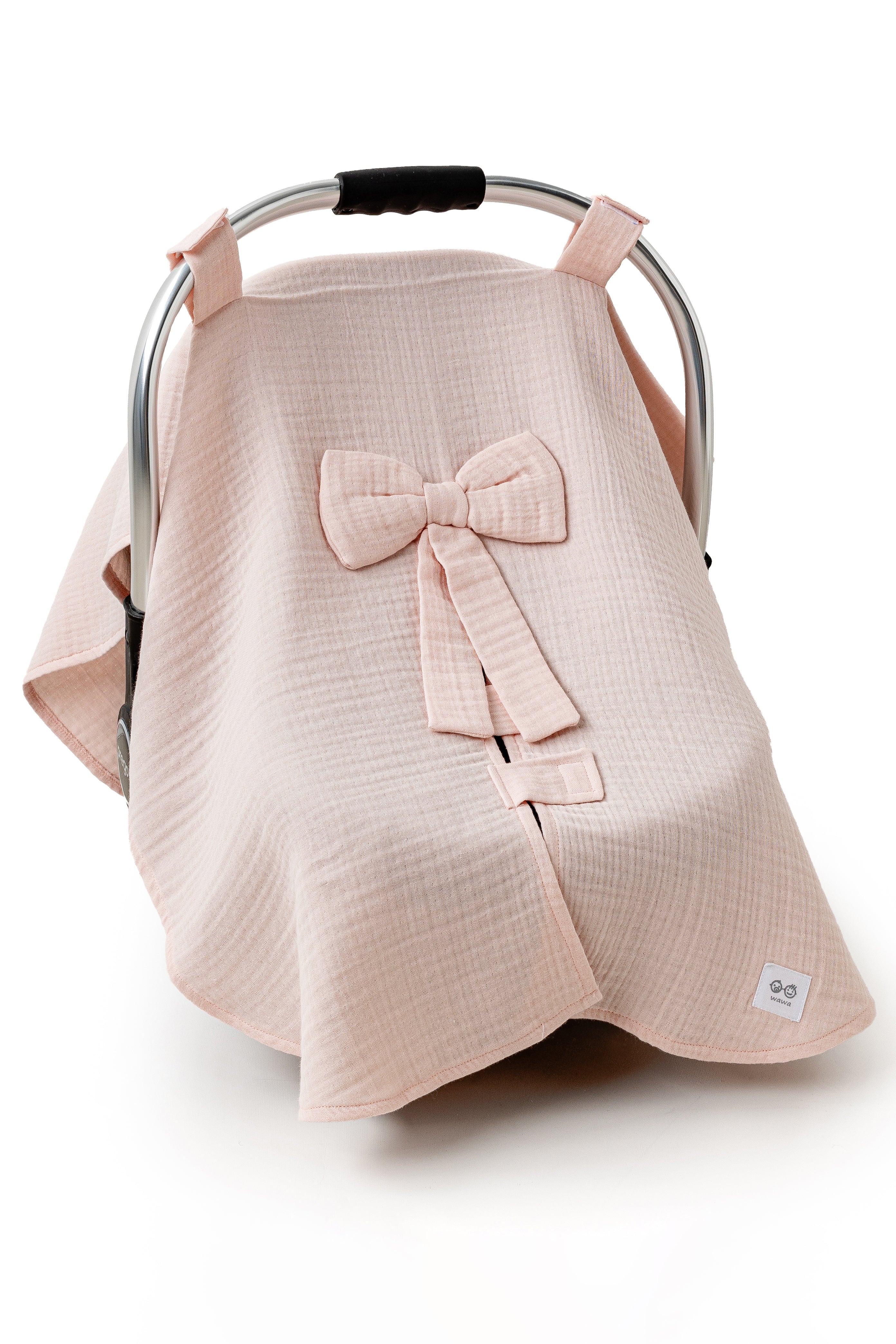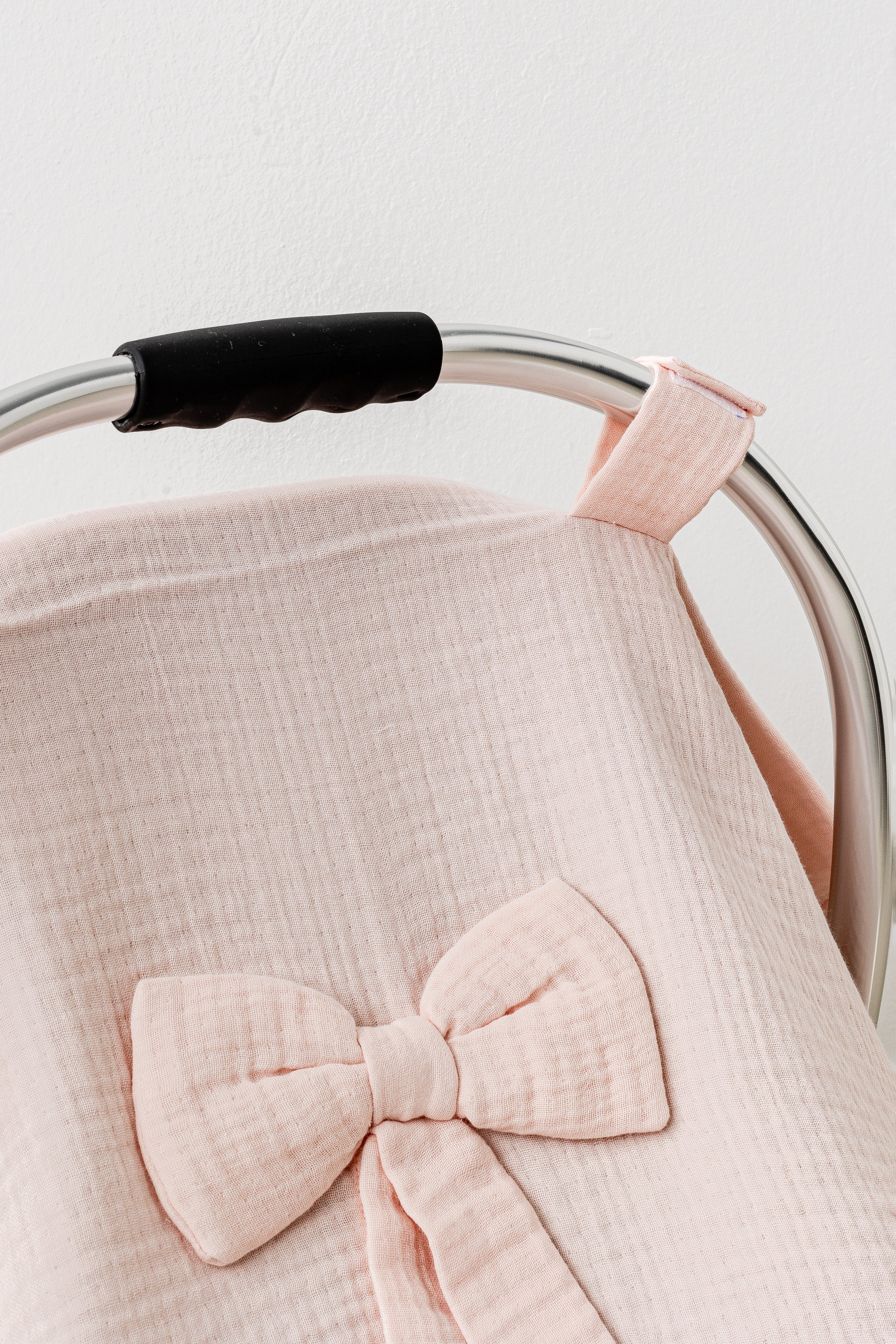 The Pink Muslin Bow Car Seat Cover adds a sweet and stylish touch to your baby's car seat while offering comfort and protection. Made from soft, breathable muslin fabric, it ensures a gentle feel against your little one's skin.