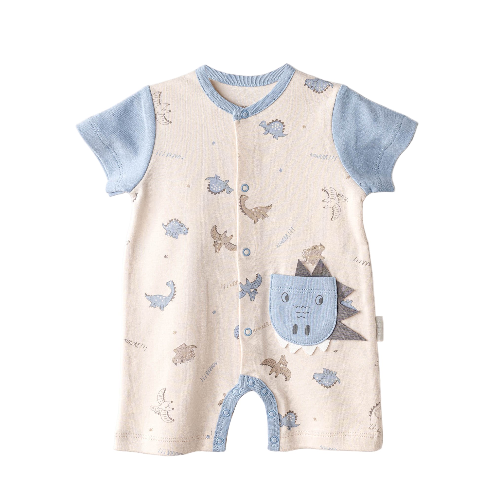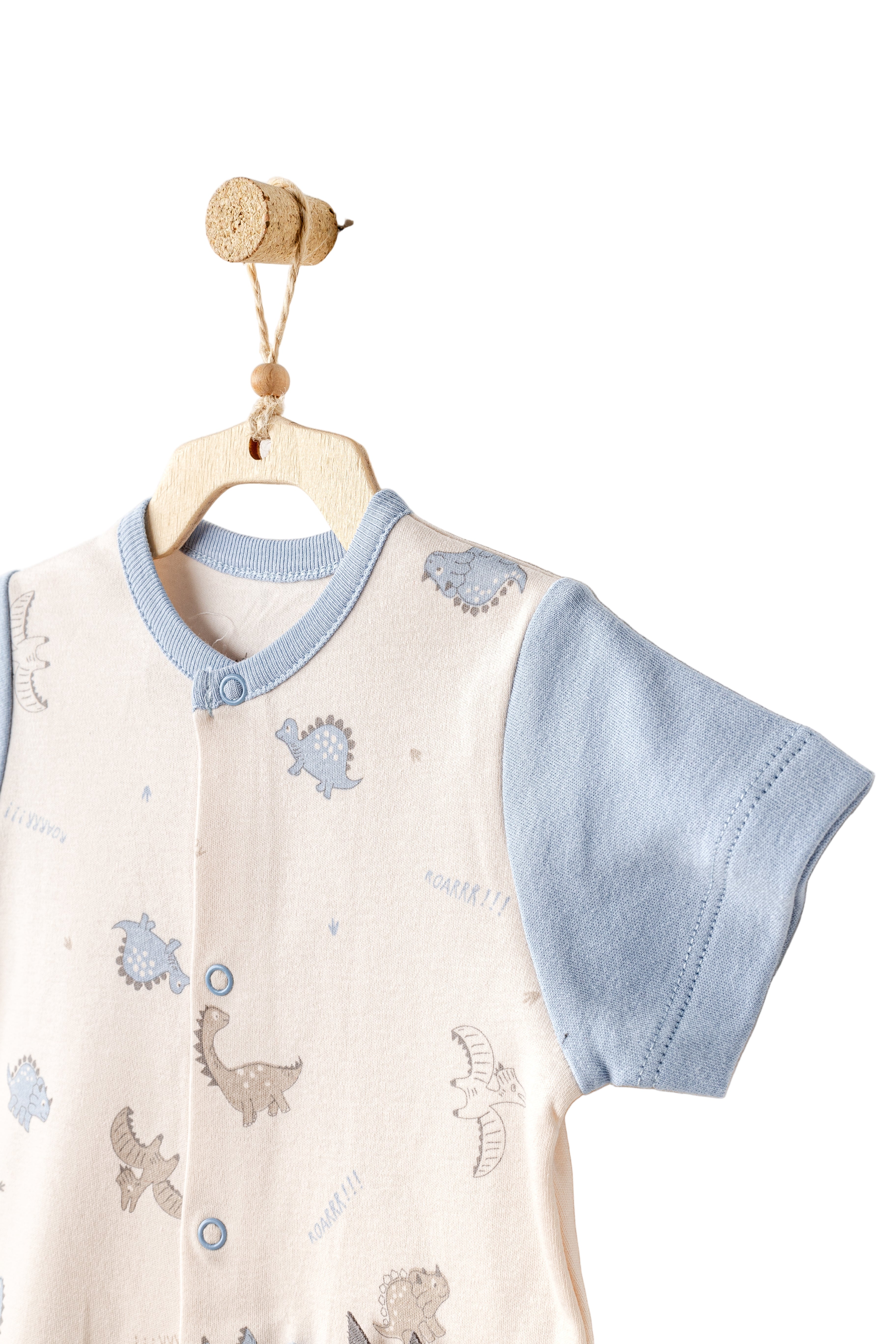 A fun cartoon dinosaur print adds a touch of adventure, while contrasting blue sleeves give it a bold, eye-catching look. Snap closures make dressing and diaper changes quick and easy.