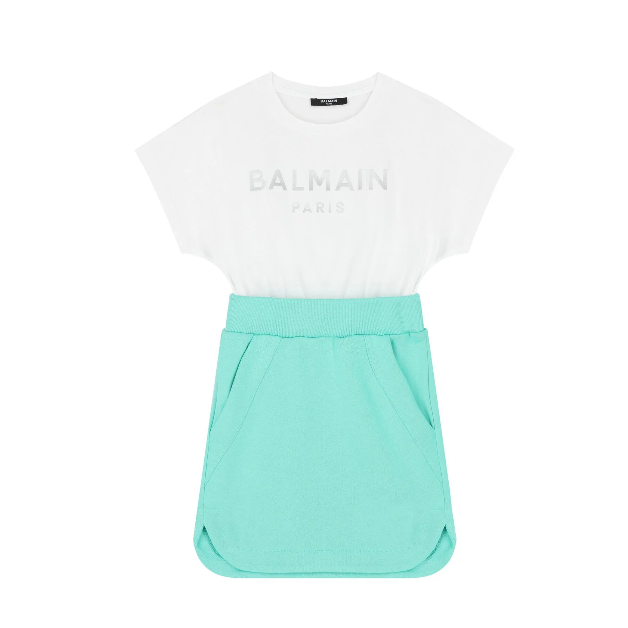 A fresh take on everyday dressing, this look dress combines a crisp white tee with a mint green skirt for a layered effect. The subtle logo print and striped neckline add understated detail, while the skirt’s rounded hems and side pockets bring playful structure. Designed for comfort and style, it’s ideal for warm-weather outings.