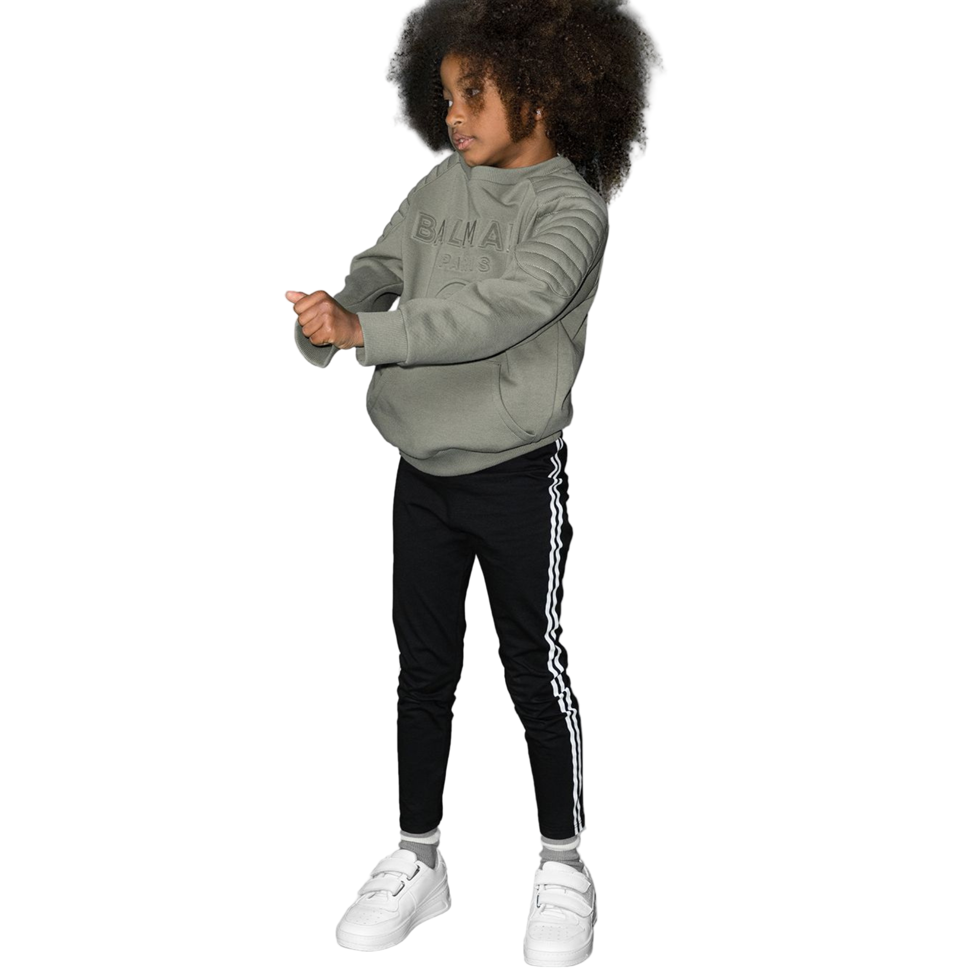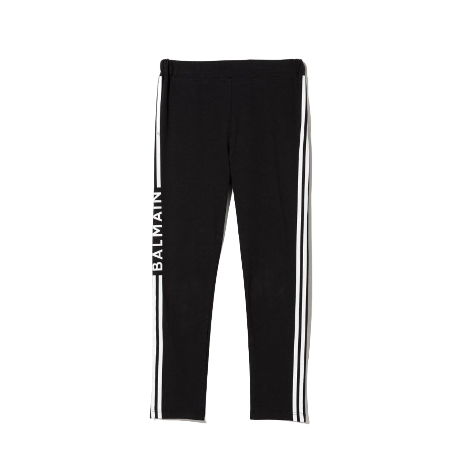 A sleek essential with graphic edge, these black leggings feature bold white side stripes and vertical logo detailing for a sporty-luxe finish. Designed in a soft stretch fabric with a close fit, they offer comfort and movement with elevated branding—ideal for casual styling or active days.