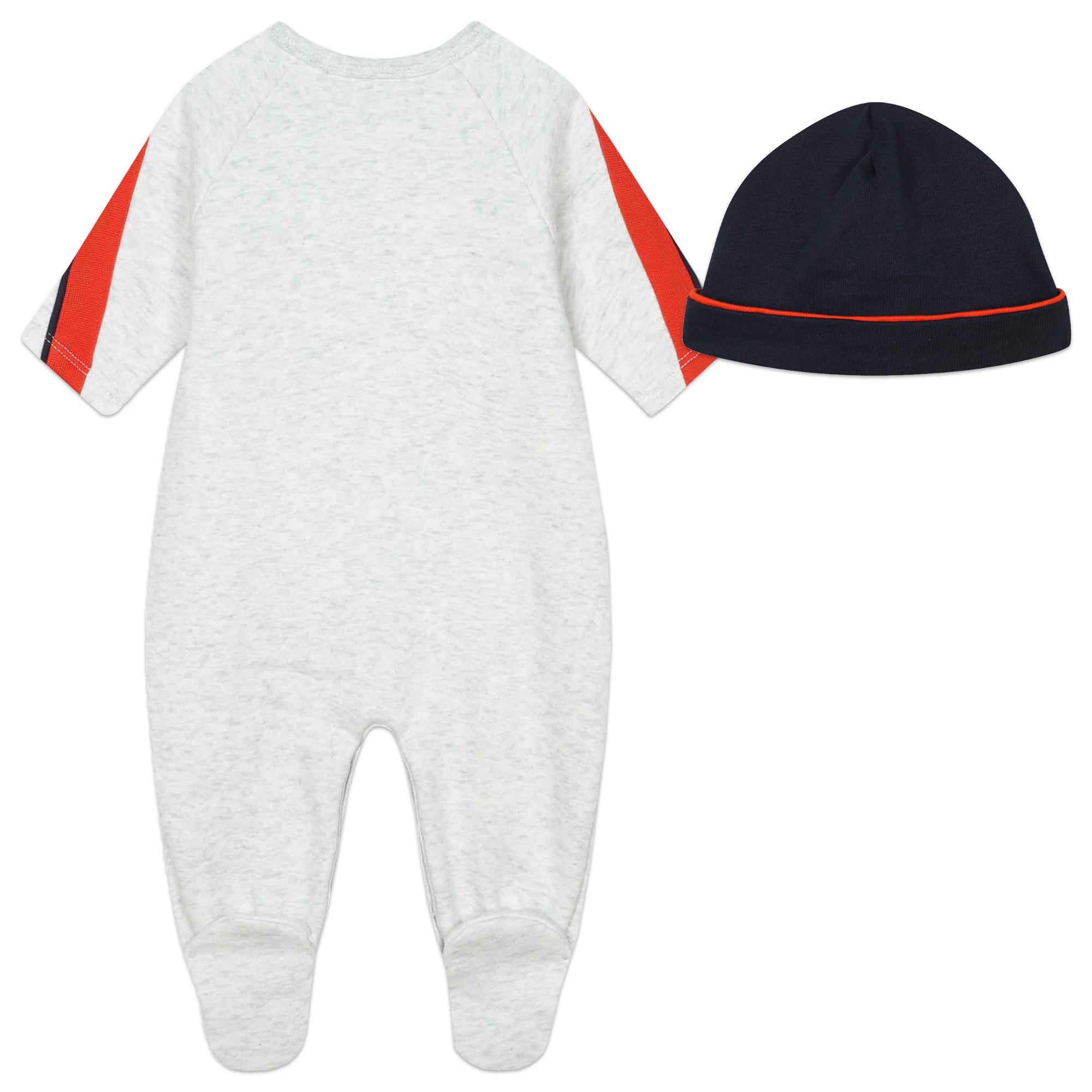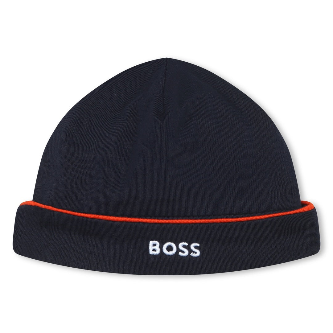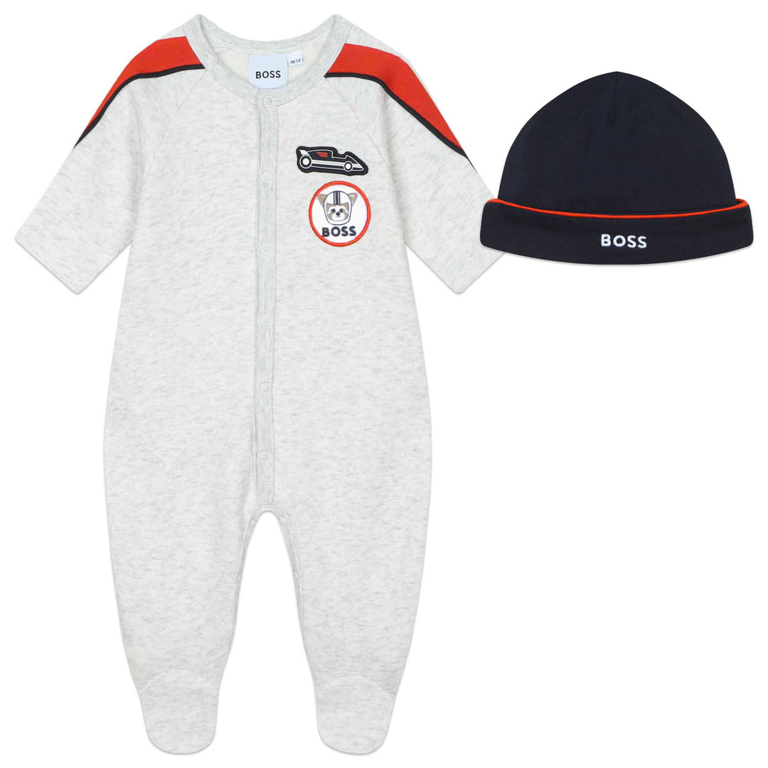 Step out in effortless style with this sophisticated light gray babygrow and hat set by BOSS, crafted from a luxurious cotton blend in a finely knitted construction. The babygrow showcases sleek side stripe detailing, complemented by a logo patch adorning the chest, a round neck, and a convenient front press-stud fastening. Its long sleeves and tapered leg design elegantly cover the foot, while pairing perfectly with the navy blue hat boasting a blend of light grey, navy blue, and brick red hues. The ribbed knit beanie features stripe detailing, an embroidered logo on the front, a turn-up brim, and a pull-on style for a refined finish to any ensemble.