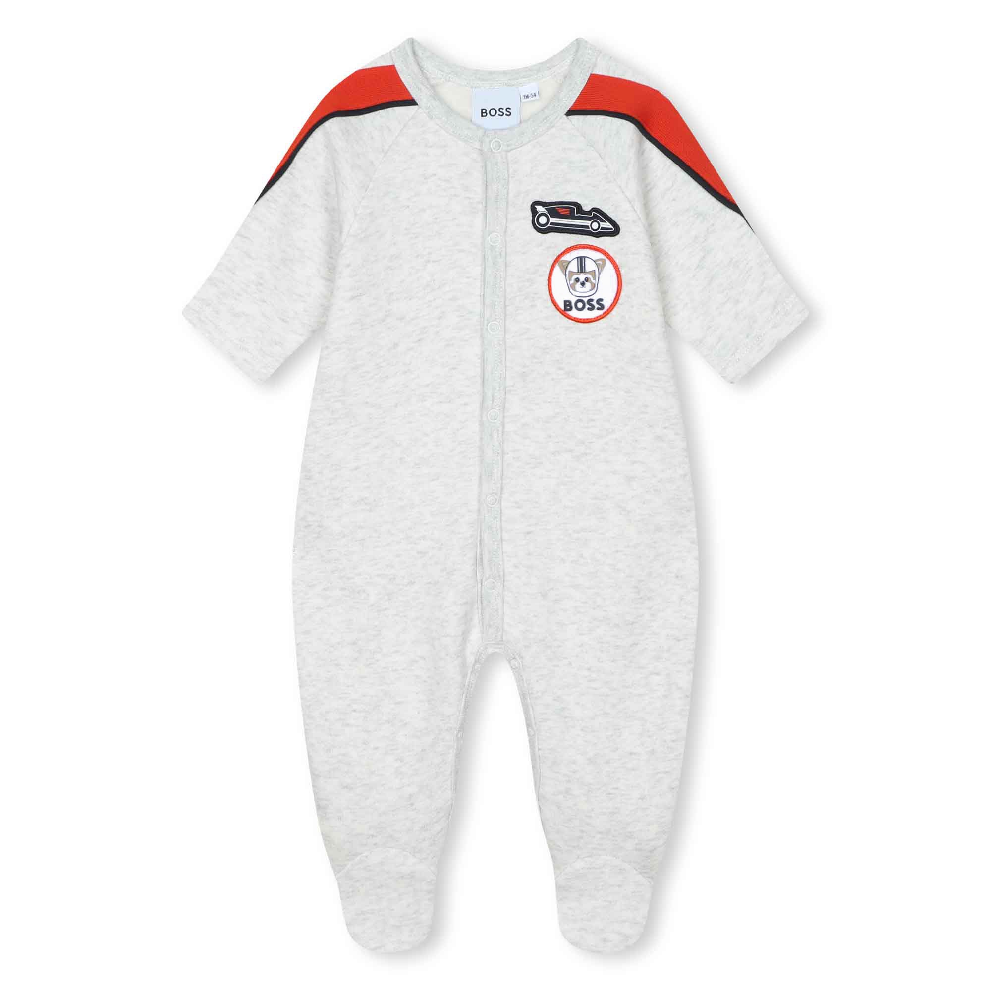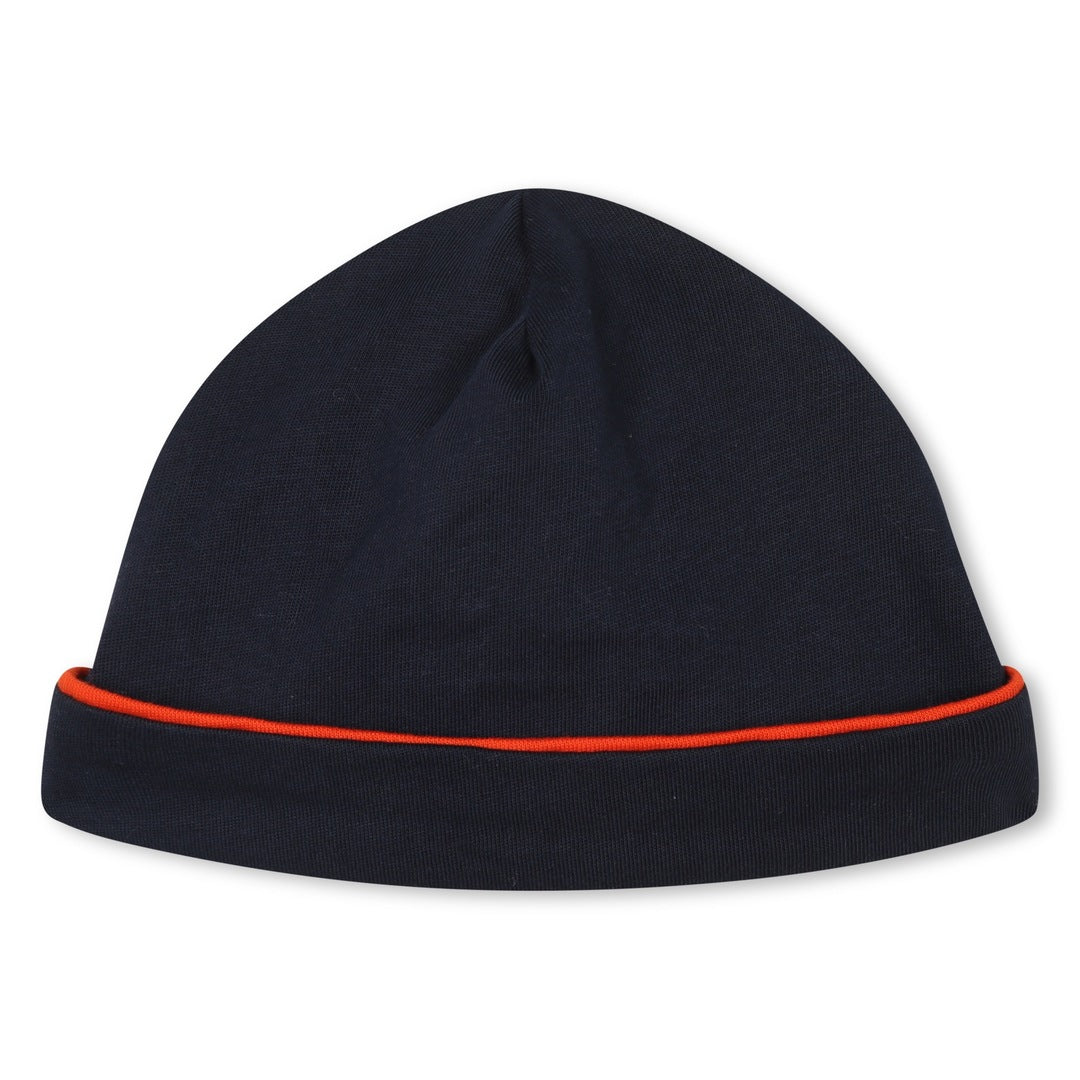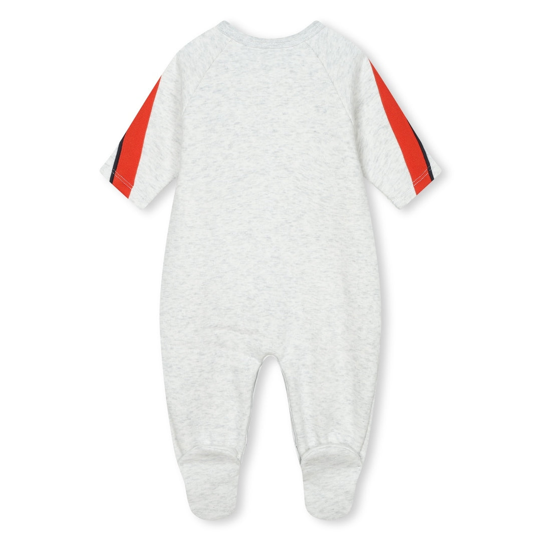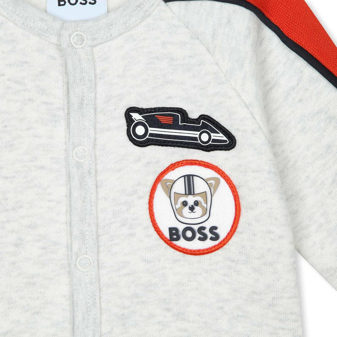 Step out in effortless style with this sophisticated light gray babygrow and hat set by BOSS, crafted from a luxurious cotton blend in a finely knitted construction. The babygrow showcases sleek side stripe detailing, complemented by a logo patch adorning the chest, a round neck, and a convenient front press-stud fastening. Its long sleeves and tapered leg design elegantly cover the foot, while pairing perfectly with the navy blue hat boasting a blend of light grey, navy blue, and brick red hues. The ribbed knit beanie features stripe detailing, an embroidered logo on the front, a turn-up brim, and a pull-on style for a refined finish to any ensemble.