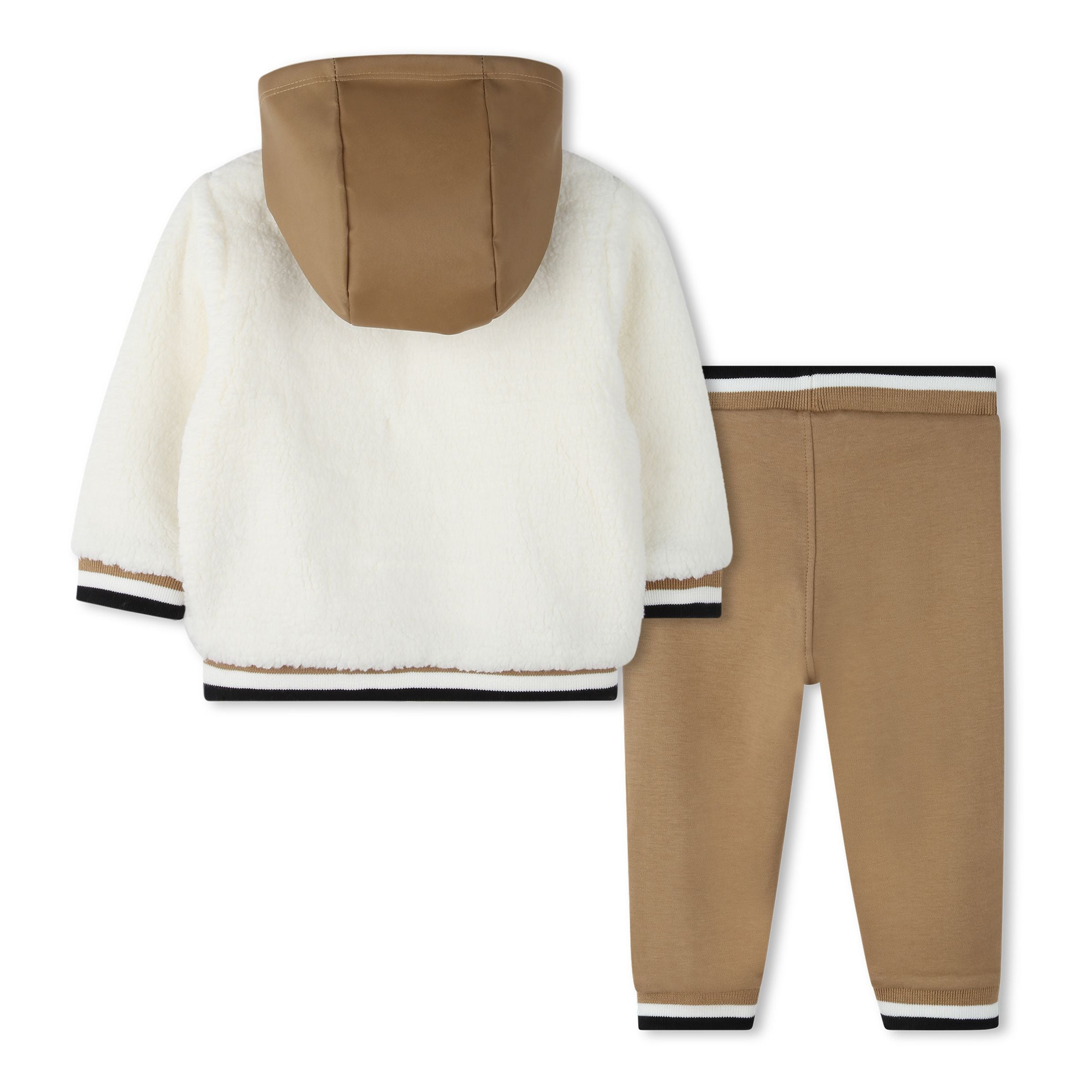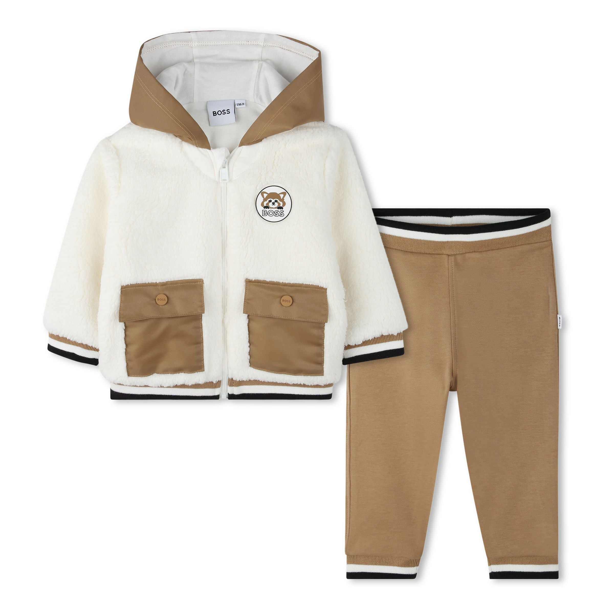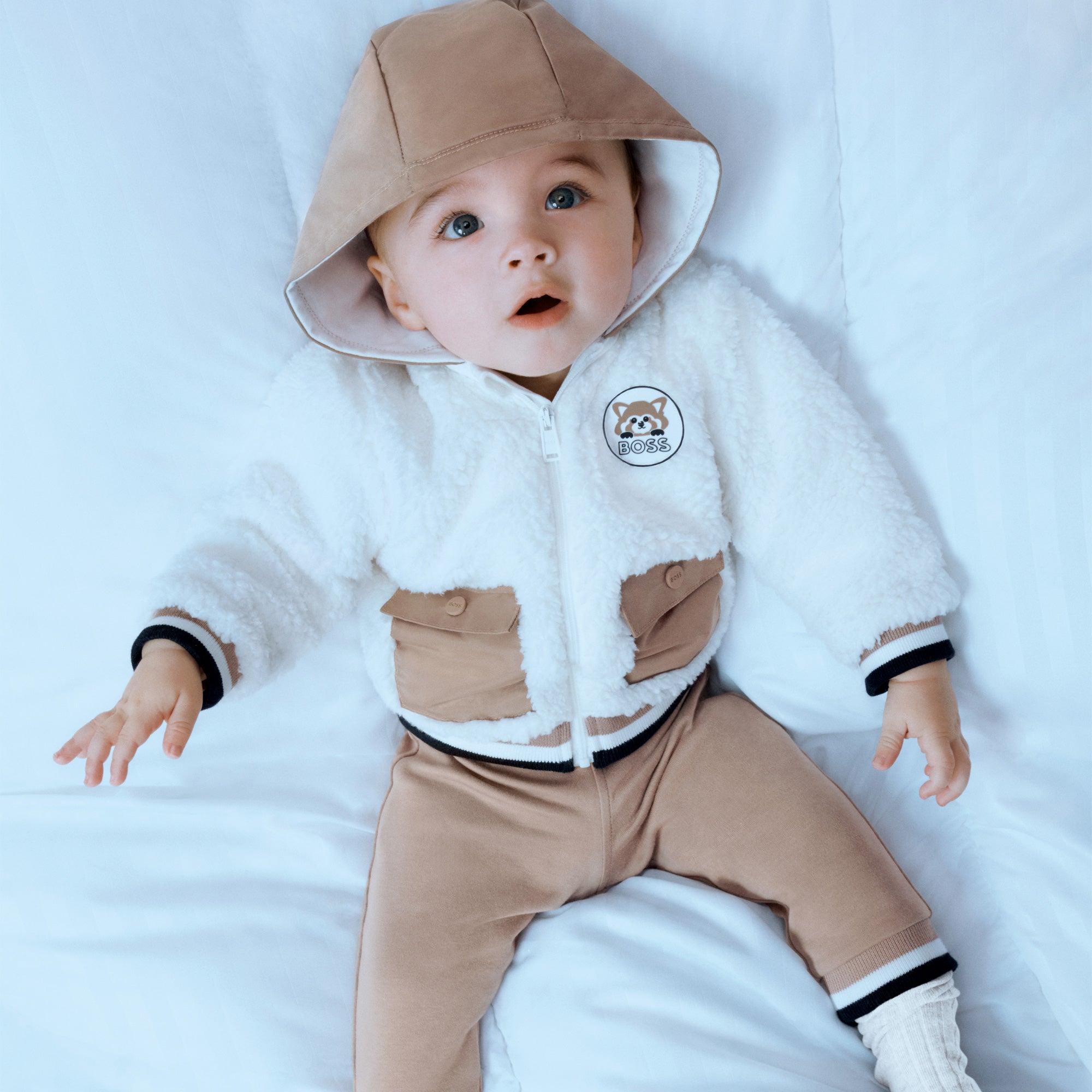 A dark beige and ivory tracksuit for baby boys by BOSS, with stretchy ribbed trims in the label's signature tricolour stripes. Made from super soft and cosy fleece with a lightweight jersey lining, the long-sleeved zip-up top has a smooth twill hood and matching popper-fastened flap pockets on the front. It has a red panda rubberised logo patch on the chest for a distinctive look. The coordinating joggers have a comfortable elasticated waist and a branded tab on one side seam.