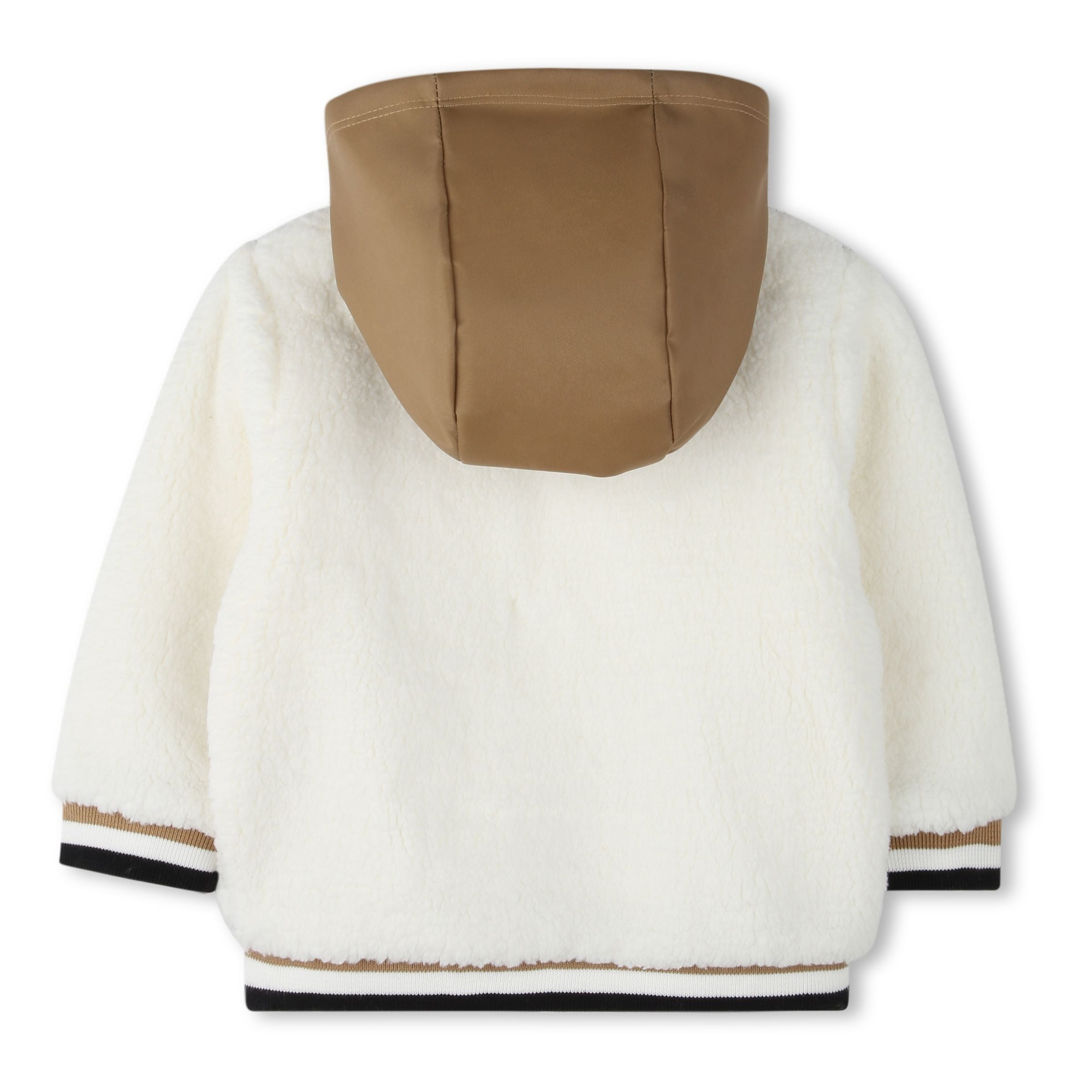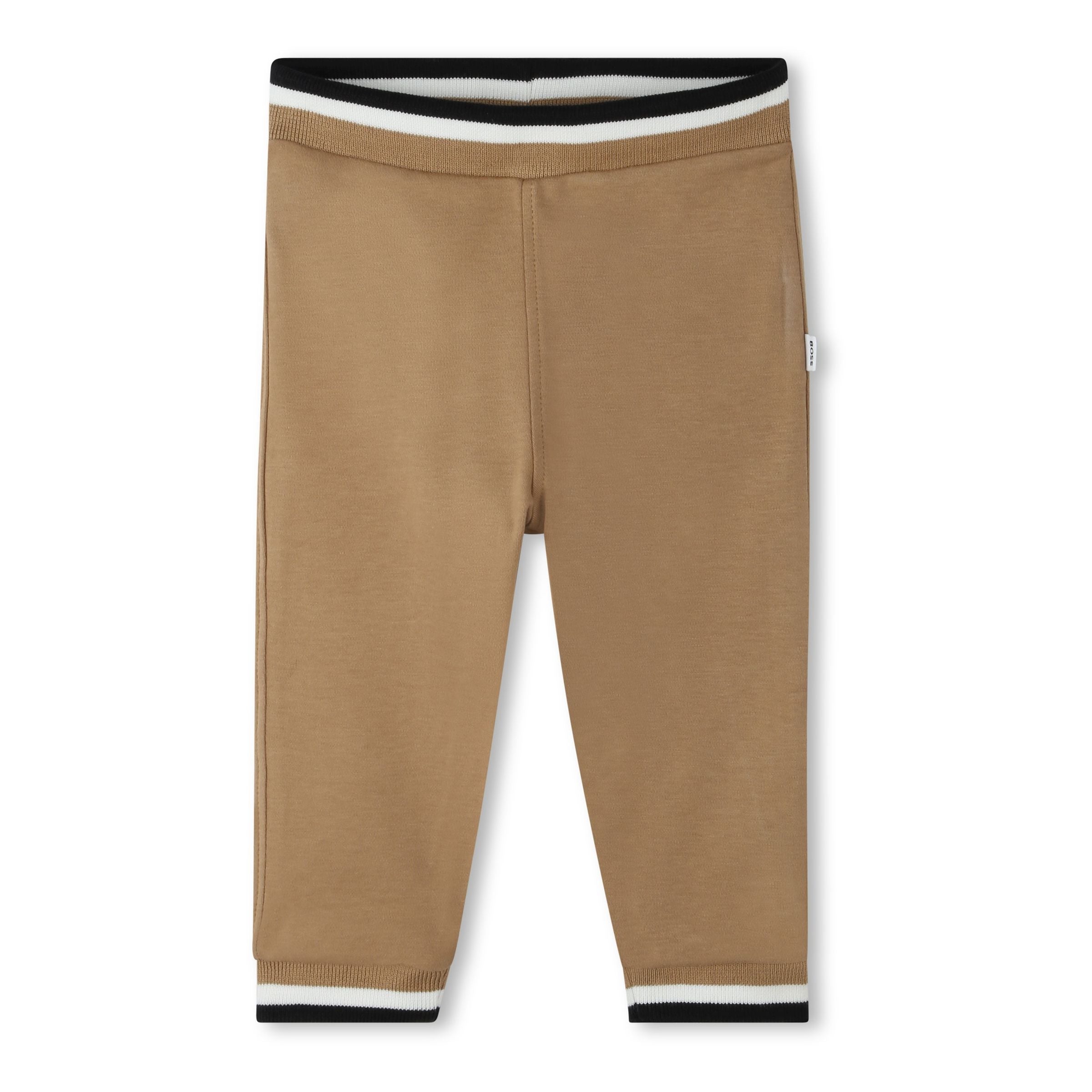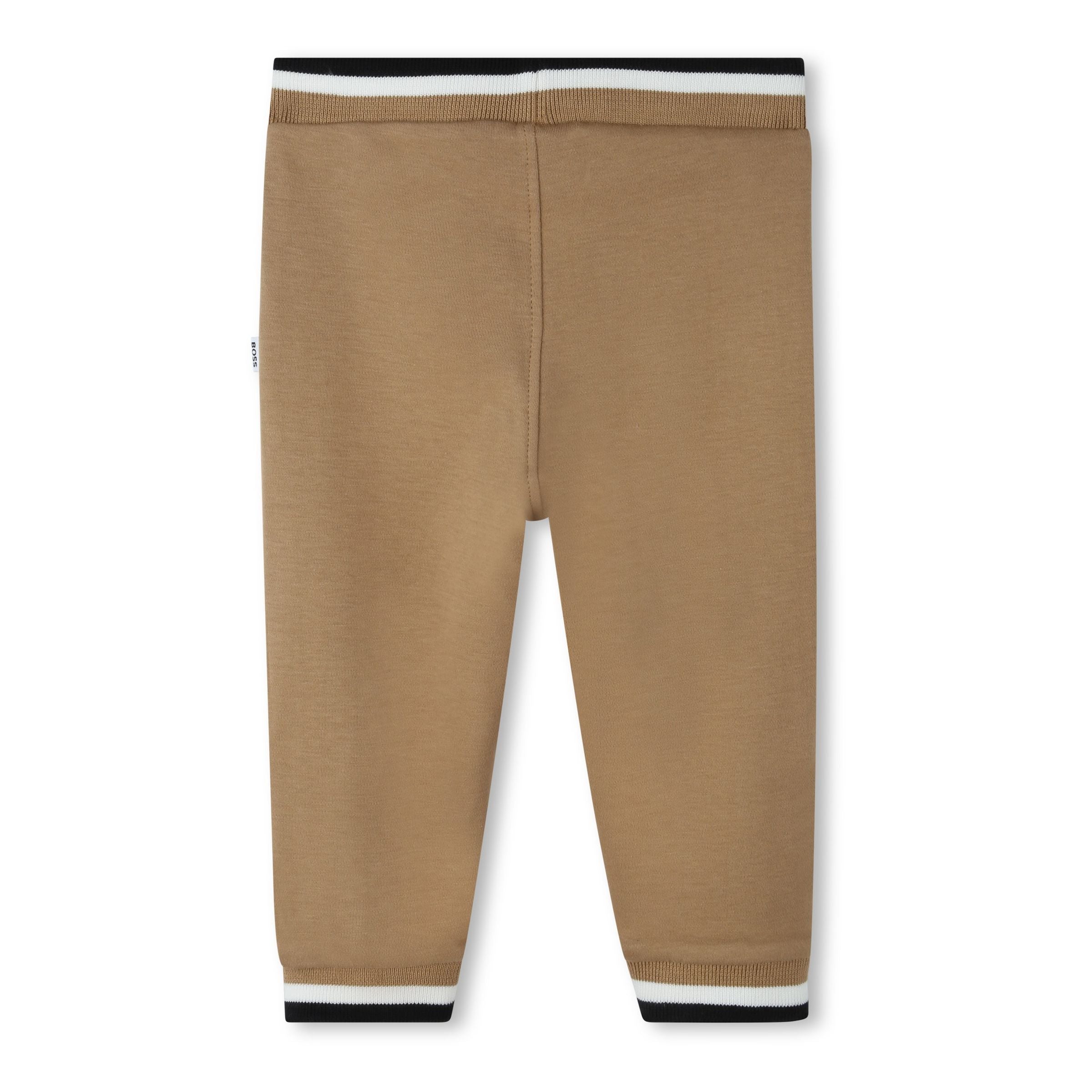 A dark beige and ivory tracksuit for baby boys by BOSS, with stretchy ribbed trims in the label's signature tricolour stripes. Made from super soft and cosy fleece with a lightweight jersey lining, the long-sleeved zip-up top has a smooth twill hood and matching popper-fastened flap pockets on the front. It has a red panda rubberised logo patch on the chest for a distinctive look. The coordinating joggers have a comfortable elasticated waist and a branded tab on one side seam.