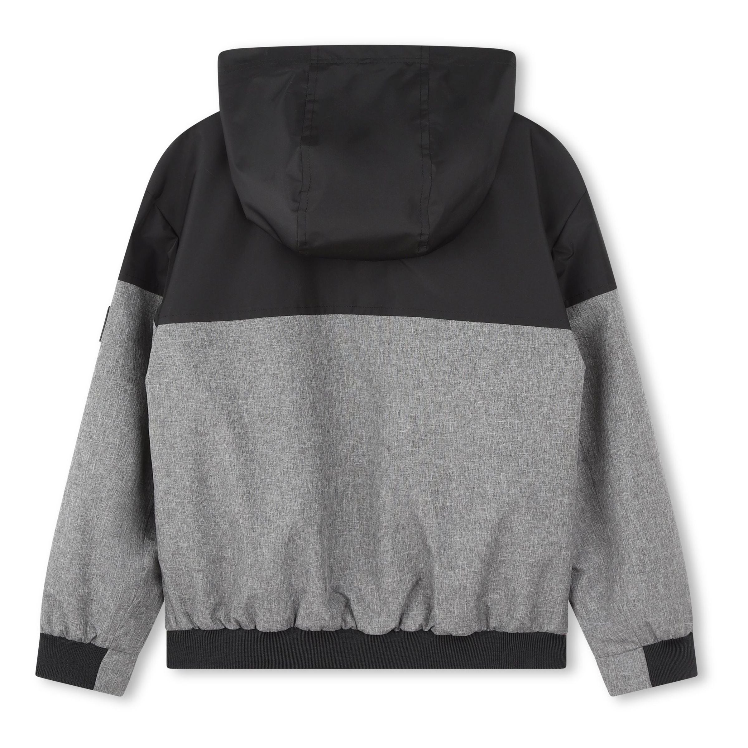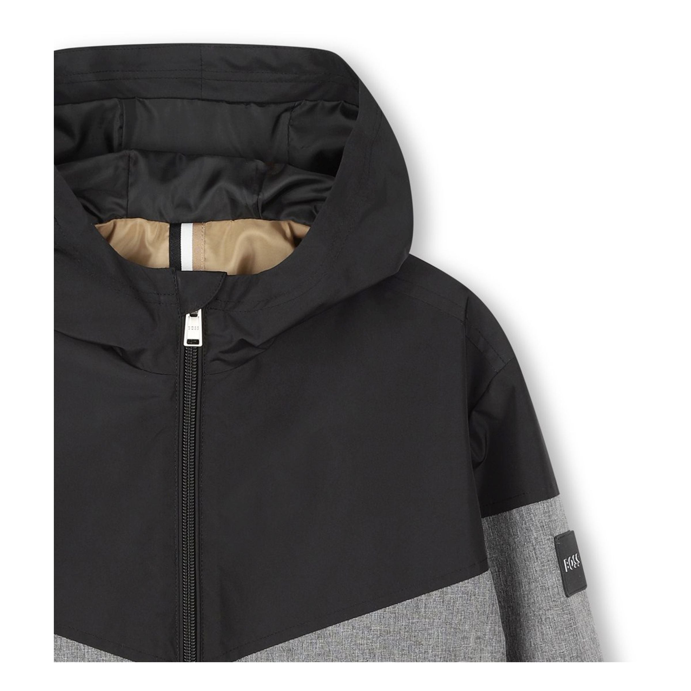 A black and grey zip-up windbreaker jacket for boys by BOSS, with a fixed hood. Made in a silky weave, this stylish and practical jacket helps keep him dry thanks to its water-repellent treatment. The ribbed, elasticated cuffs and hem provide added protection from the elements, and there are useful front pockets, secured with zips. For subtle brand recognition, there is a rubberised logo patch on one sleeve and a tri-colour tab on the back and inside of the neck in the label's signature colourway of beige, white and black. The jacket has a lightweight satin lining for comfort.