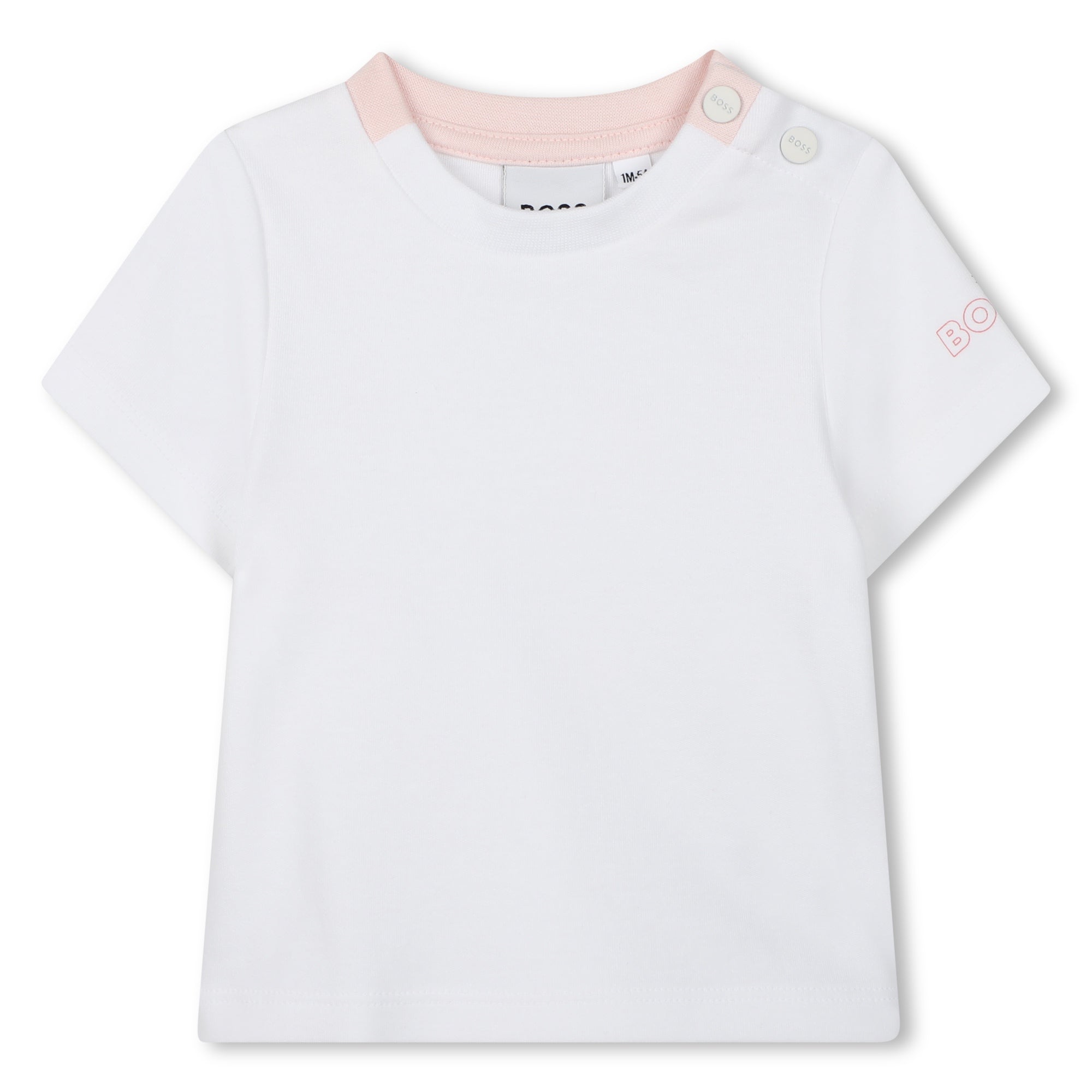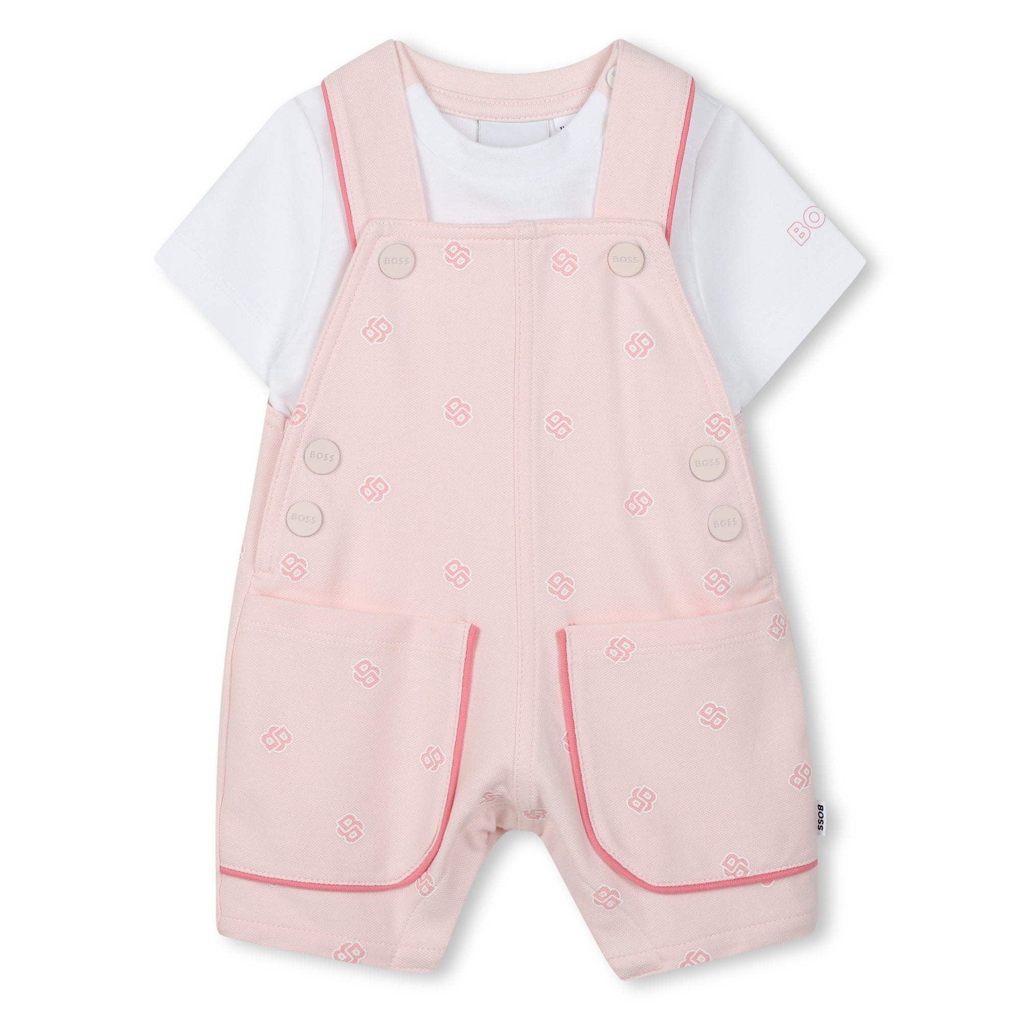 The Pale Pink Dungarees T-Shirt Set by BOSS offers a sweet, stylish outfit perfect for any casual day. The set features soft pale pink dungarees paired with a coordinating T-shirt, creating a comfortable, breathable ensemble. The adjustable straps on the dungarees ensure a secure, customizable fit, while the soft fabric keeps your little one comfortable all day long. Ideal for playdates or casual outings, this set combines ease and style with a playful, feminine touch.