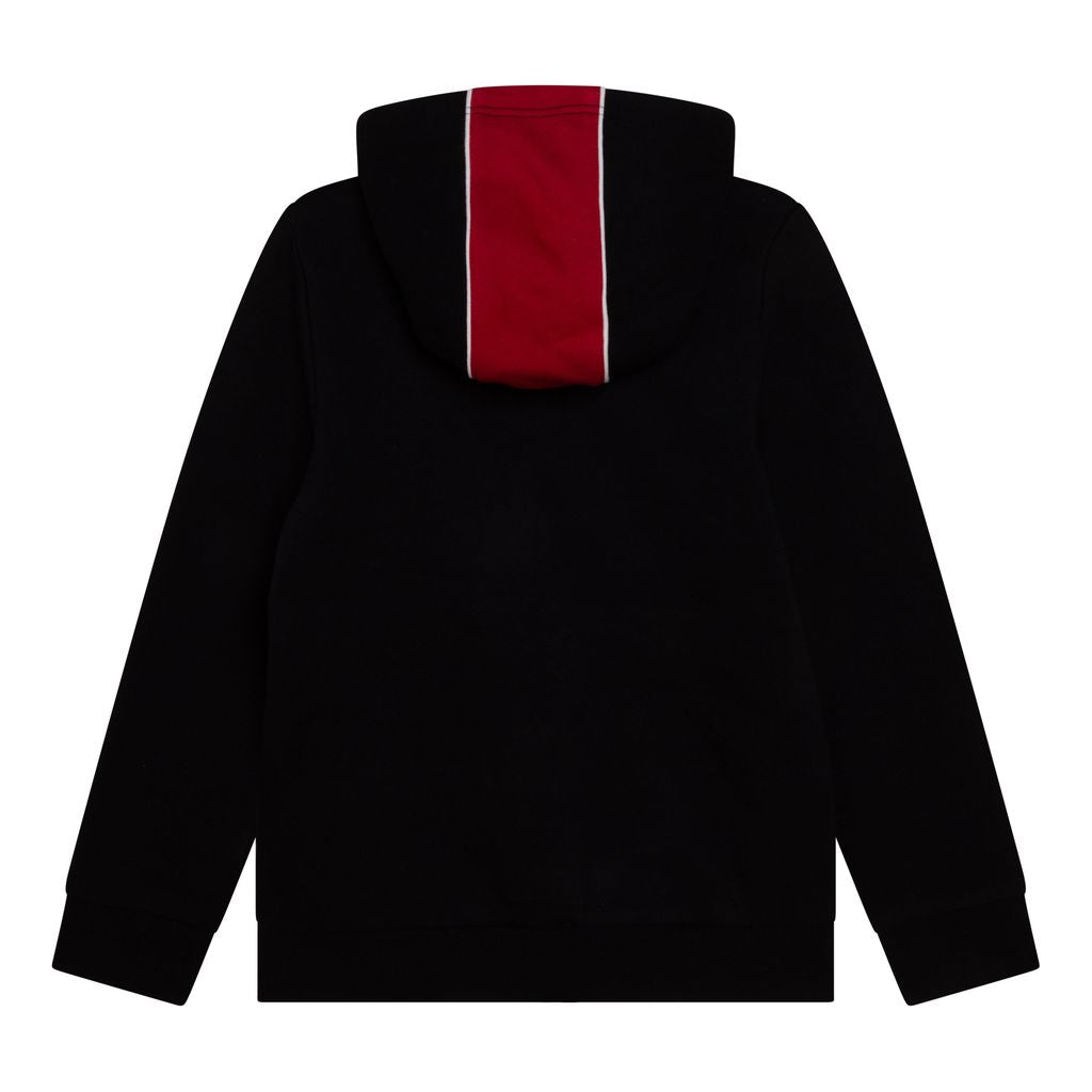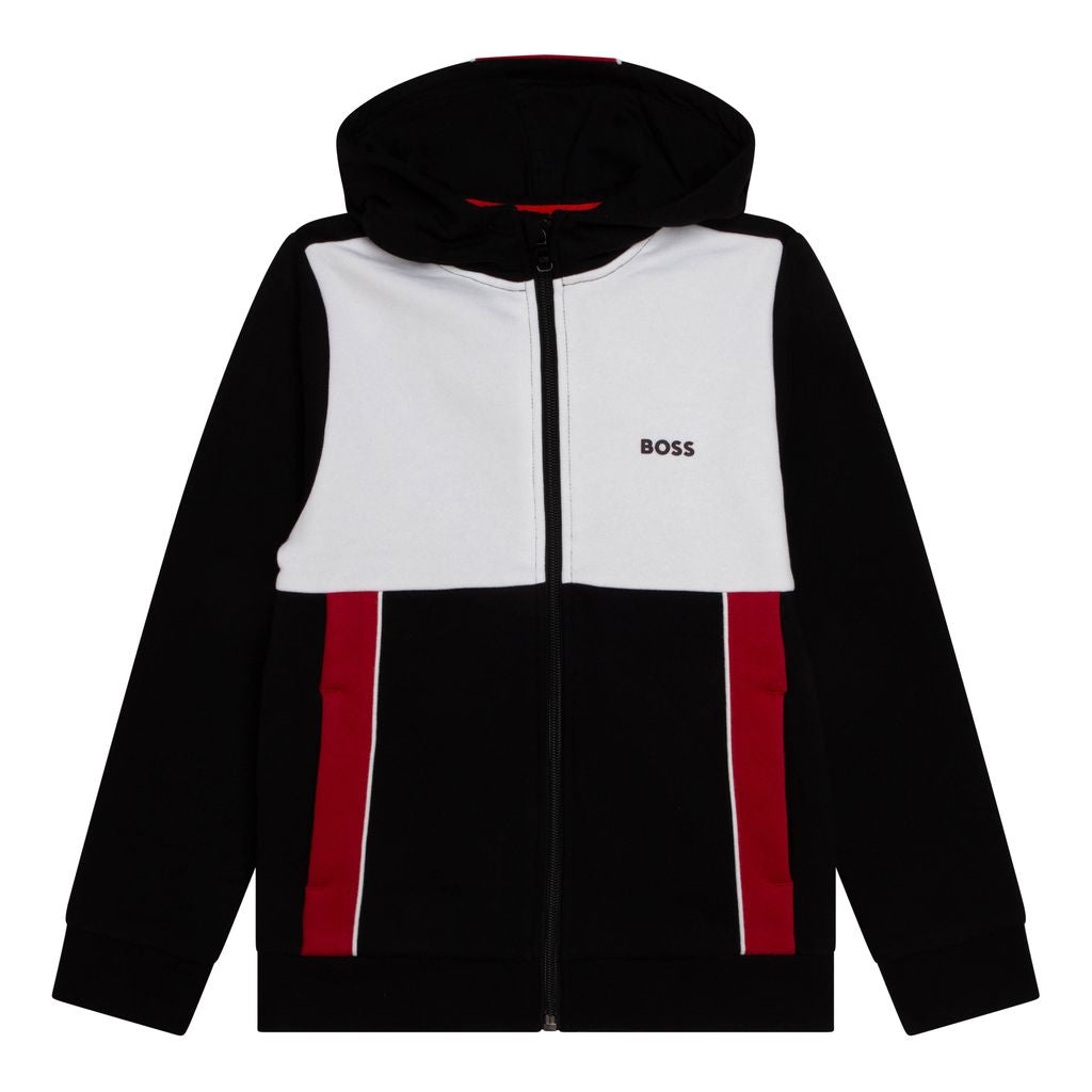 A dynamic layering piece with sporty appeal, this zip-up hoodie features a striking colorblock design in black, white, and red. The contrast panels and clean lines bring modern energy, while the tonal logo embroidery adds a subtle brand touch. Crafted for comfort and movement, it’s a versatile choice for everyday wear or active outings.