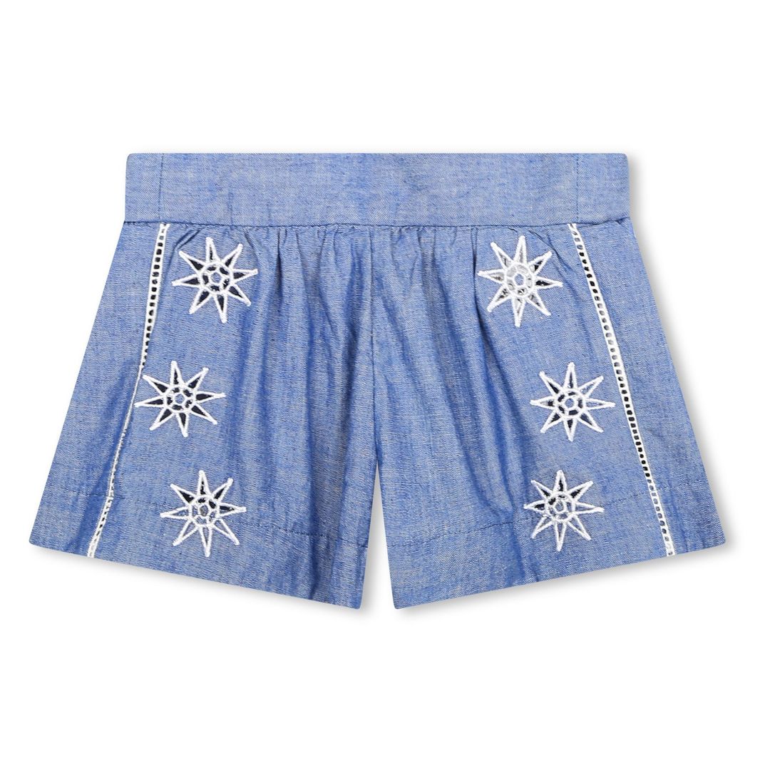 A breezy staple with a touch of charm, these blue chambray shorts feature delicate white starburst embroidery and lace-trimmed side seams. The gathered waistband ensures comfort and ease, while the symmetrical motifs add a playful yet refined accent. Perfect for sunny days and casual outings, they pair effortlessly with cotton tops or lightweight blouses.