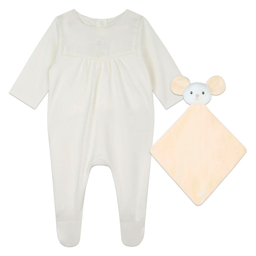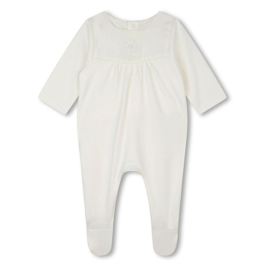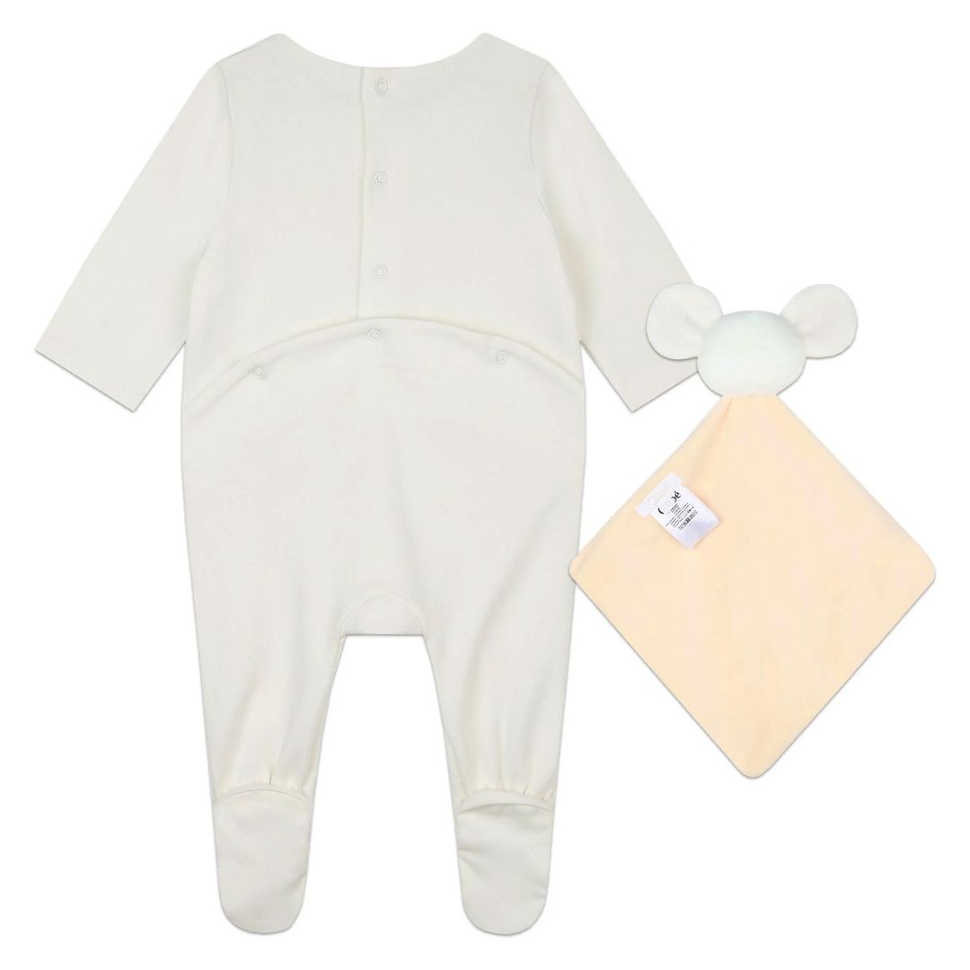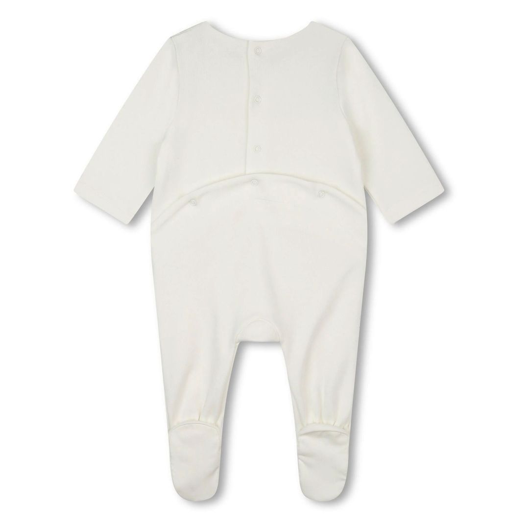 Indulge your baby girl in unparalleled comfort and contemporary style with the Ivory Embroidered Babygrows Toy Set. Crafted from 100% organic cotton in a sophisticated ivory finish, these pajamas epitomize luxury and sustainability. The innovative design features convenient openings and meticulous front logo embroidery, adding a touch of understated elegance. With a cozy crew neck and long sleeves for warmth, these pajamas are designed for snug evenings at home.
