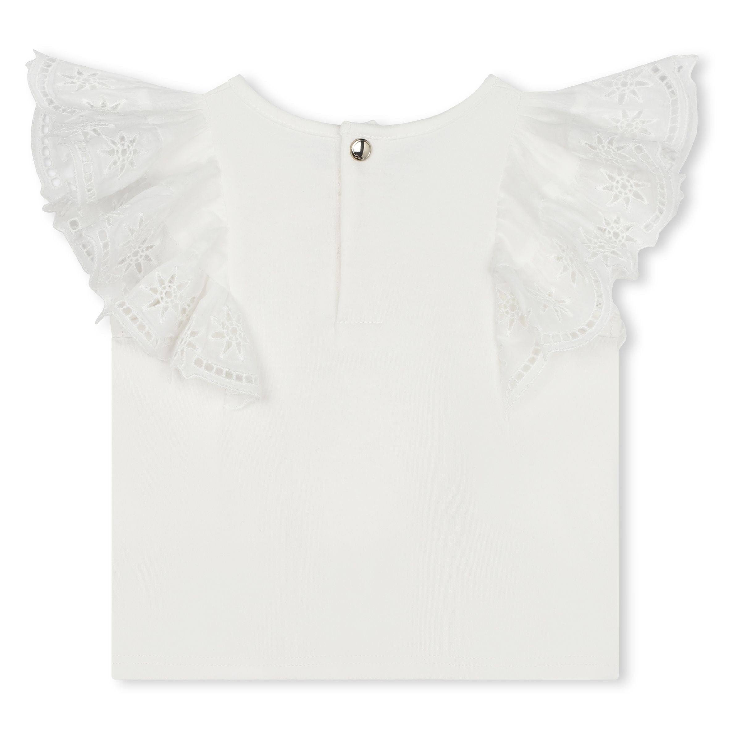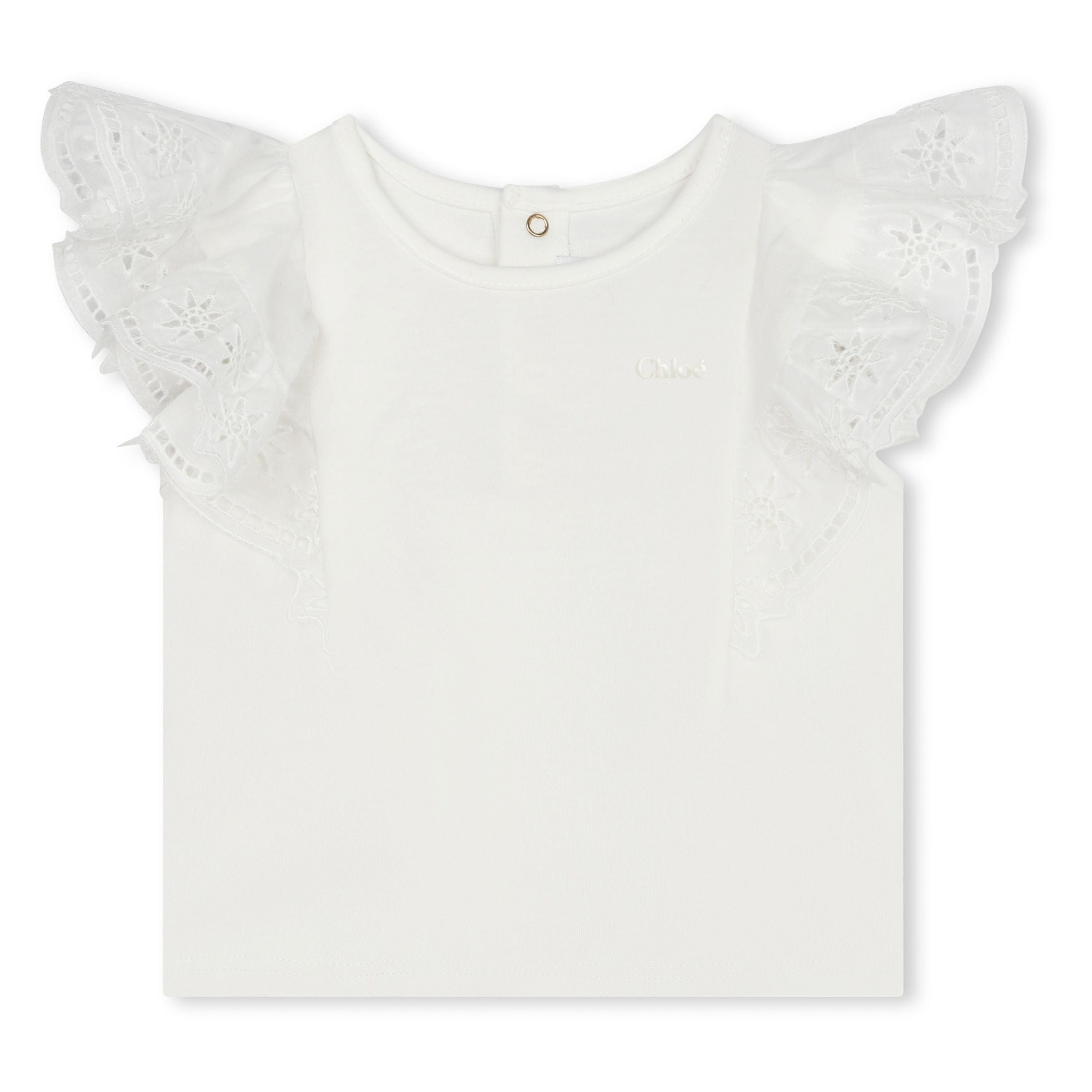 Delicate and timeless, this ivory cotton blouse is defined by its sheer lace ruffle sleeves with floral embroidery and eyelet detailing. A subtle logo embroidery at the chest adds a discreet brand signature, while the round neckline and back button closure ensure comfort and ease. Ideal for layering or standalone wear, it’s a versatile piece for elevated everyday dressing.