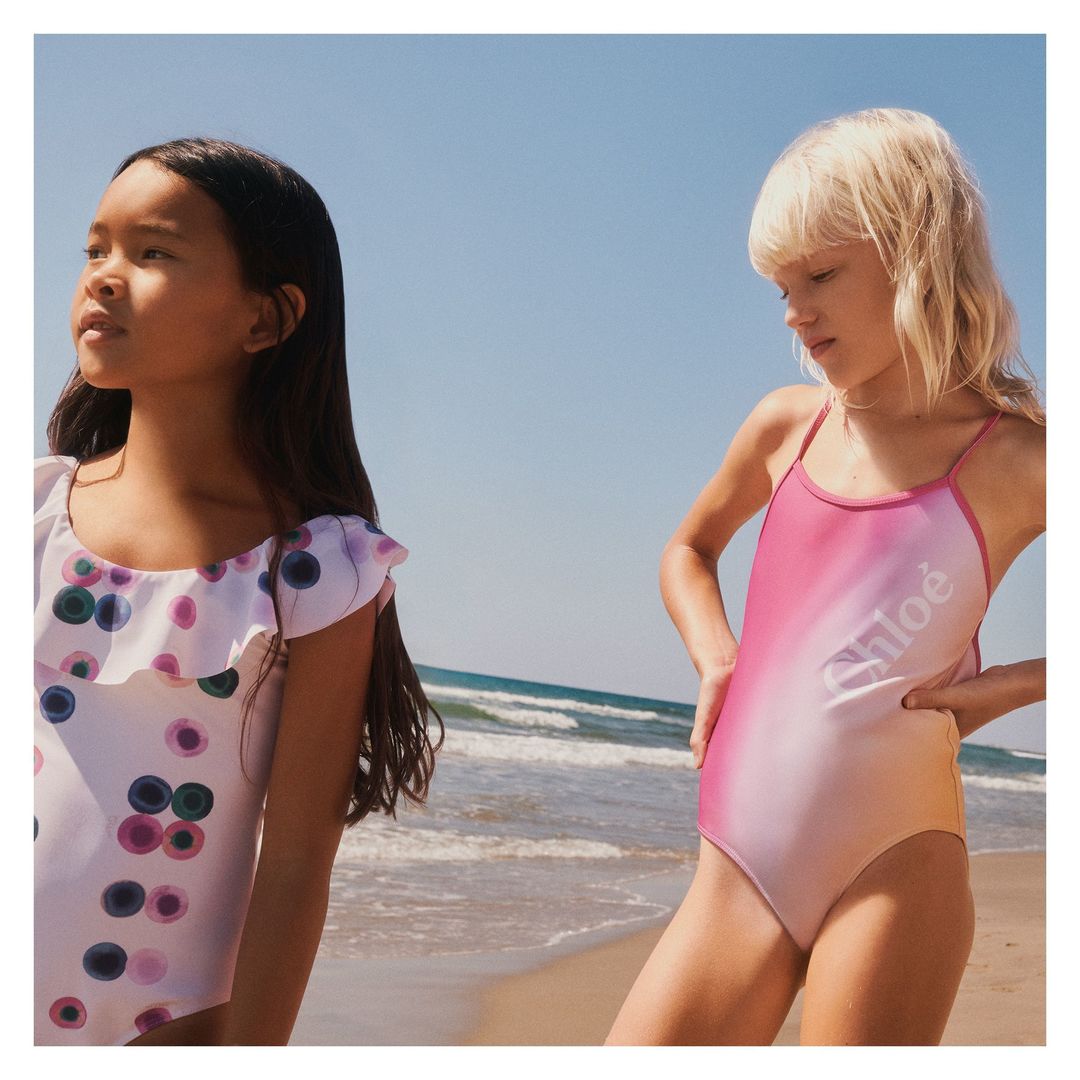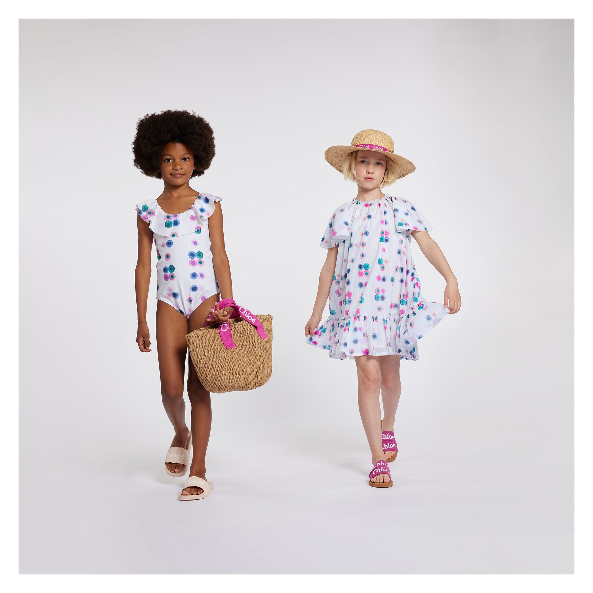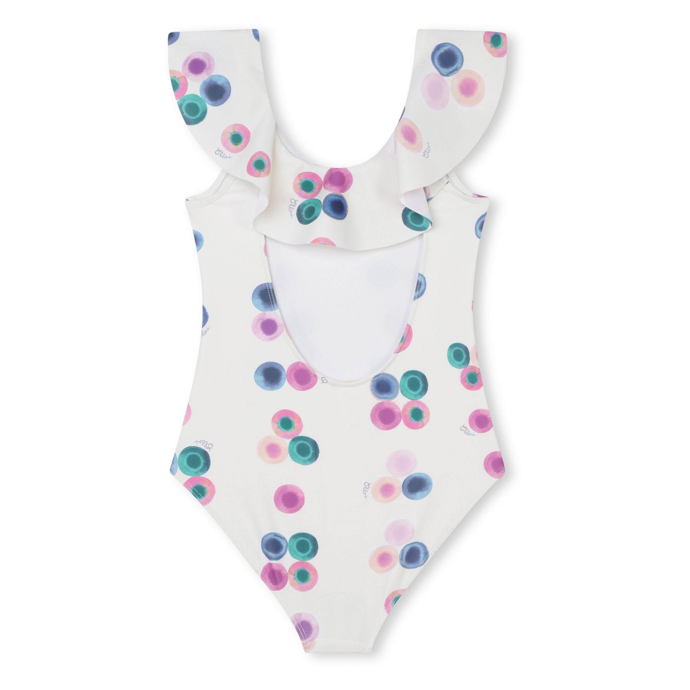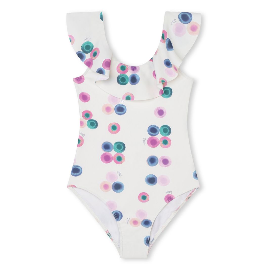 A vibrant swimwear essential, this white one-piece is playfully adorned with pastel polka dots and a sweeping ruffle detail that curves from shoulder to chest. The scoop neckline and classic leg cut offer comfort and ease, while the multicolor palette brings a joyful touch to sunny days. Perfect for poolside play or beach outings, it’s a standout piece for warm-weather wardrobes.