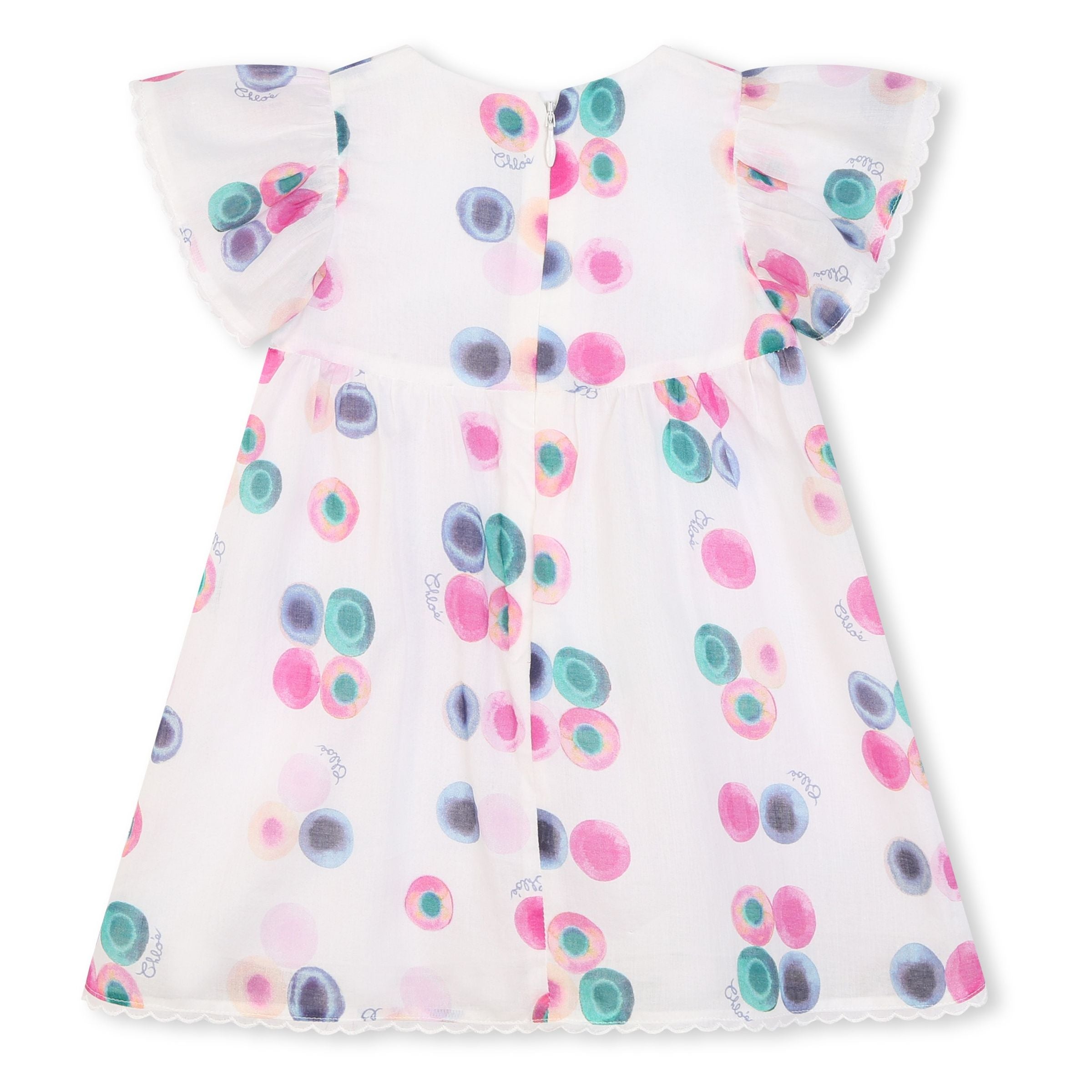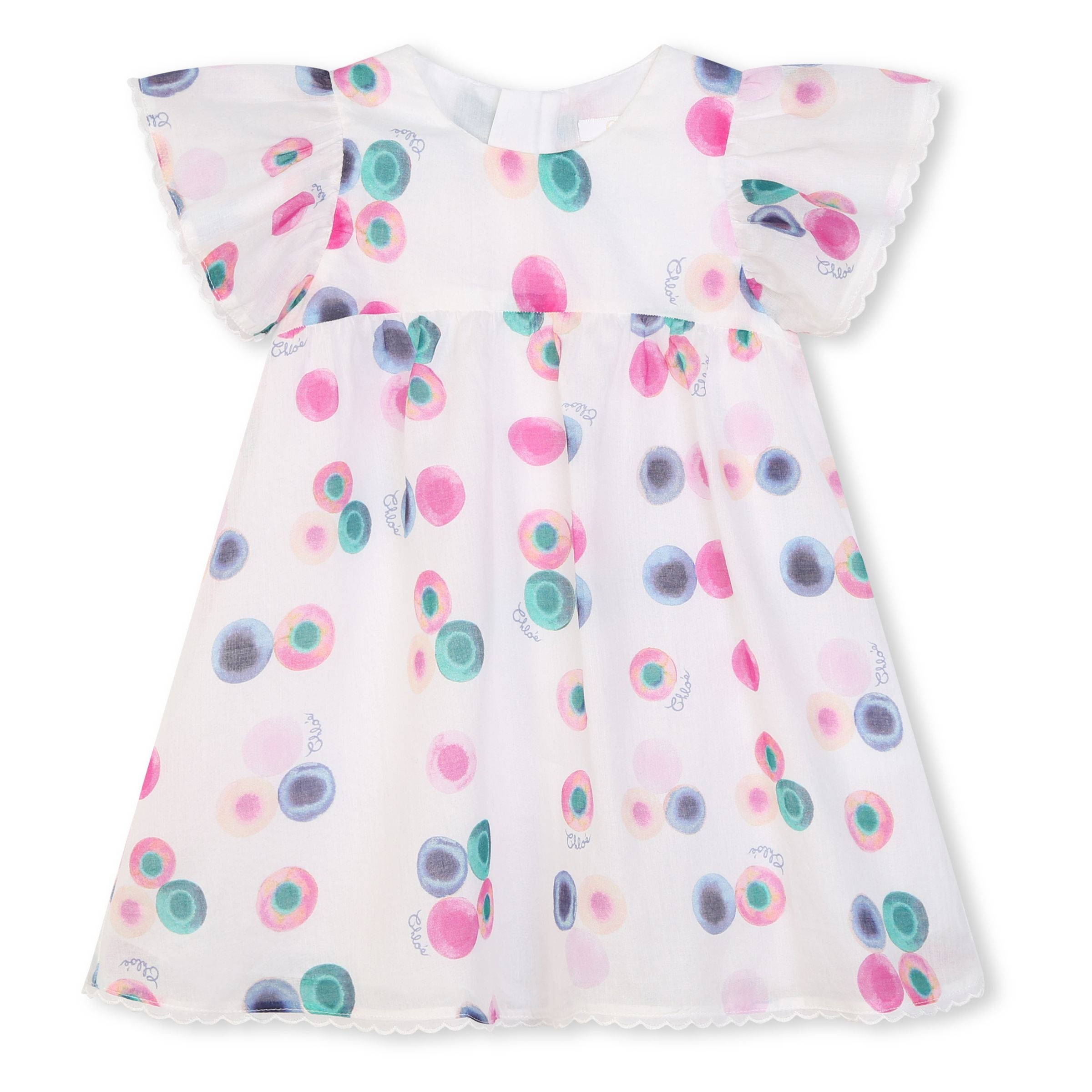 A light and airy dress designed to delight, this multicolored patterned piece features a playful polka dot motif across a sheer white base. Flutter sleeves with scalloped edges lend a whimsical finish, while the gathered waistline creates a gentle flare for ease of movement. Perfect for festive gatherings or sunny day outings, it’s a joyful addition to any warm-weather wardrobe.