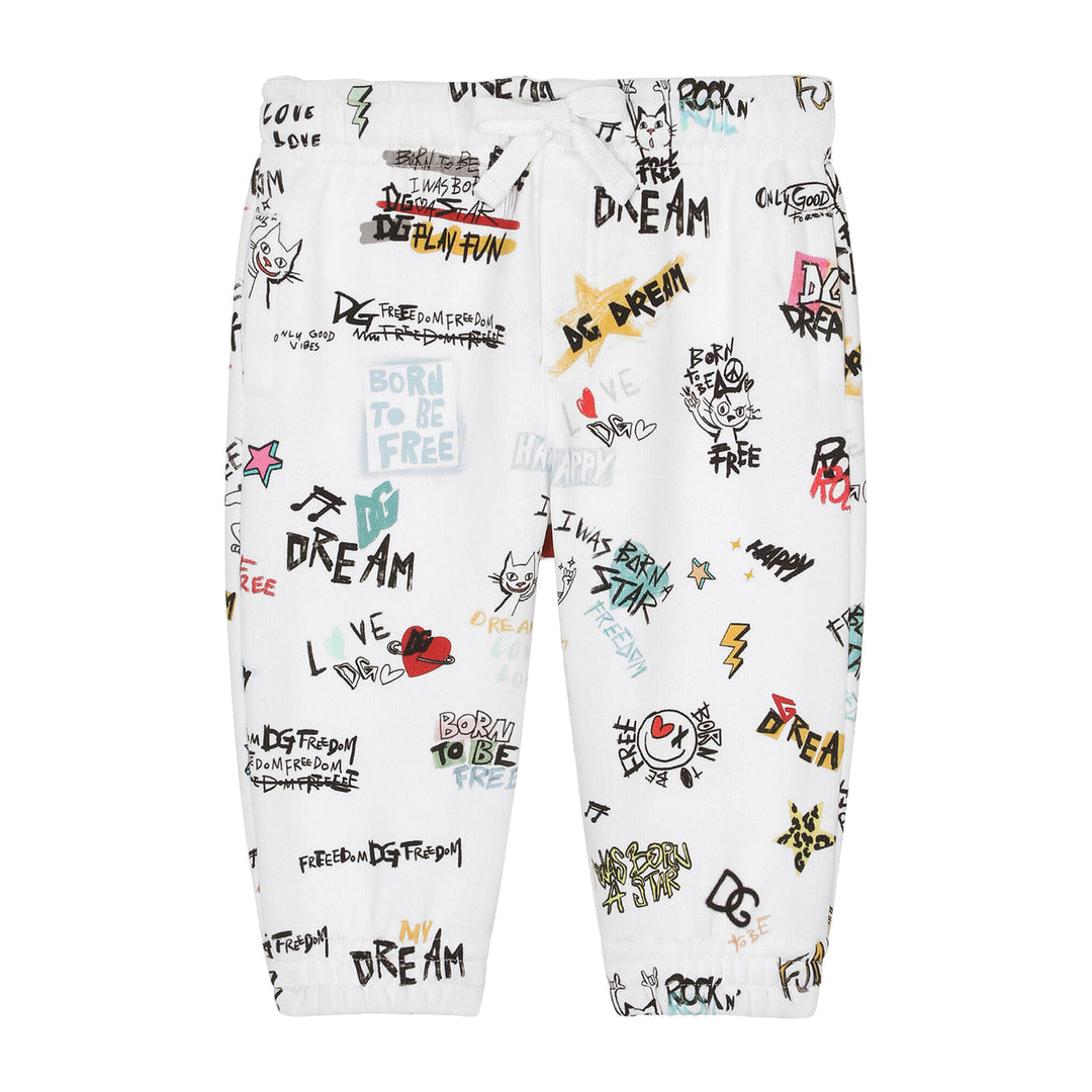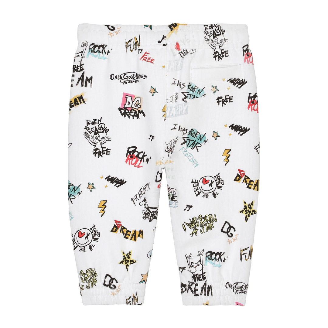 White All-Over Print Pants burst with creativity and movement. Covered in graffiti-style text and doodles—from “DREAM” and “LOVE” to stars and cartoon faces—this soft cotton silhouette brings joyful energy to everyday edits. A standout piece for gifting or artistic capsules.