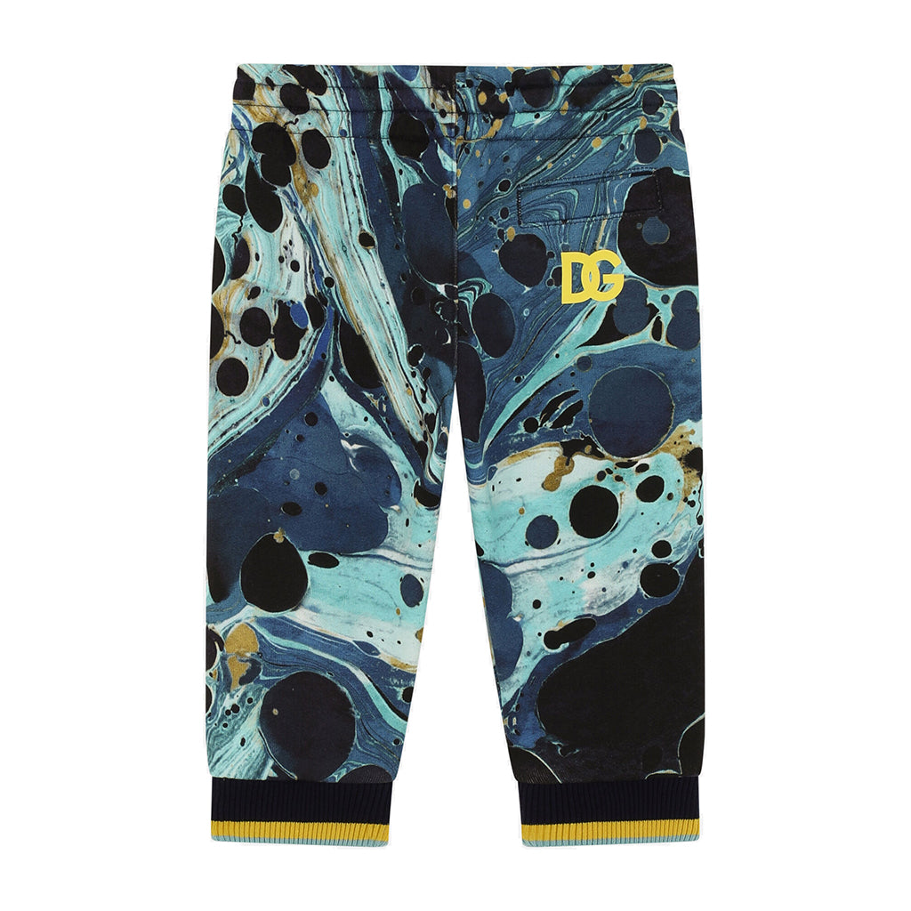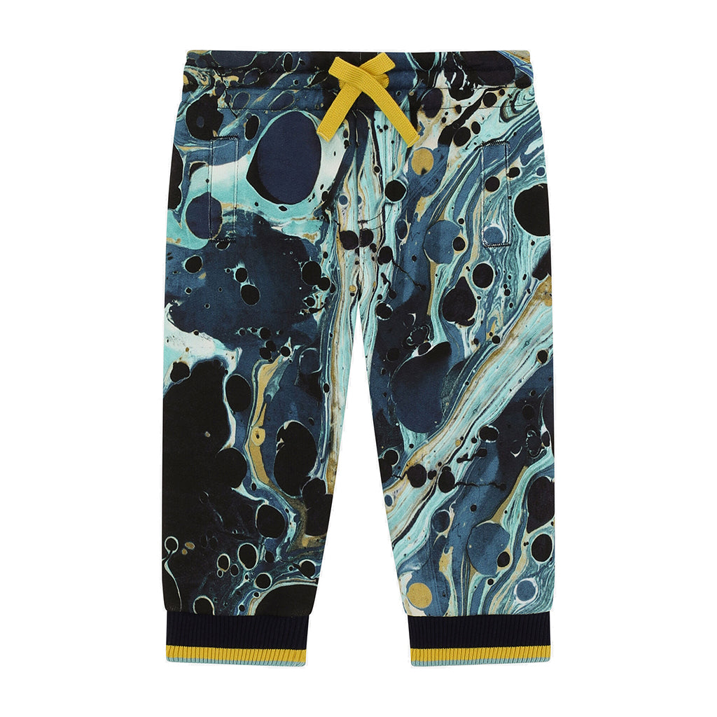 Marble Joggers bring fluid artistry to everyday wear. Featuring a swirling abstract print in blue, yellow, black, and white, this cotton silhouette is finished with striped ribbed cuffs and a yellow drawstring for a playful contrast. A standout piece for gifting or bold capsule edits.