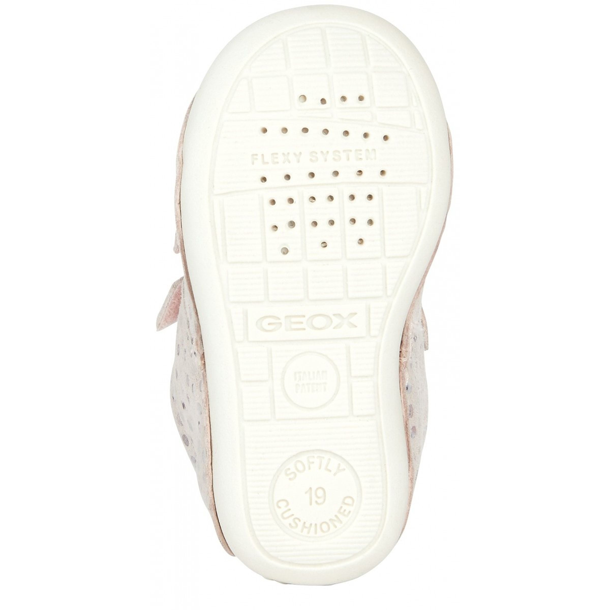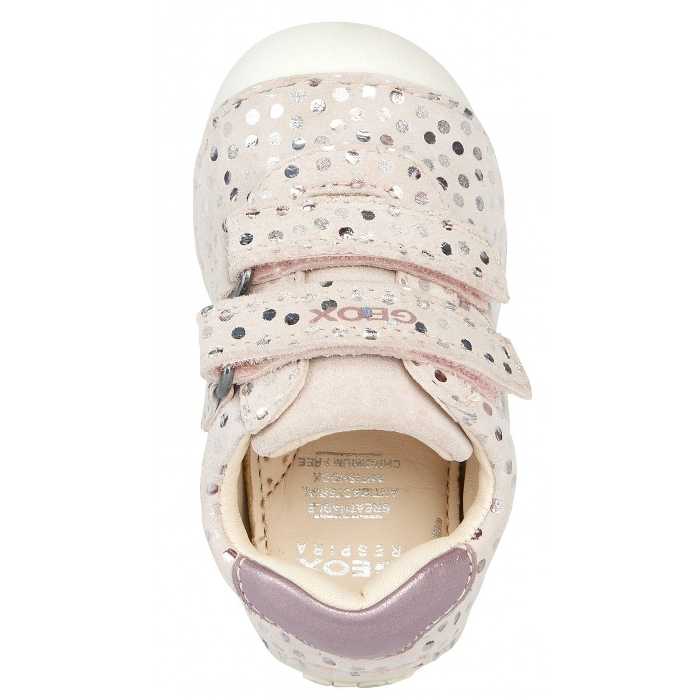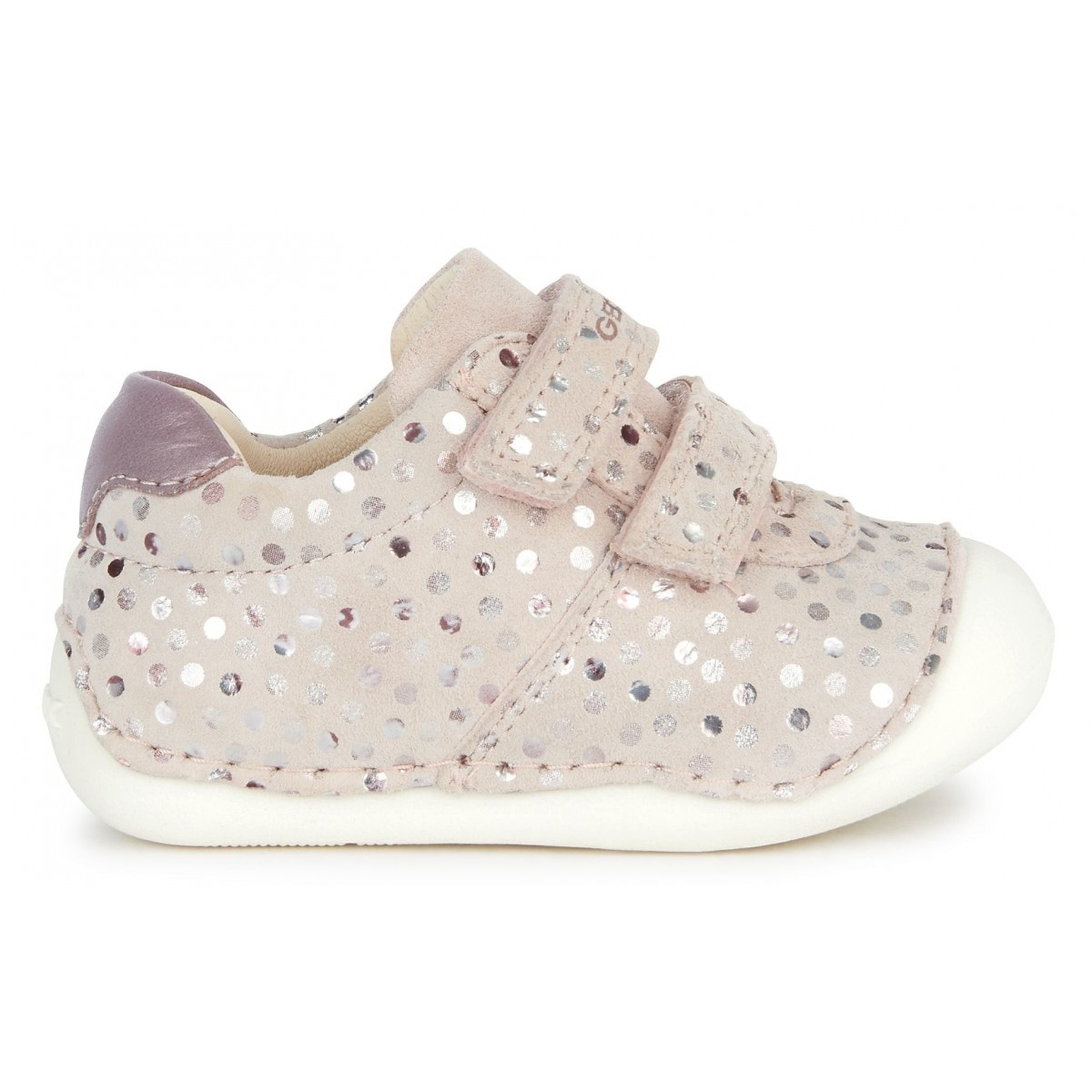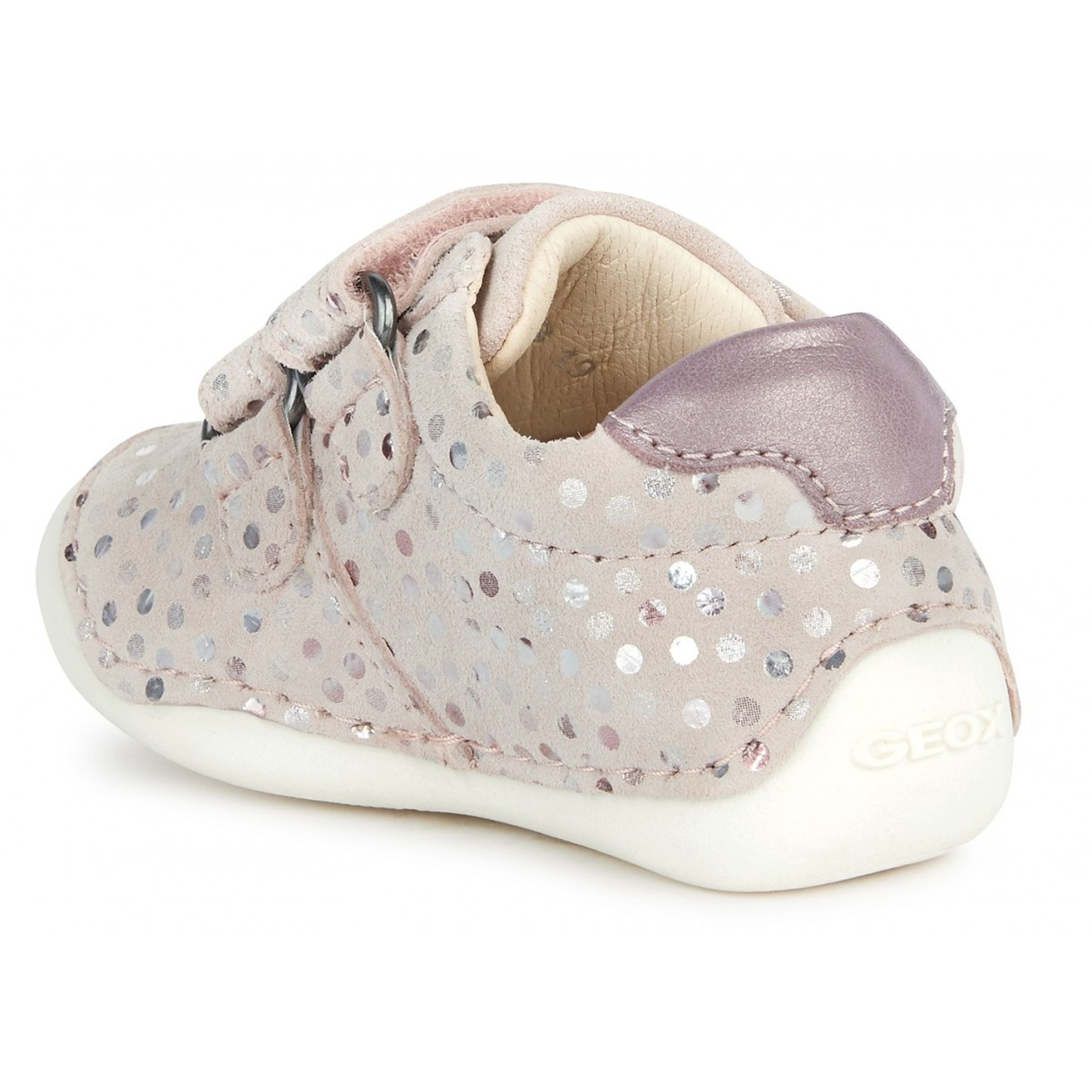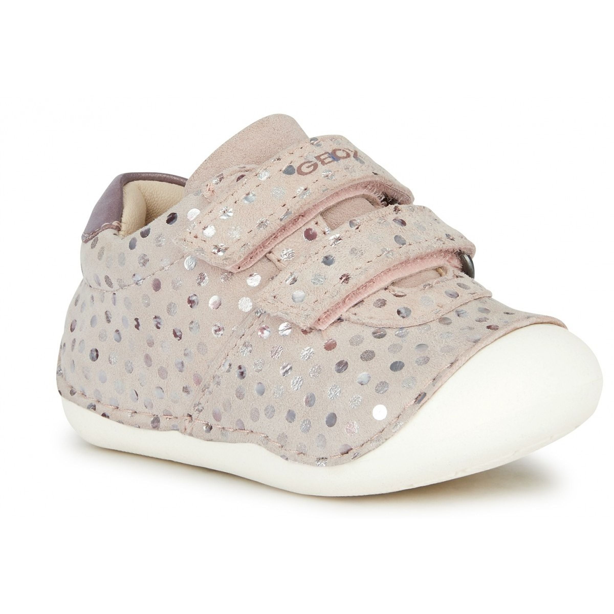 Beige Tutim polka dot velcro shoes for baby girls from Geox. Comfortable breathable shoe for newborns designed with crawling in mind. Tutim is a cosseting piece of footwear designed to keep baby girls comfortable as they begin to move around. Crafted from printed suede and a pearlescent leather-effect material, it comes in a pretty pale-pink palette which brings to the fore its lustrous beauty. Comfortable and breathable, it is completely adjustable and has a really easy foot entry.