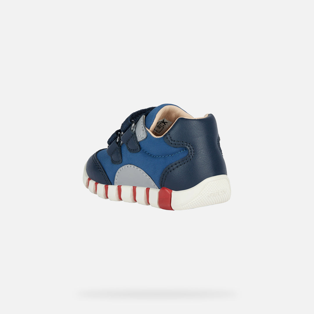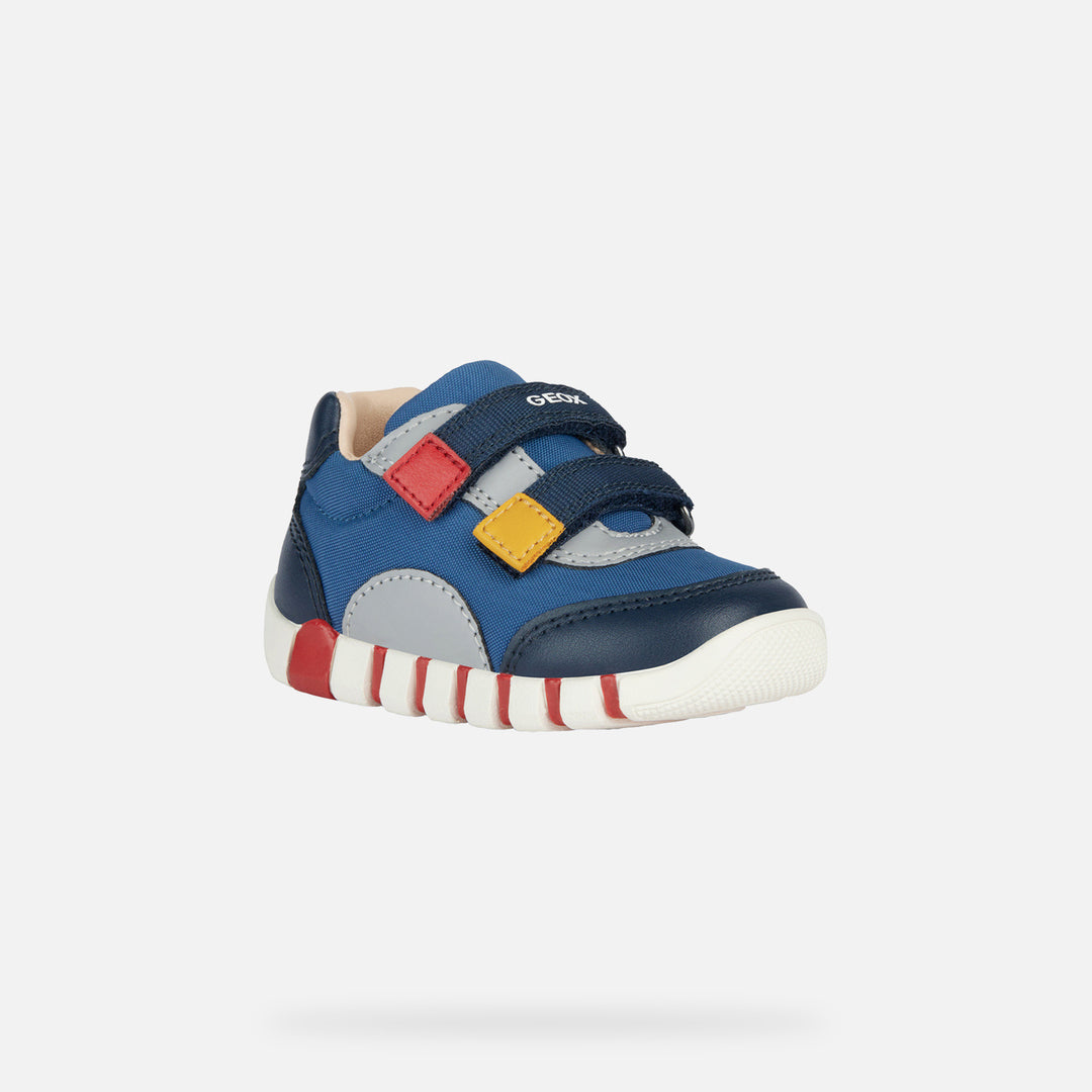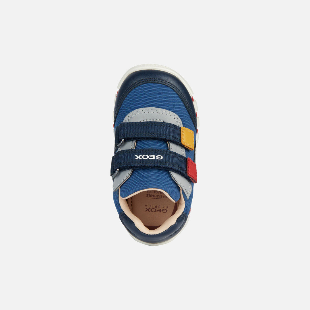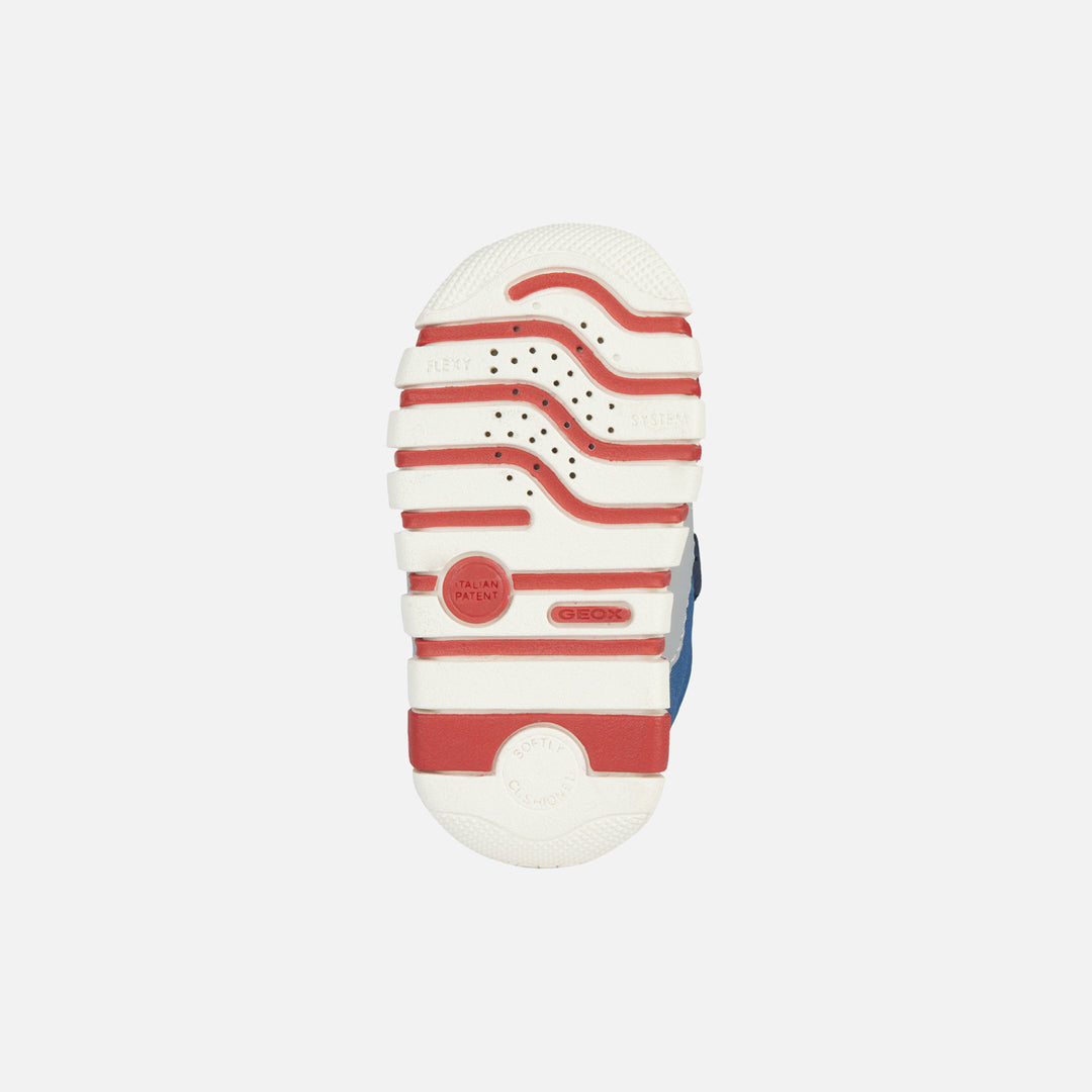 Blue Iupidoo velcro sneakers for baby boys from Geox. Baby’s cushioning breathable first-steps sneaker with an energetic active aesthetic. This attractive version in deep and navy blue has been lifted with contrasting details and will be the ultimate partner for children’s fantastic everyday adventures. With an easy foot entry, Iupidoo features a retro-style upper crafted from nylon and a leather-effect material and rests on an ultra-flexible outsole that provides little feet with the utmost comfort.