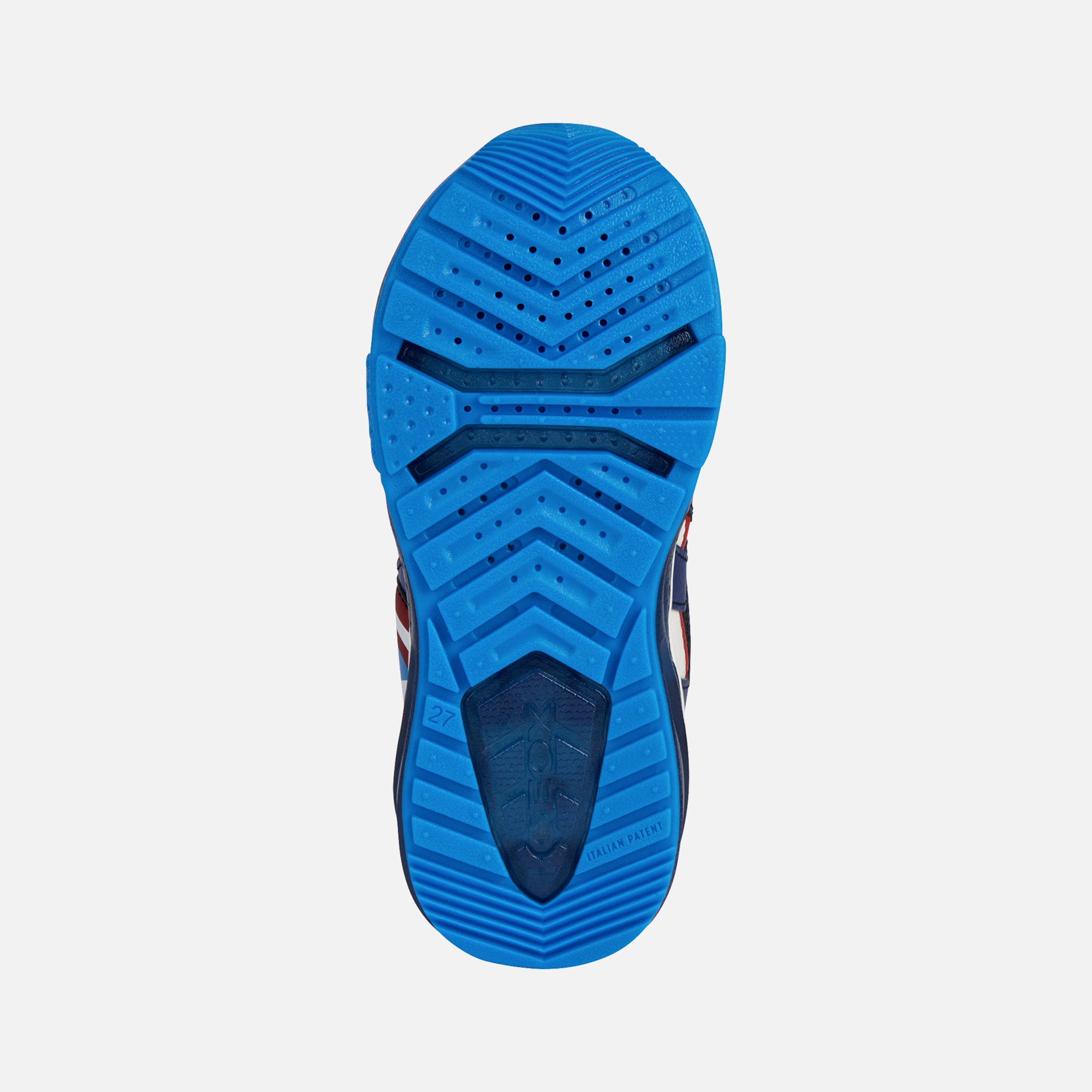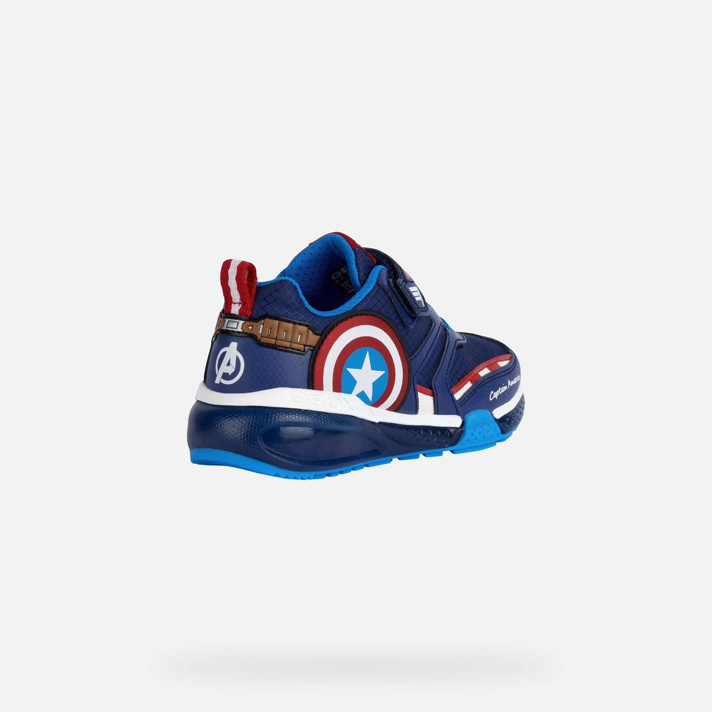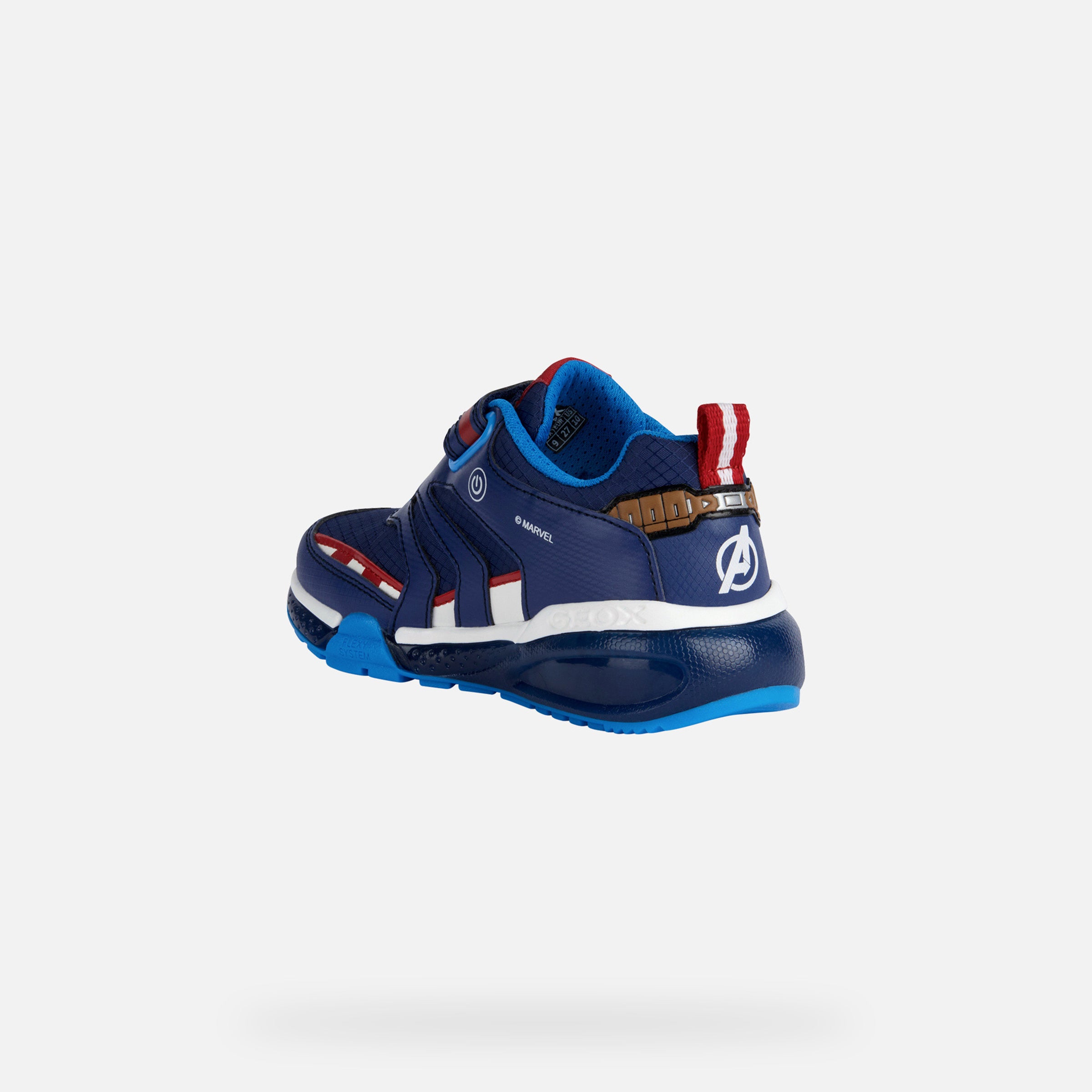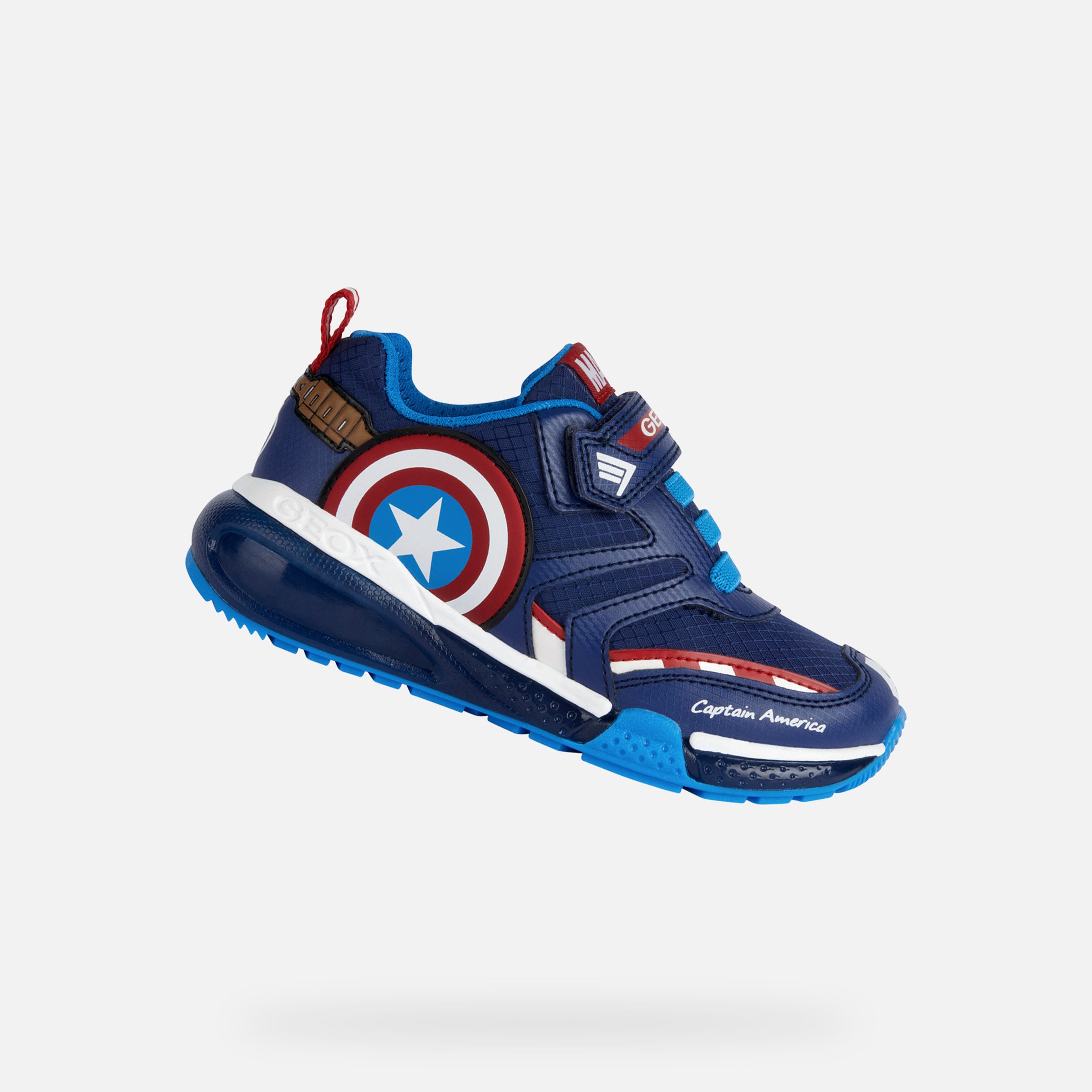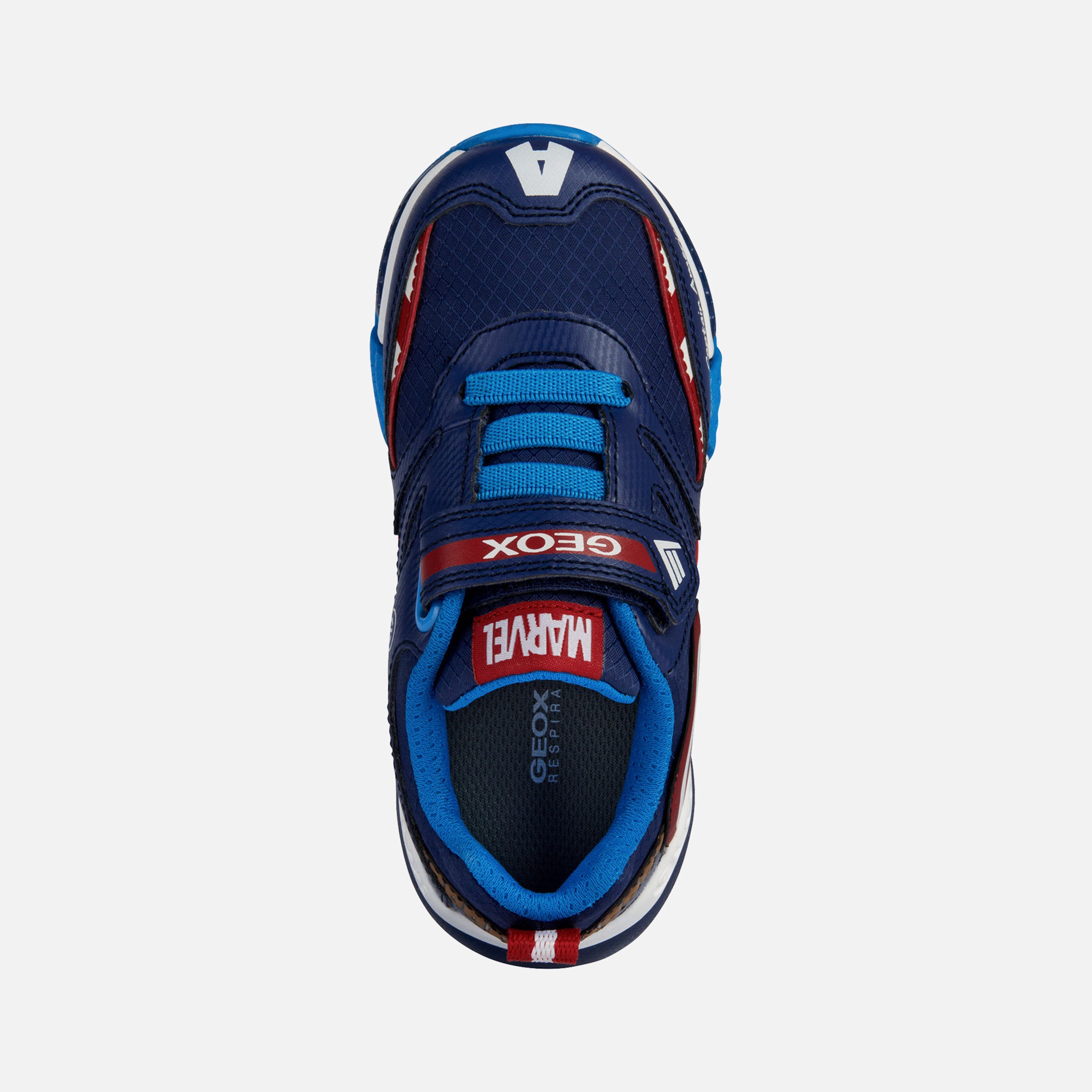Navy Bayonyc Captain America light up sneakers for kid boys from Geox. Junior sneaker with an active-looking design created under the partnership between Geox and Marvel. Bayonyc features a series of graphic designs and decorative patches depicting Captain America from the Avengers, and comes in his iconic navy-blue and red colourway. This lightweight breathable piece of footwear has been crafted from nylon and a leather-effect material, and fitted with lights in the sole that will brighten little adventurers’ paths as they take on the world with their favourite super hero.