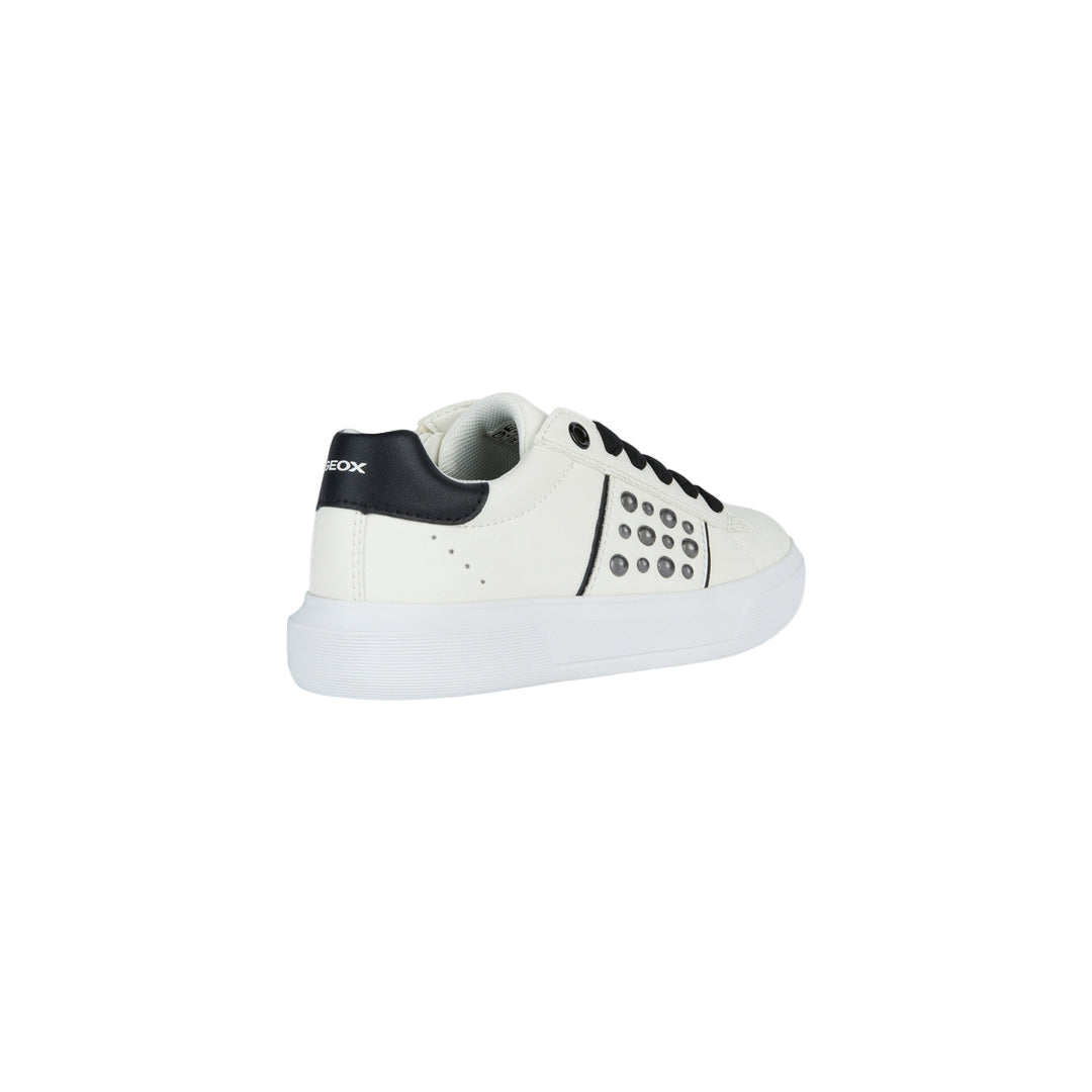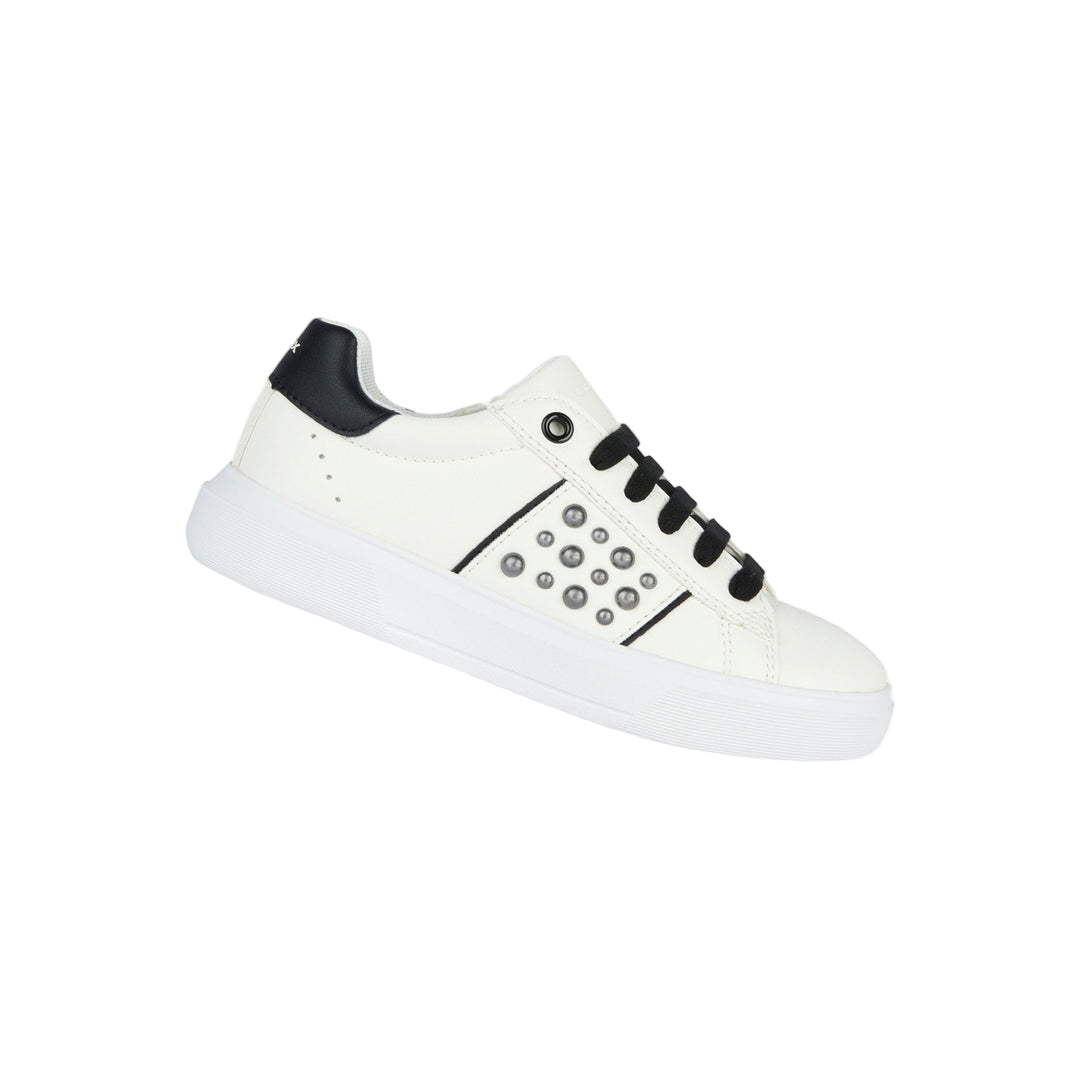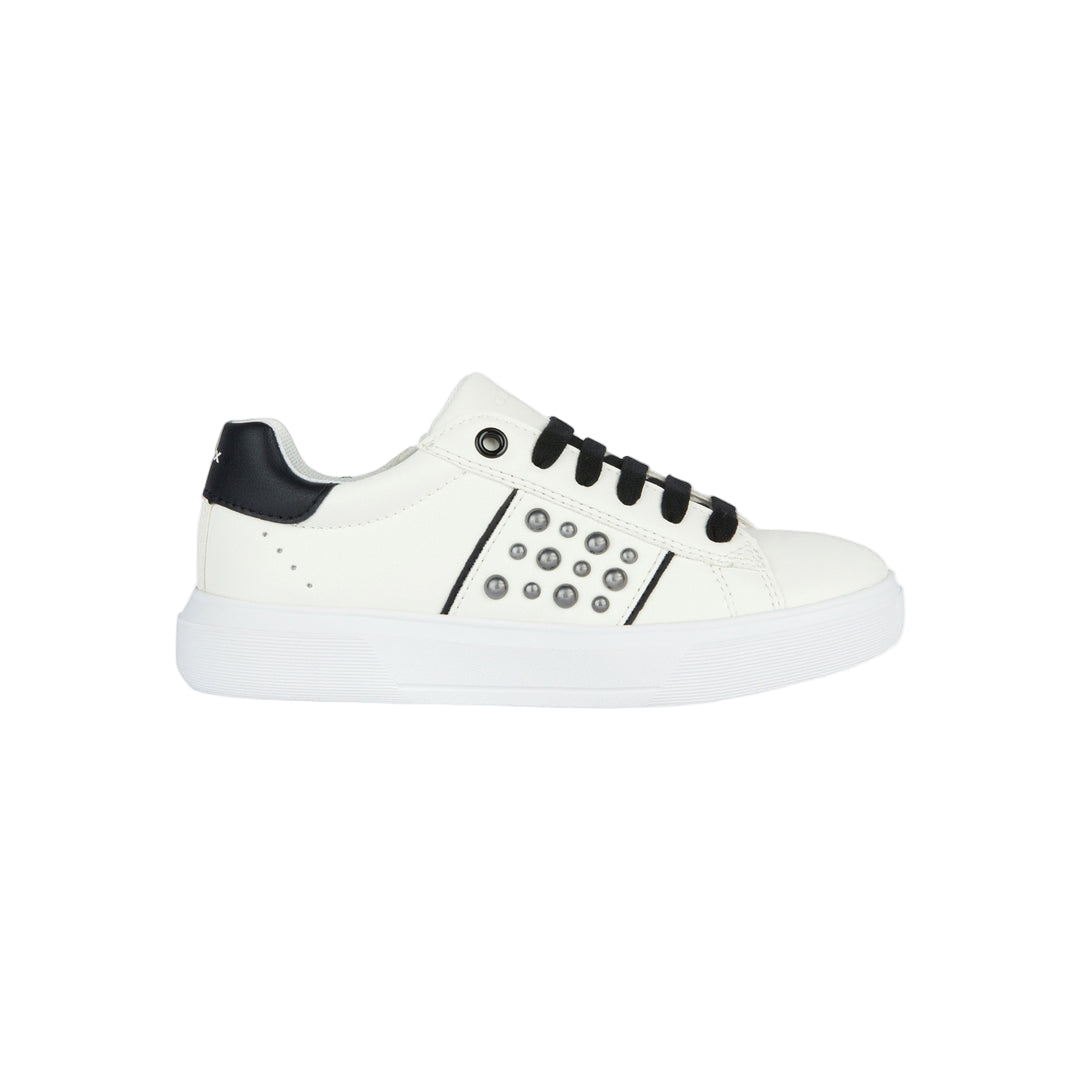 White Nettuno tab sneakers for kid girls from Geox. Girl’s low-cut sneaker with a tennis-shoe aesthetic and plenty of urban appeal. This white version of Nettuno with contrasting black details oozes on-trend modern overtones further accentuated by the gleaming studs on the upper. Breathable and comfortable, it has been crafted from a leather-effect material and will prove to be an easy match to casual dressing for schooldays or on leisuretime occasions.