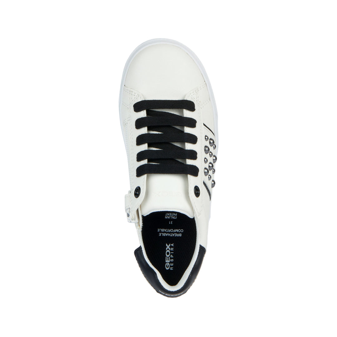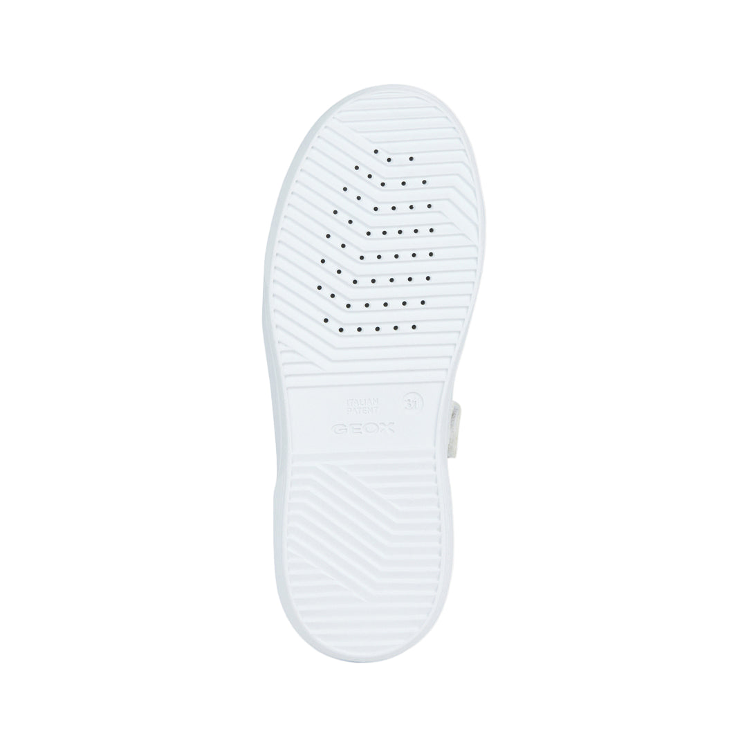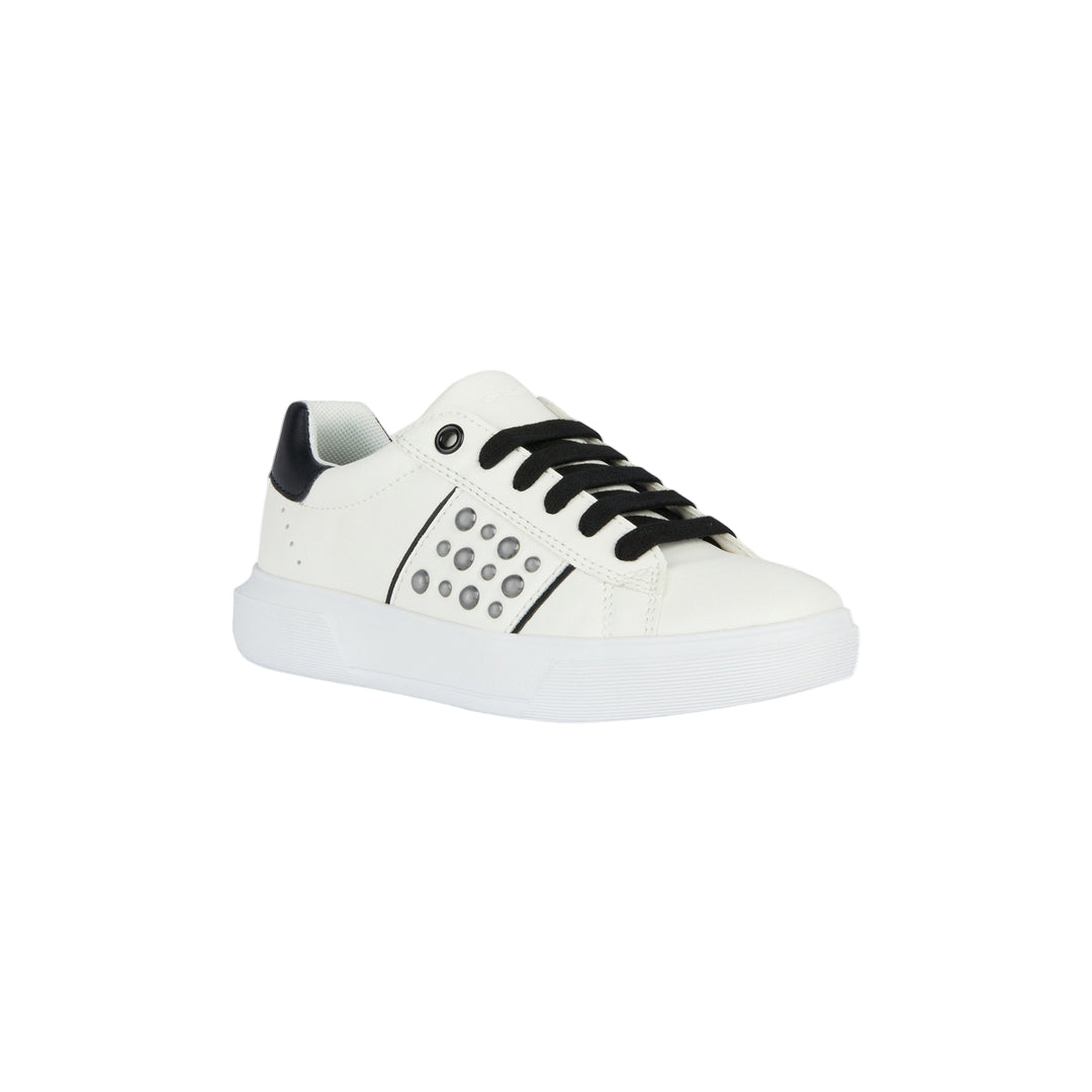 White Nettuno tab sneakers for kid girls from Geox. Girl’s low-cut sneaker with a tennis-shoe aesthetic and plenty of urban appeal. This white version of Nettuno with contrasting black details oozes on-trend modern overtones further accentuated by the gleaming studs on the upper. Breathable and comfortable, it has been crafted from a leather-effect material and will prove to be an easy match to casual dressing for schooldays or on leisuretime occasions.