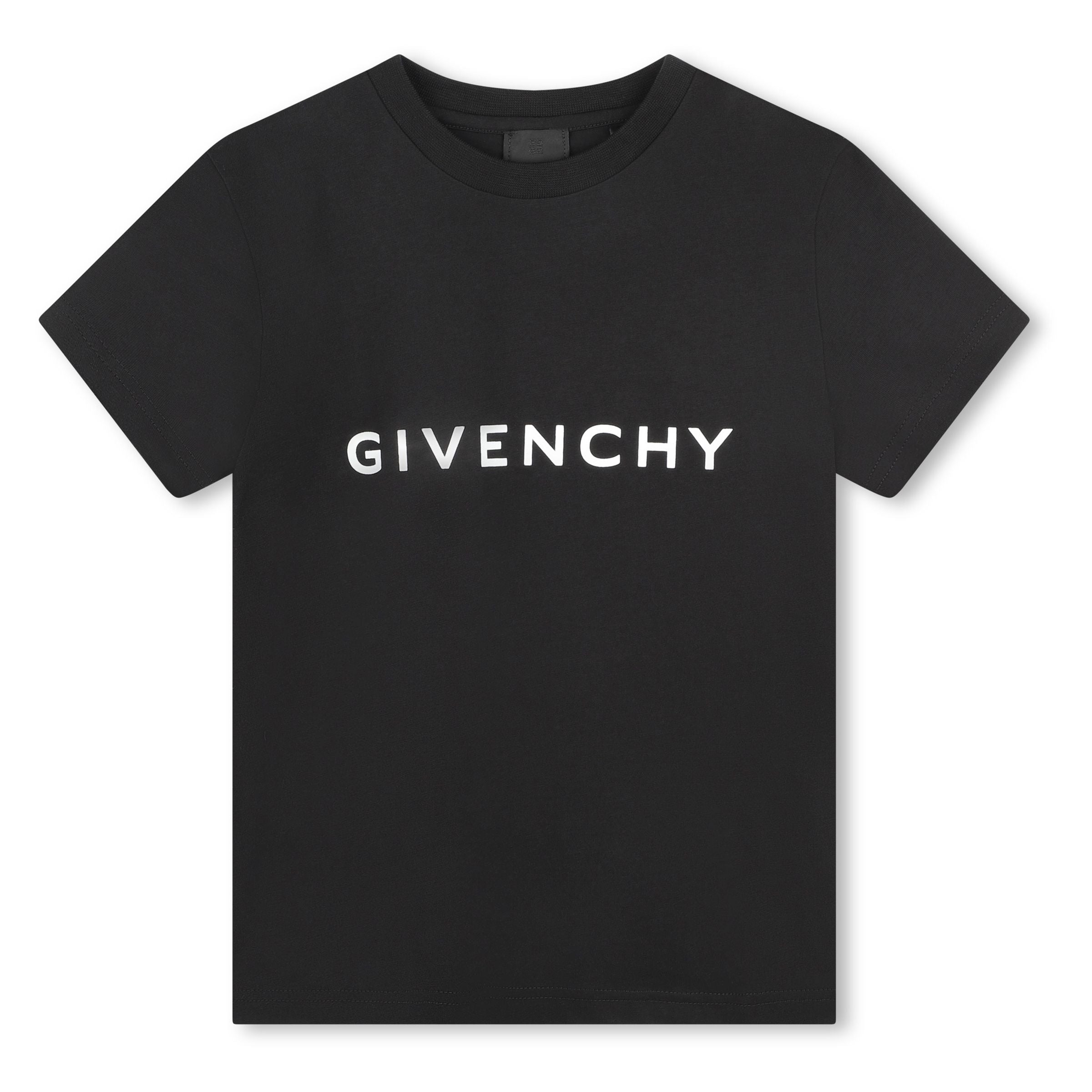 Introducing the sleek Black Logo Print Cotton T-Shirt by Givenchy, an ideal blend of style and comfort tailored for young boys Made from soft cotton with a smooth jersey texture, this shirt presents a timeless black color that pairs effortlessly with any outfit.