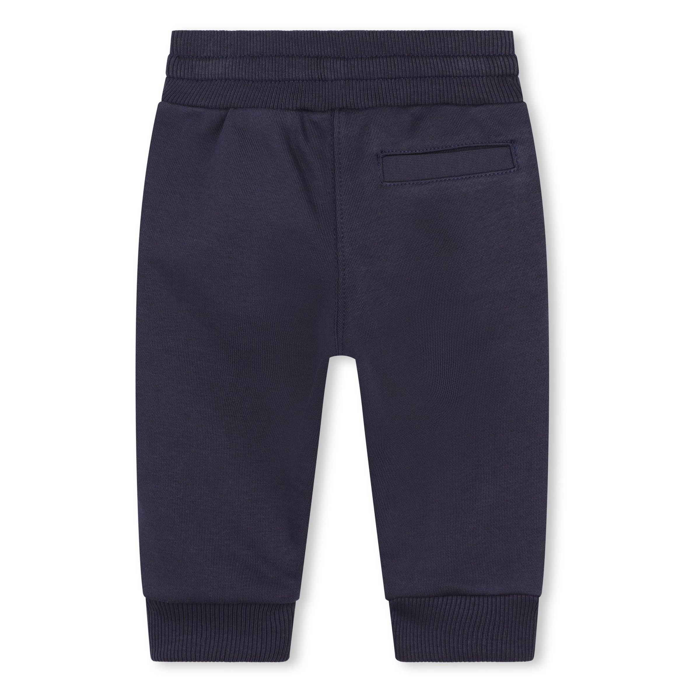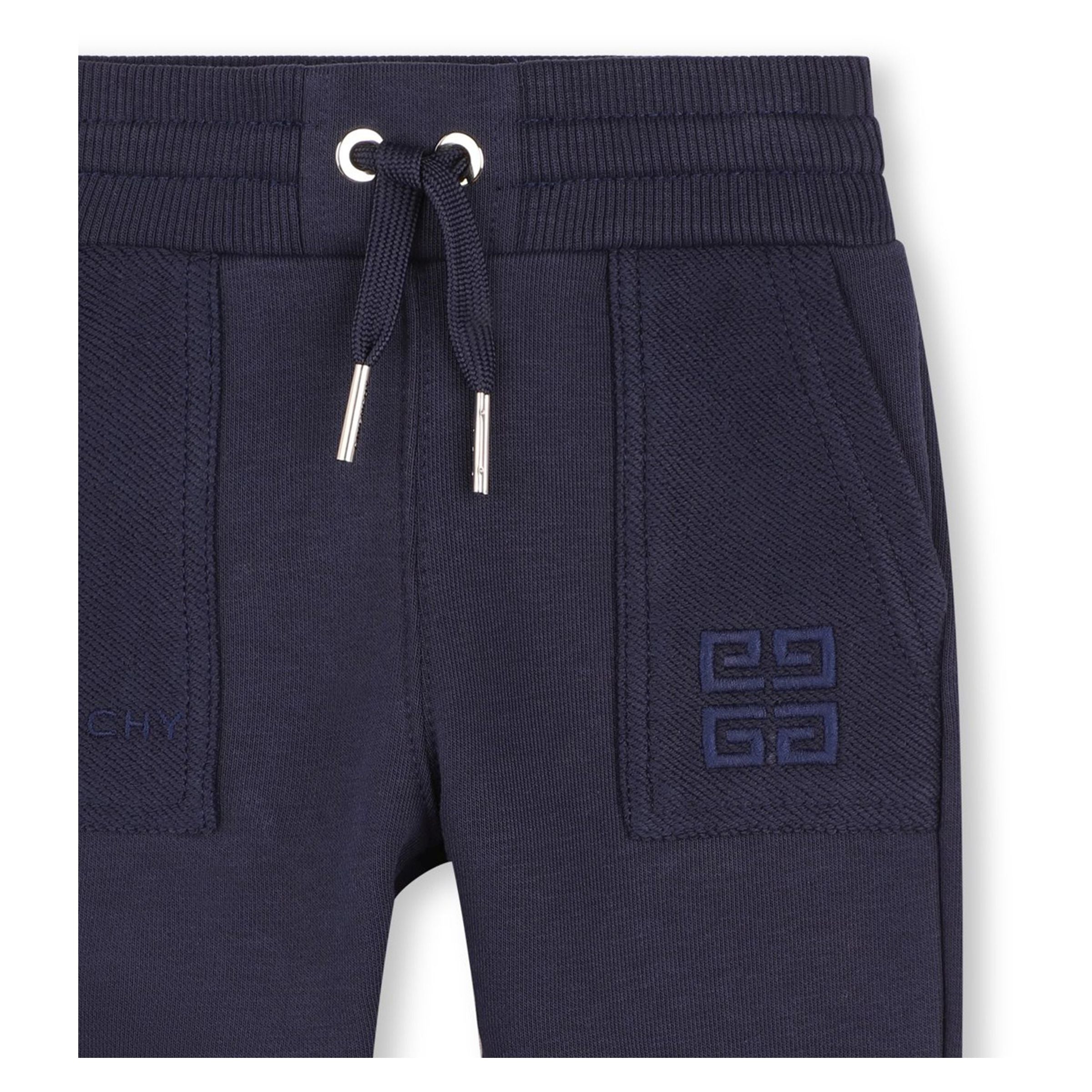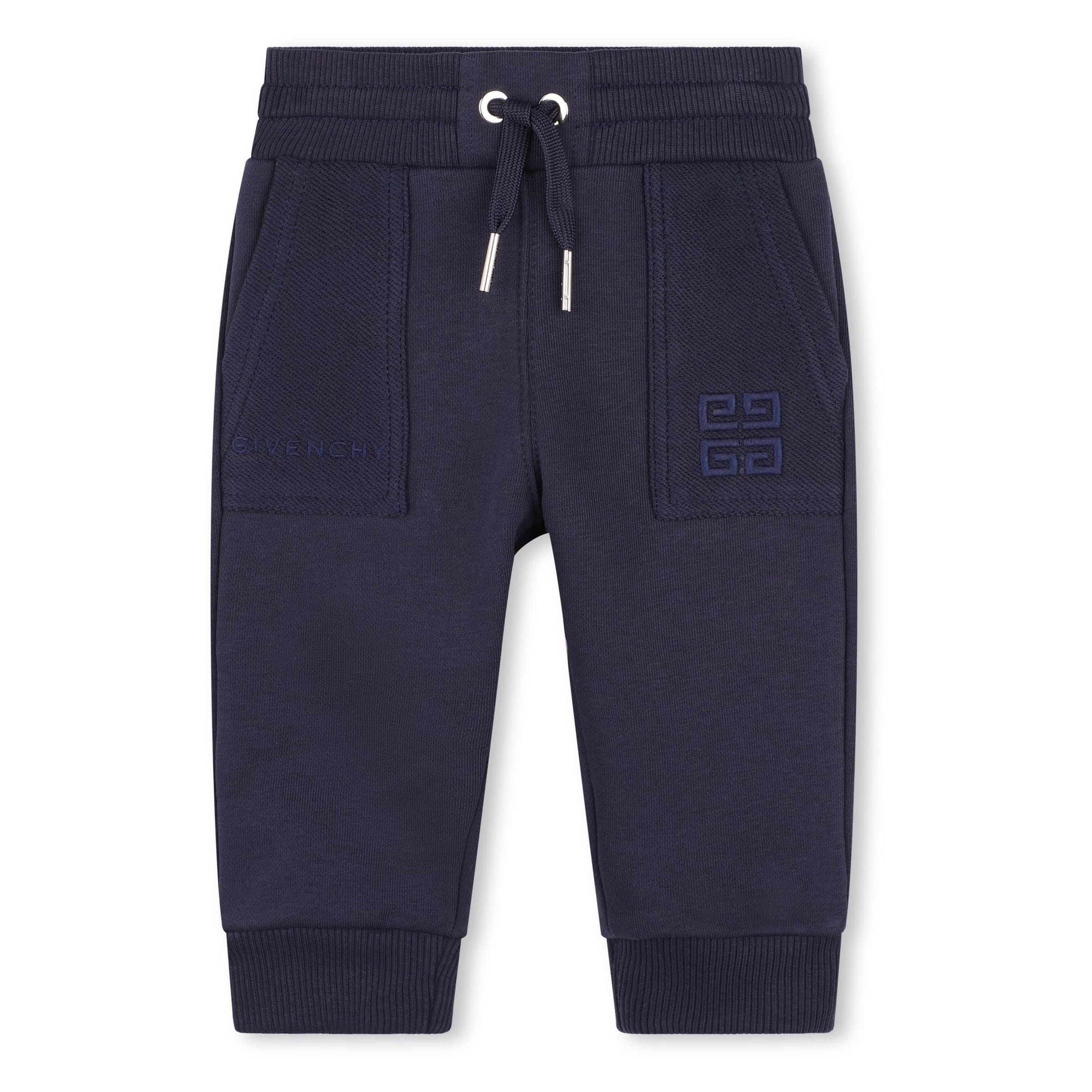 4G Print Blue Drawstring Track Pants for Babies, they feature a cotton blend, a jersey weave, a signature 4G motif, a logo on the leg, a mid-rise, an elasticated drawstring waist, a straight fit, two diagonal side pockets, a back welt pocket, and elasticated ankle cuffs.