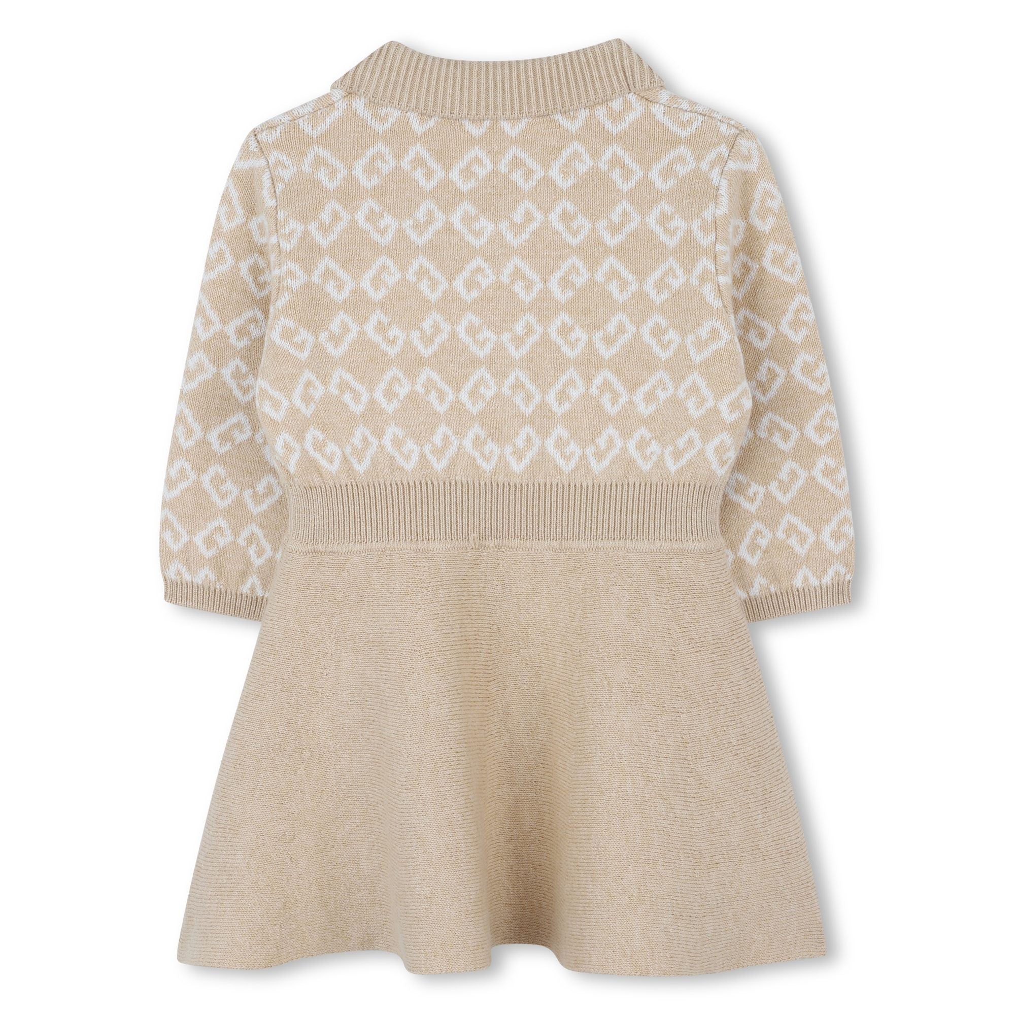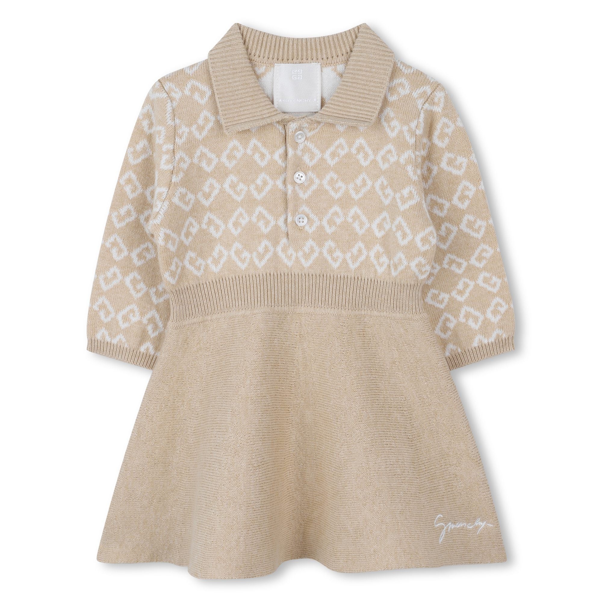 Crafted from a luxurious blend of cotton and cashmere, this soft beige knitted dress offers exceptional comfort and warmth for baby girls. Featuring an elegant buttoned front closure, the dress is adorned with the iconic 4G 72 pattern at the top and an embroidered Givenchy signature at the bottom front, reflecting refined detail and quality craftsmanship. Perfect for stylish everyday wear, this piece combines softness with designer sophistication.