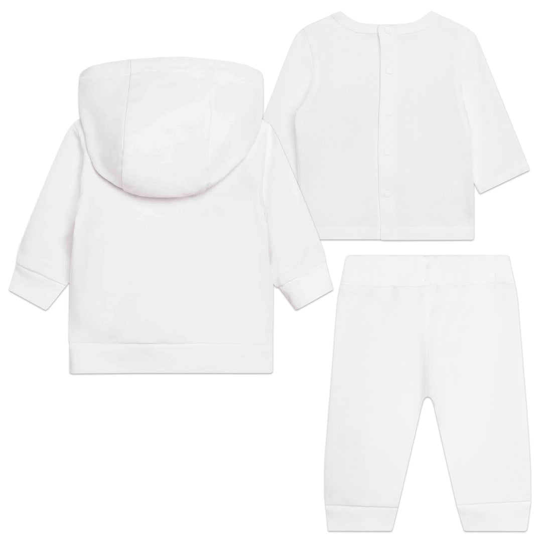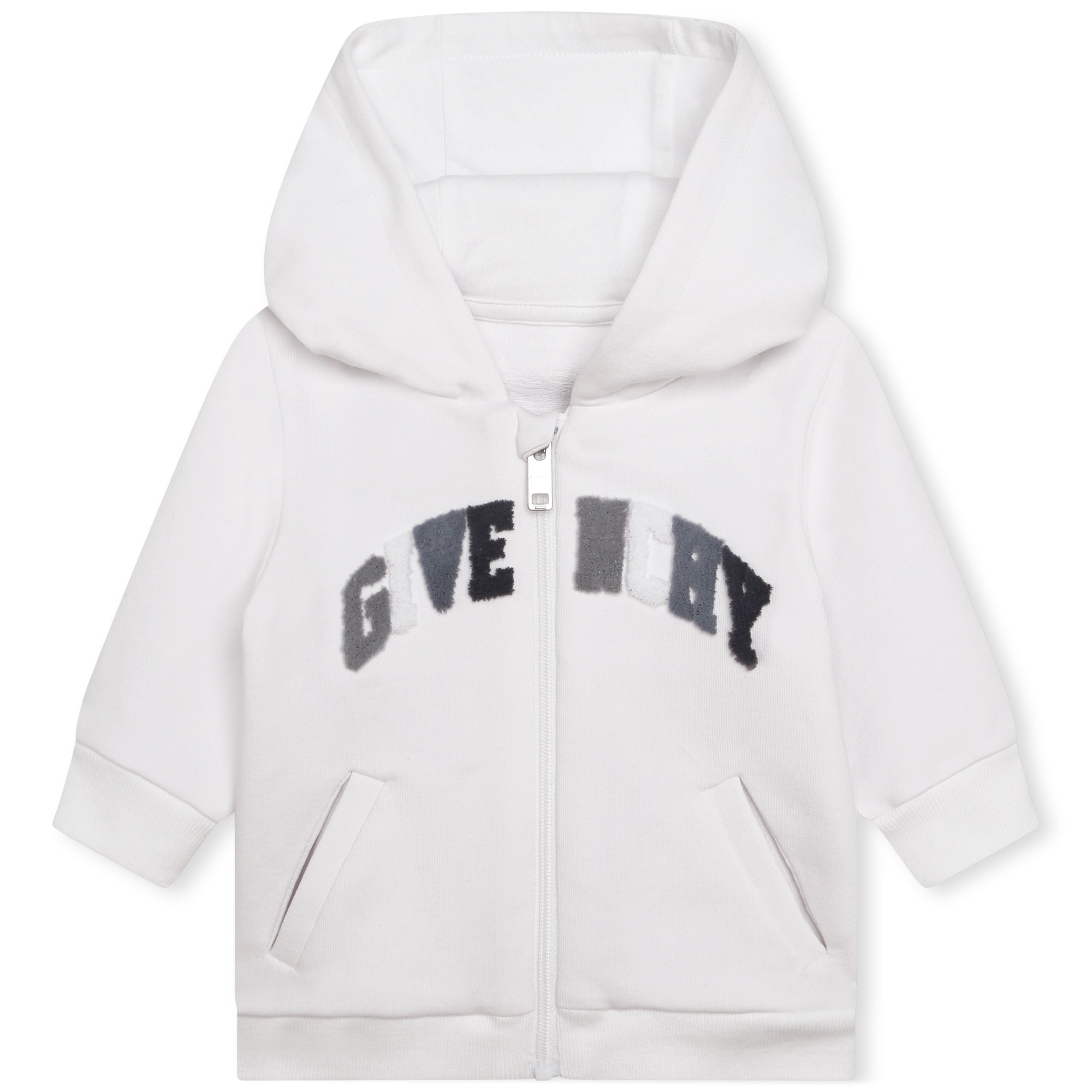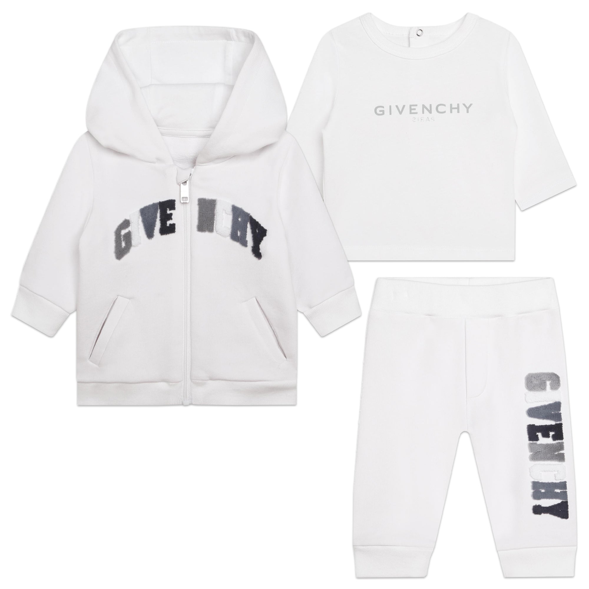 This Givenchy outfit ensemble boasts a striking off-white cotton jacket adorned with an appliqué logo and a classic hood, featuring a front zip fastening and two front welt pockets. The jacket's long sleeves with ribbed cuffs and hem exude timeless elegance. The accompanying T-shirt showcases a logo print at the chest, a round neck, rear press-stud fastening, long sleeves, and ribbed cuffs and hem, offering a blend of sophistication and comfort. Completing the look, the pants feature an appliqué logo, an elasticated waistband for ease of wear, a tapered leg, and ribbed ankles, creating a harmonious and stylish outfit perfect for any occasion.