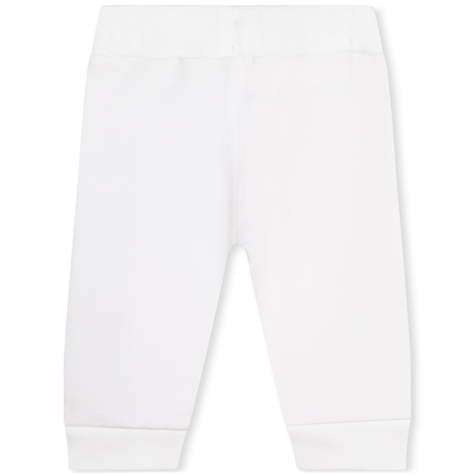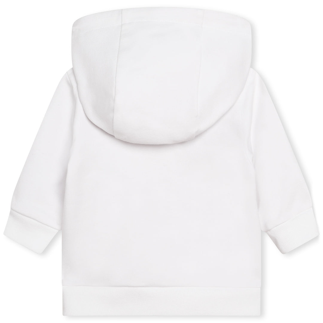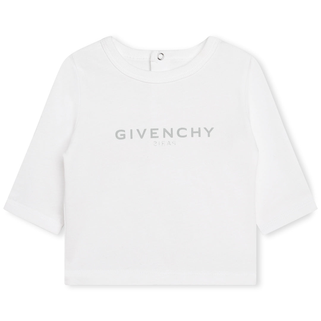 This Givenchy outfit ensemble boasts a striking off-white cotton jacket adorned with an appliqué logo and a classic hood, featuring a front zip fastening and two front welt pockets. The jacket's long sleeves with ribbed cuffs and hem exude timeless elegance. The accompanying T-shirt showcases a logo print at the chest, a round neck, rear press-stud fastening, long sleeves, and ribbed cuffs and hem, offering a blend of sophistication and comfort. Completing the look, the pants feature an appliqué logo, an elasticated waistband for ease of wear, a tapered leg, and ribbed ankles, creating a harmonious and stylish outfit perfect for any occasion.