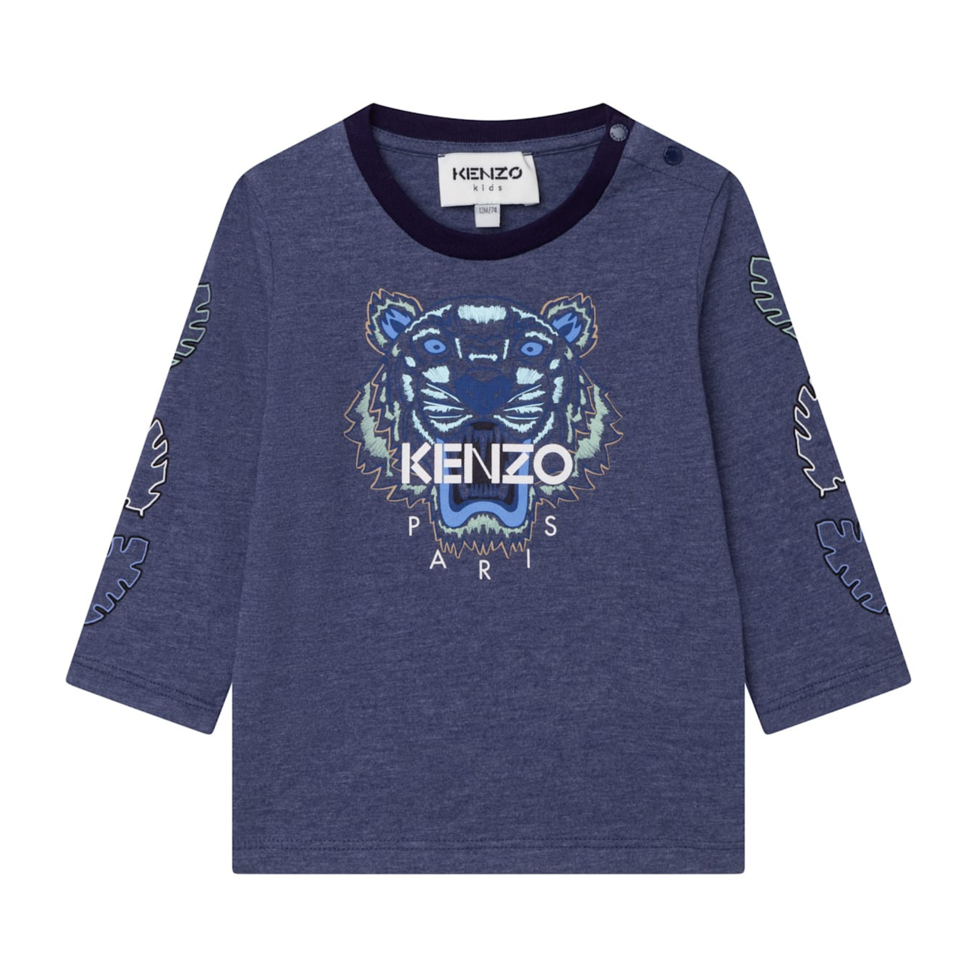 A standout piece seasonal edit, this electric blue long-sleeved T-shirt brings playful energy to everyday dressing. Crafted in soft cotton jersey, it features the brand’s iconic tiger motif across the chest, accented with stylized claw graphics on the sleeves. Snap buttons at the shoulder ensure easy changes, while the vibrant palette adds a bold twist to classic comfort.