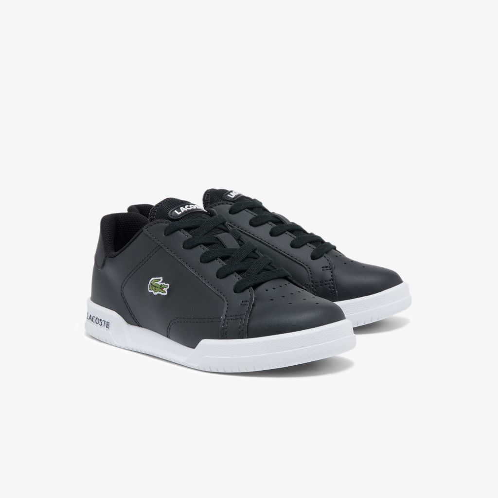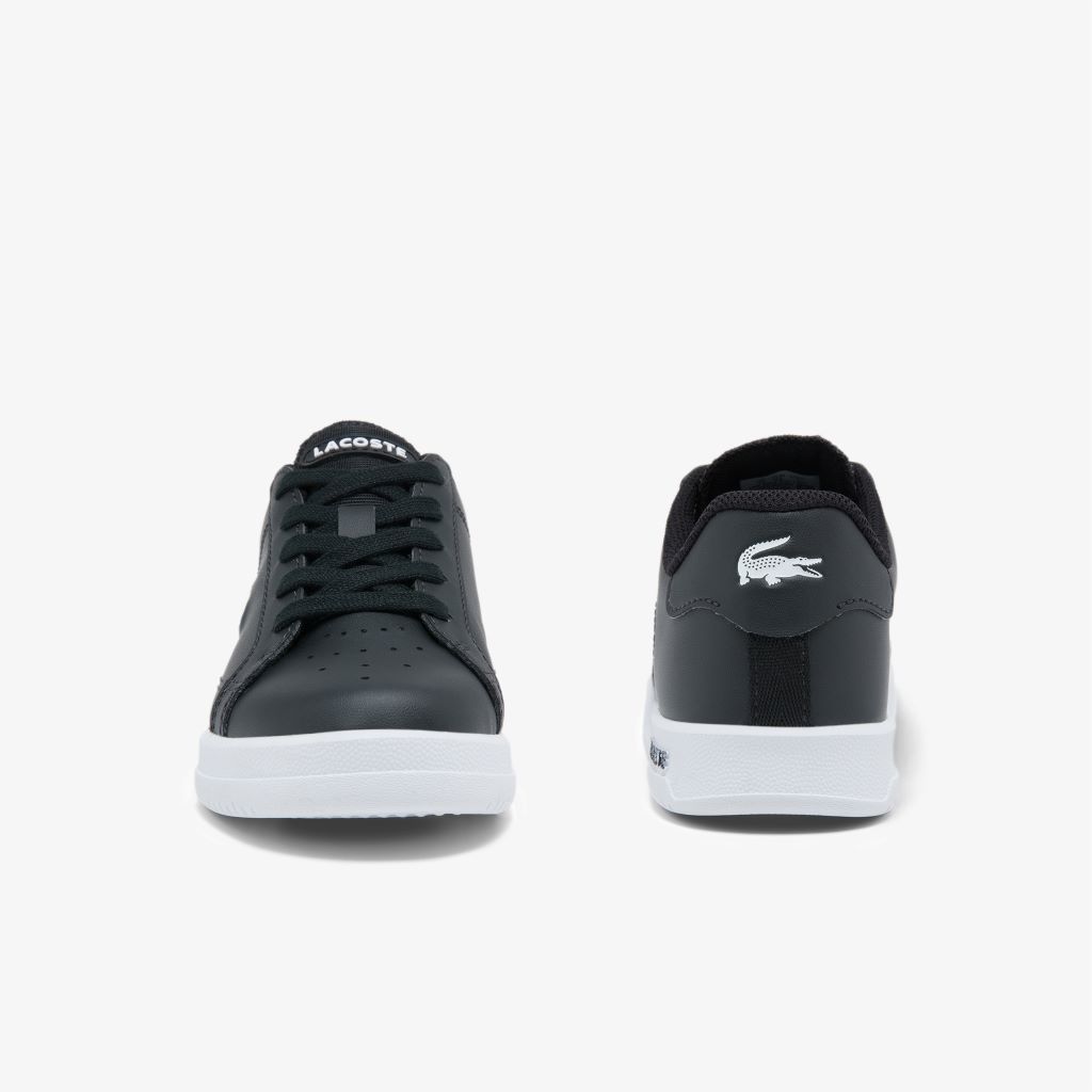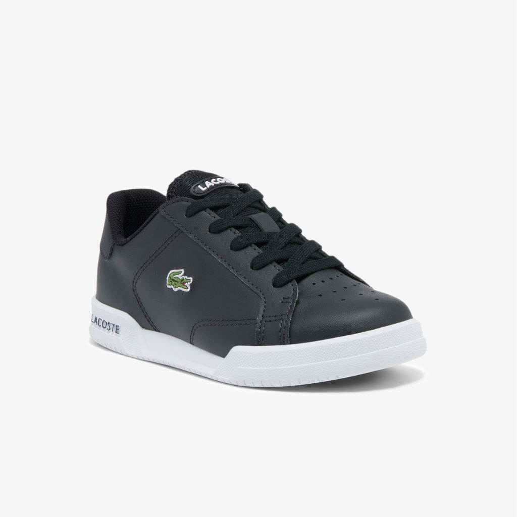 Black logo leather trainers for kid and baby boys from Lacoste. This is an essential court sneaker that delivers a modern spin on the iconic cupsole construction. Presented in a choice of core, sport-inspired colourways, the uppers are crafted from rich tumbled leather for a premium look and feel. A smooth heel piece introduces stylish contrast, while recycled polyester linings demonstrate Lacoste's commitment to sustainability. A signature green crocodile and debossed branding complete the shoe, signalling decades of unsurpassed quality.