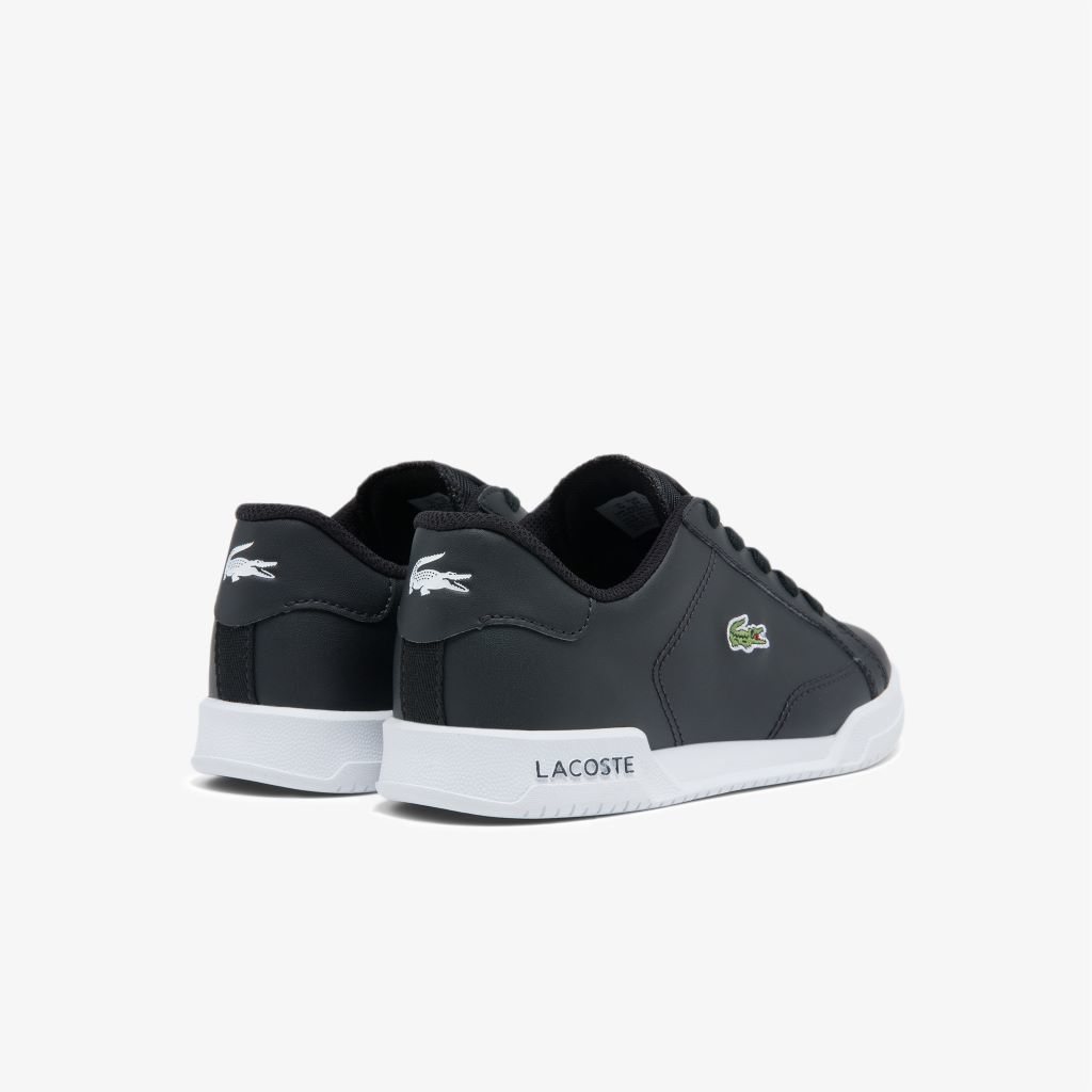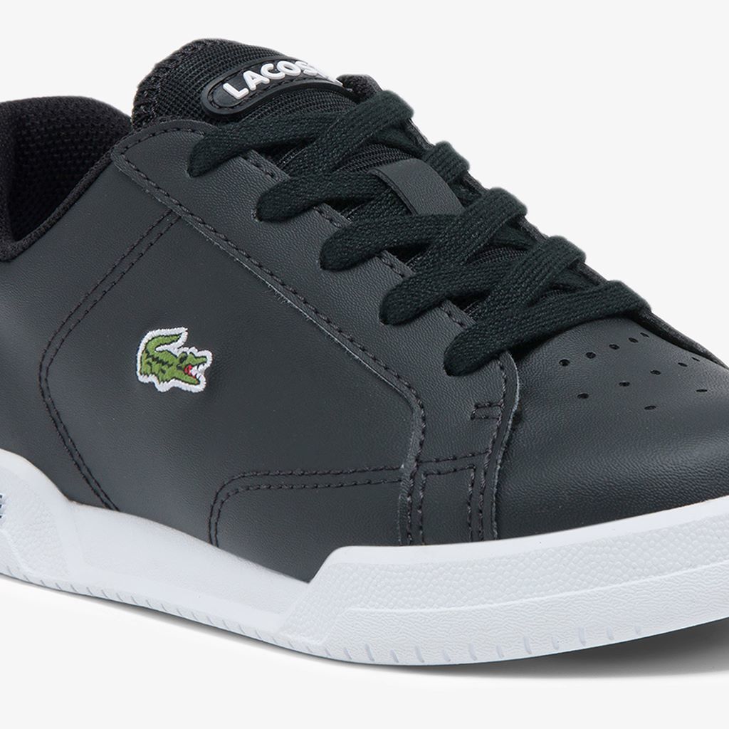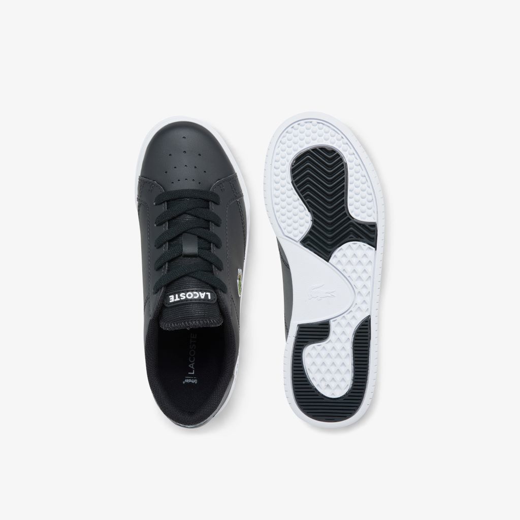 Black logo leather trainers for kid and baby boys from Lacoste. This is an essential court sneaker that delivers a modern spin on the iconic cupsole construction. Presented in a choice of core, sport-inspired colourways, the uppers are crafted from rich tumbled leather for a premium look and feel. A smooth heel piece introduces stylish contrast, while recycled polyester linings demonstrate Lacoste's commitment to sustainability. A signature green crocodile and debossed branding complete the shoe, signalling decades of unsurpassed quality.