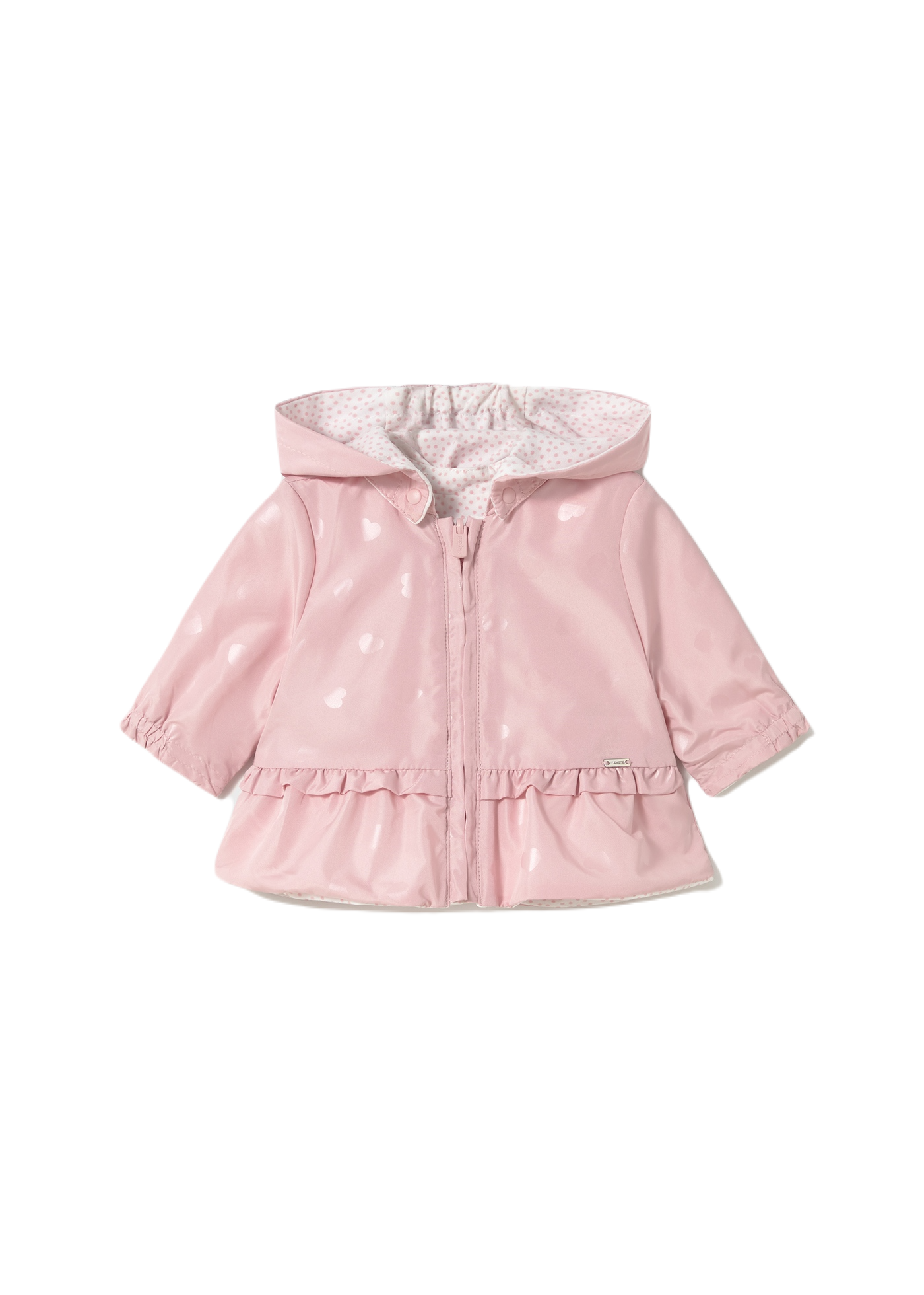 - Reversible design: outer shell with hearts, inner lining with pink polka dots