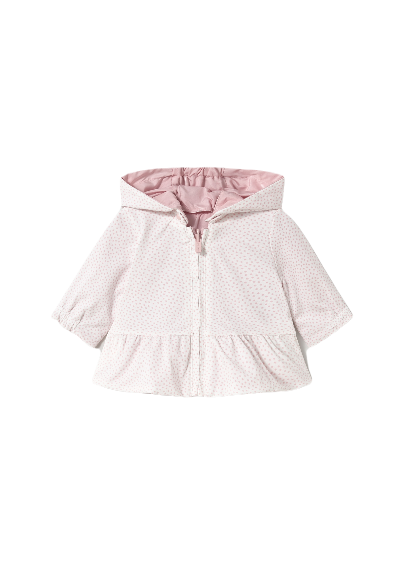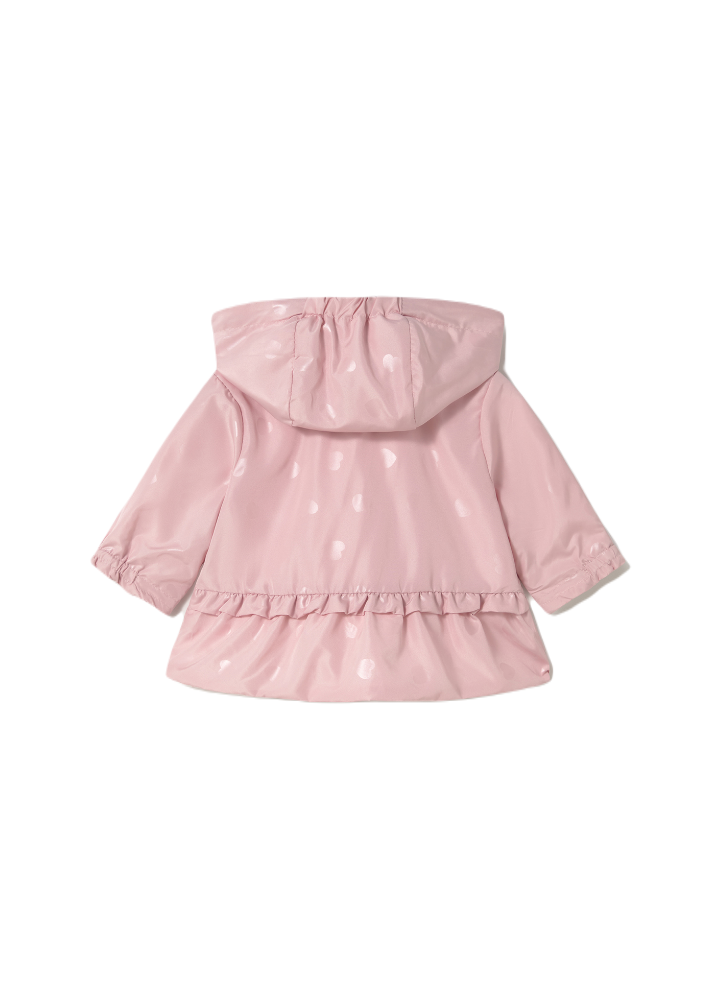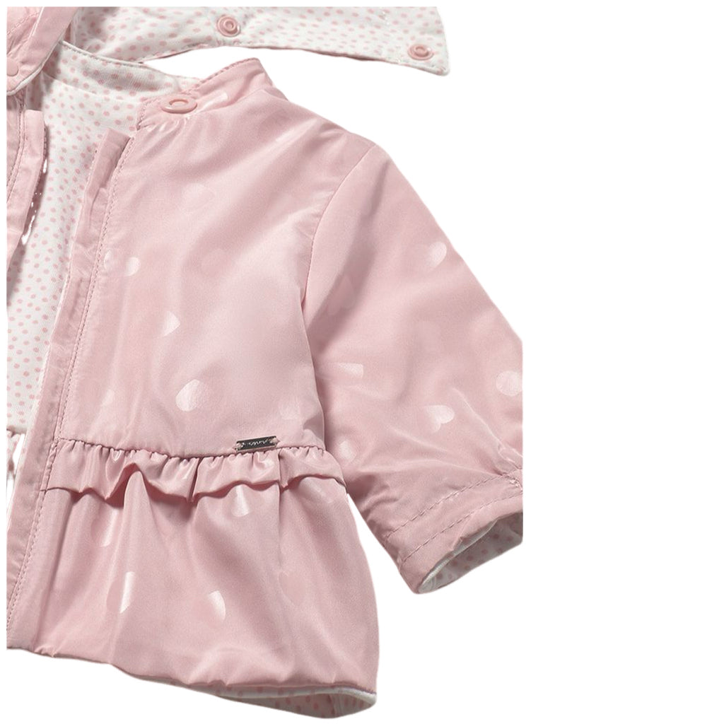 Newborn long-sleeve windbreaker jacket with elastic cuffs and a hooded collar. Front zipper closure for easy dressing. Adorable design with a ruffled hem for a touch of charm. Perfect for keeping your little one cozy and stylish.
