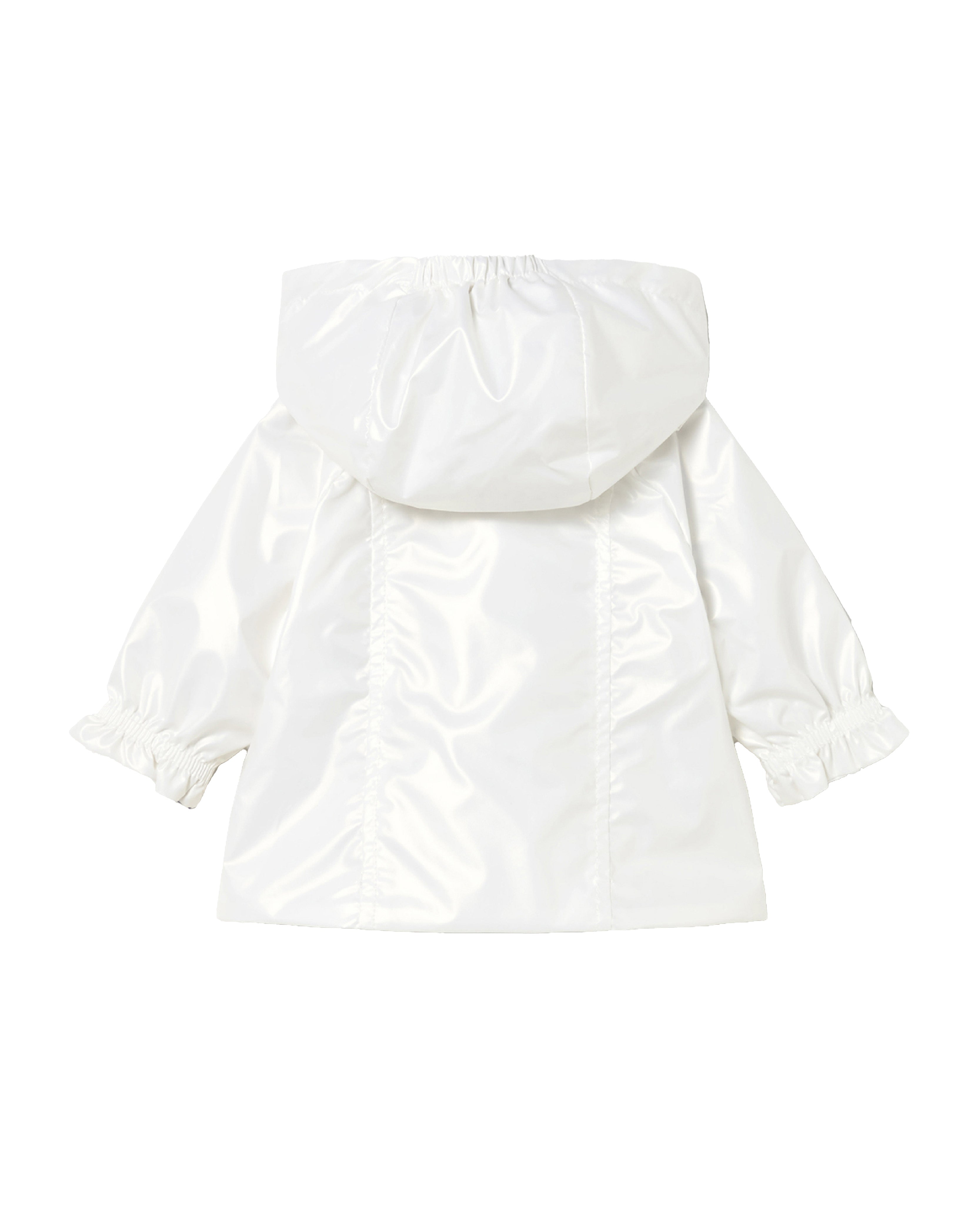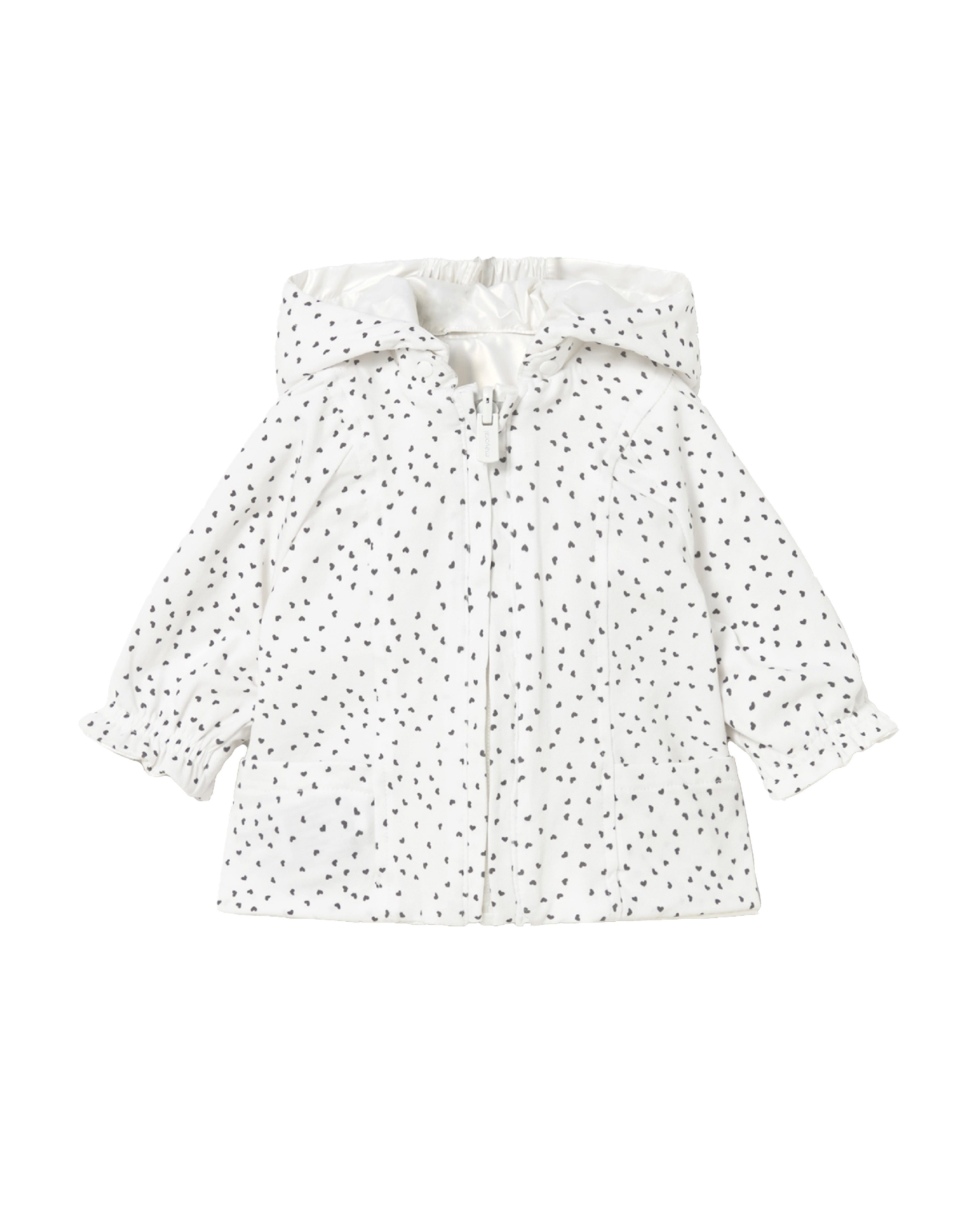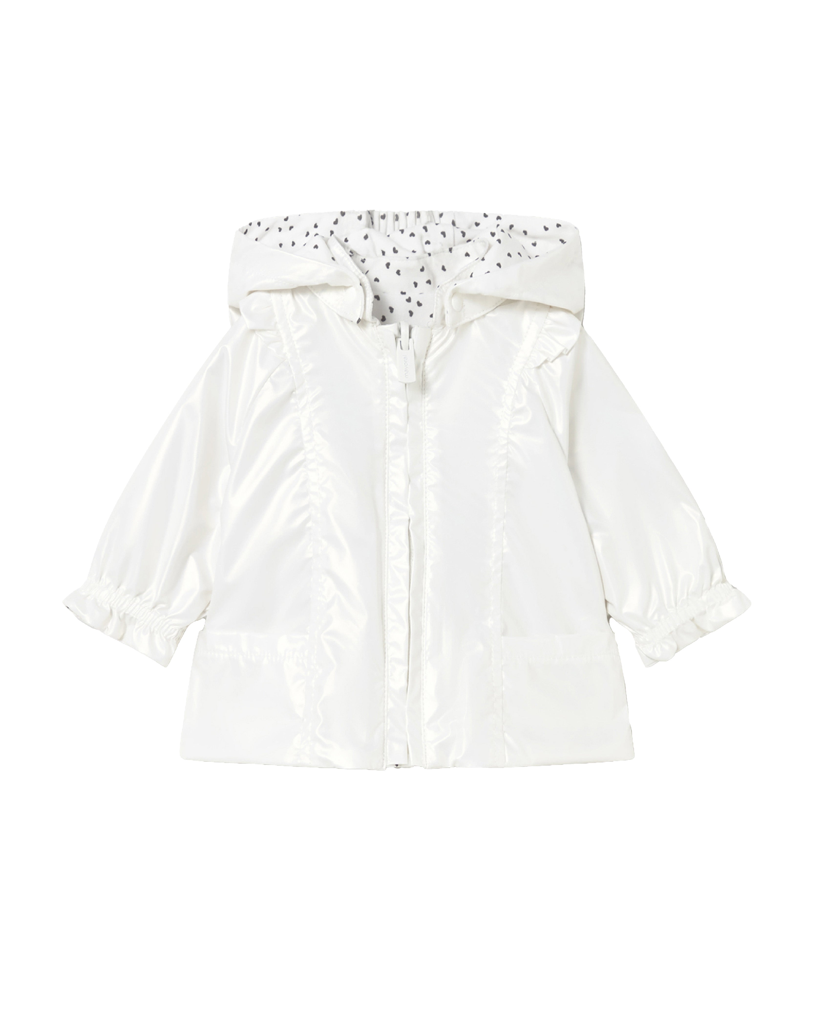 A chic double-face jacket for kids, featuring a glossy finish with playful ruffle trims along the zipper and sleeves. The hood is lined with a dotted fabric for added charm, while elastic cuffs and pockets make it both stylish and practical for cooler days.