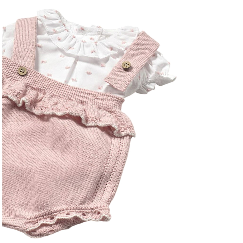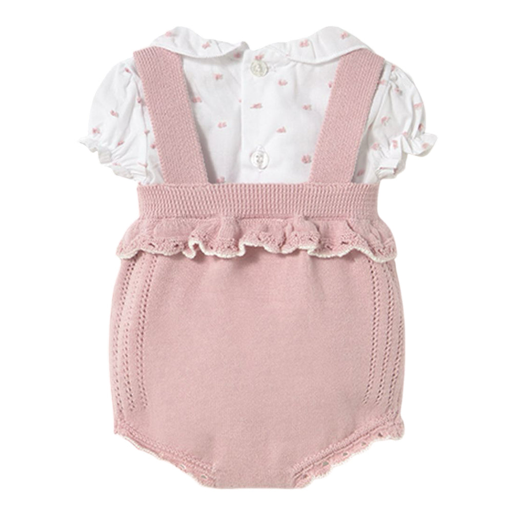 Original two-piece set for newborns, designed for both comfort and style. The short-sleeve blouse features ruffled details, a round neckline with a ruffled trim, and a back button closure for easy dressing. Its printed design adds a playful touch. Paired with original overalls made from soft and pleasant knit fabric, this set ensures your little one stays cozy and stylish all day long.