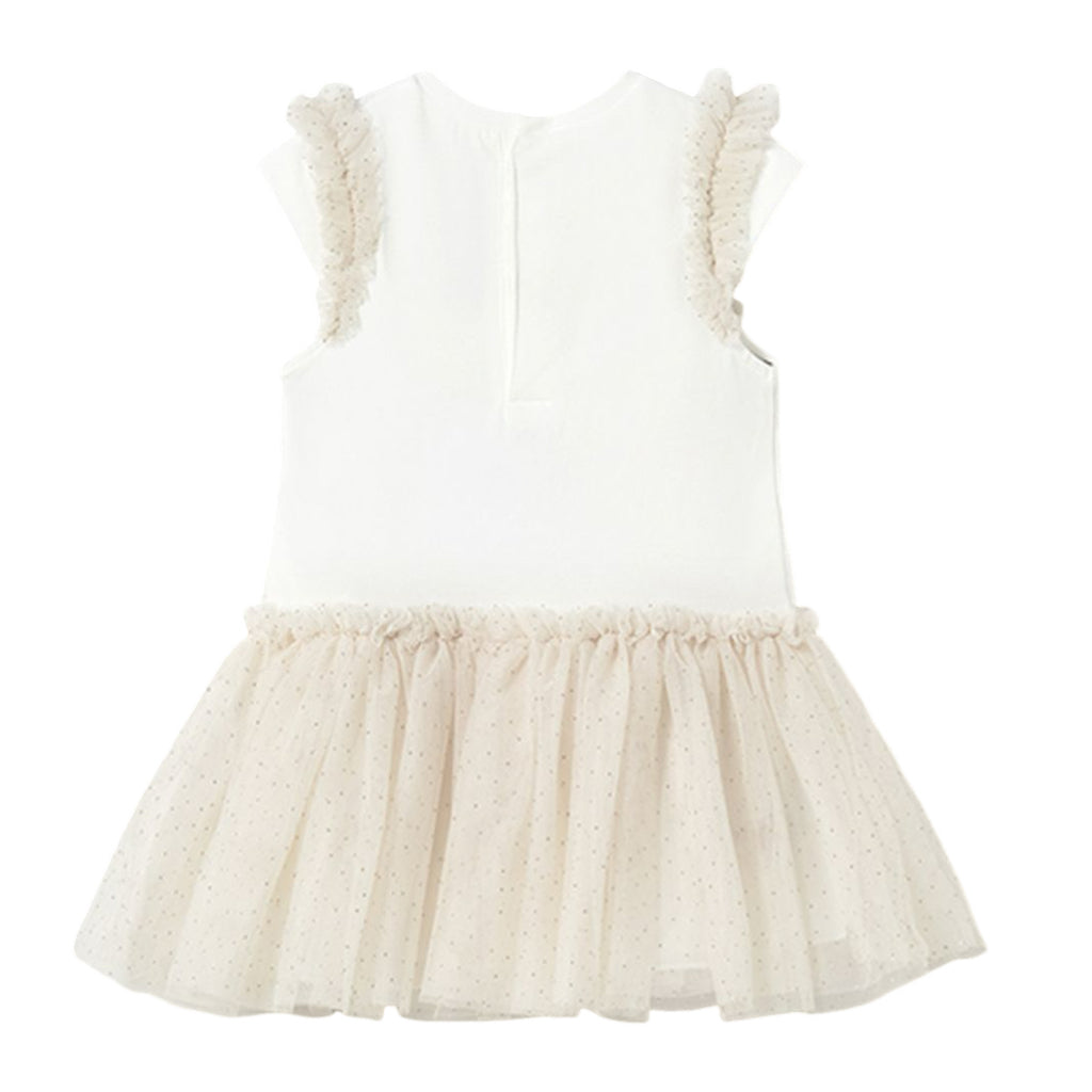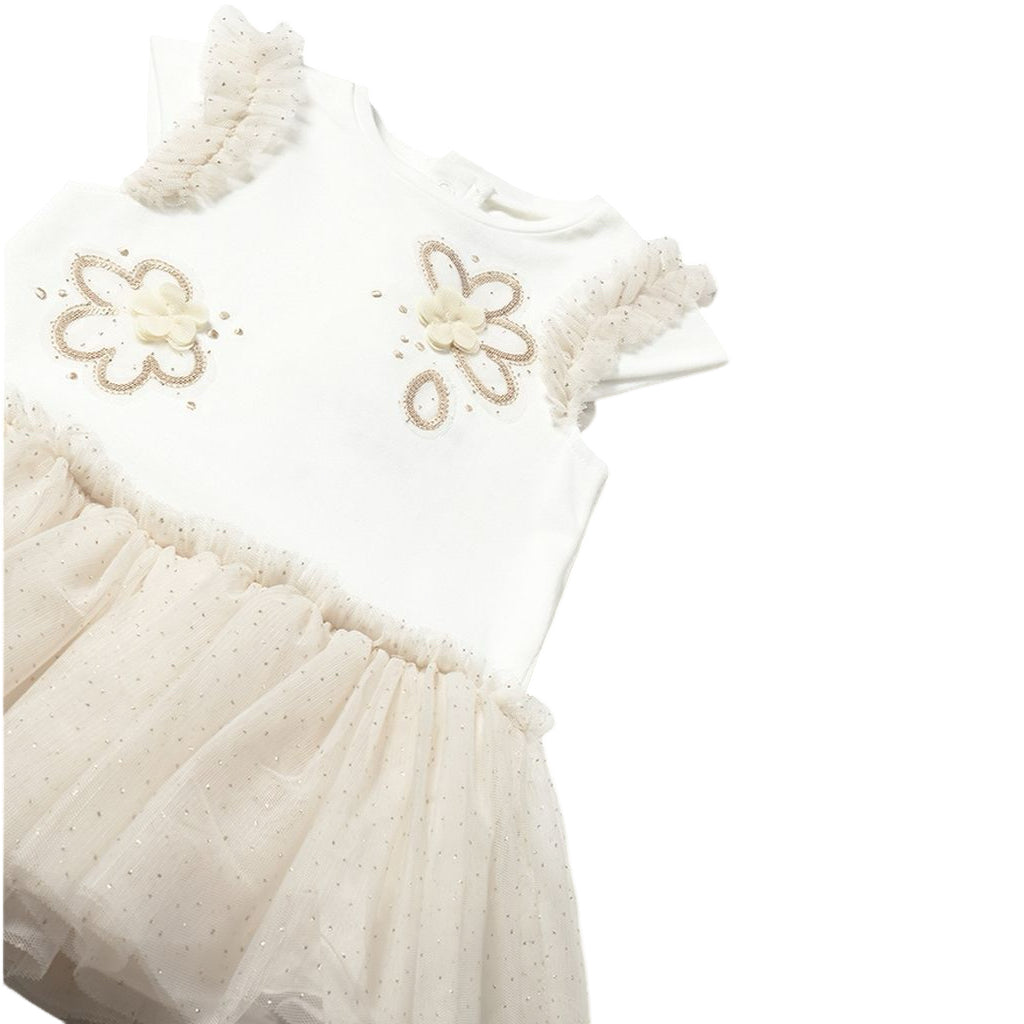- Gathered champagne tulle skirt with subtle glitter dot pattern