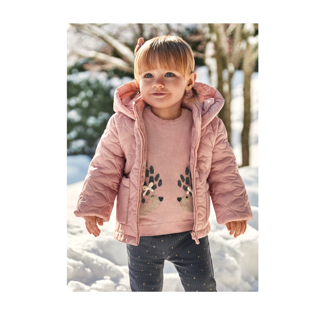Wrap your little one in warmth and charm with the Baby Quilted Heart Jacket — a stylish coat that combines cozy comfort with sweet, heart‑patterned detailing. Multipurpose and adorable. A hooded collar and full front zipper make dressing easy, while elastic cuffs keep out the draft for a snug, secure fit. Functional front pockets add practical touch points for little hands.