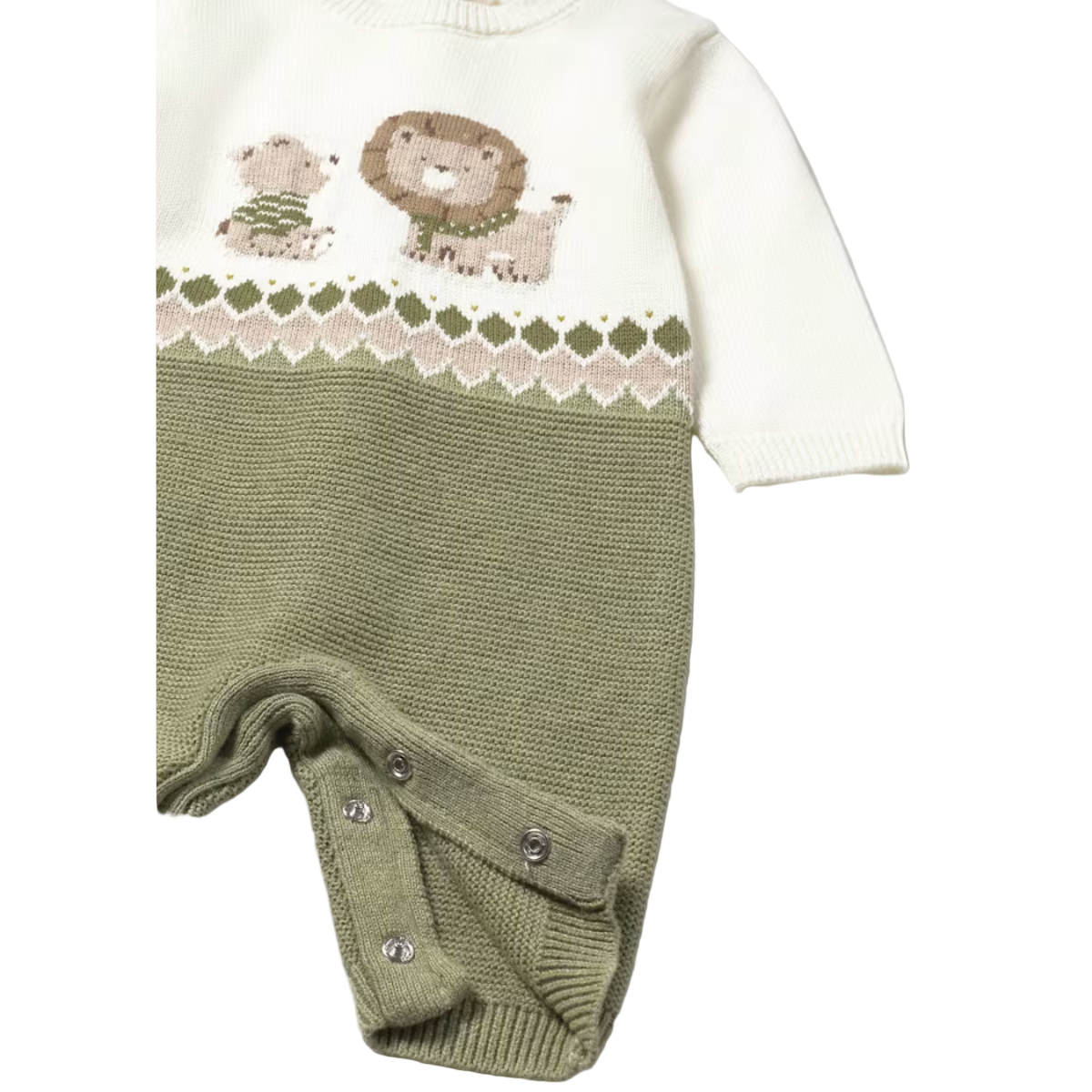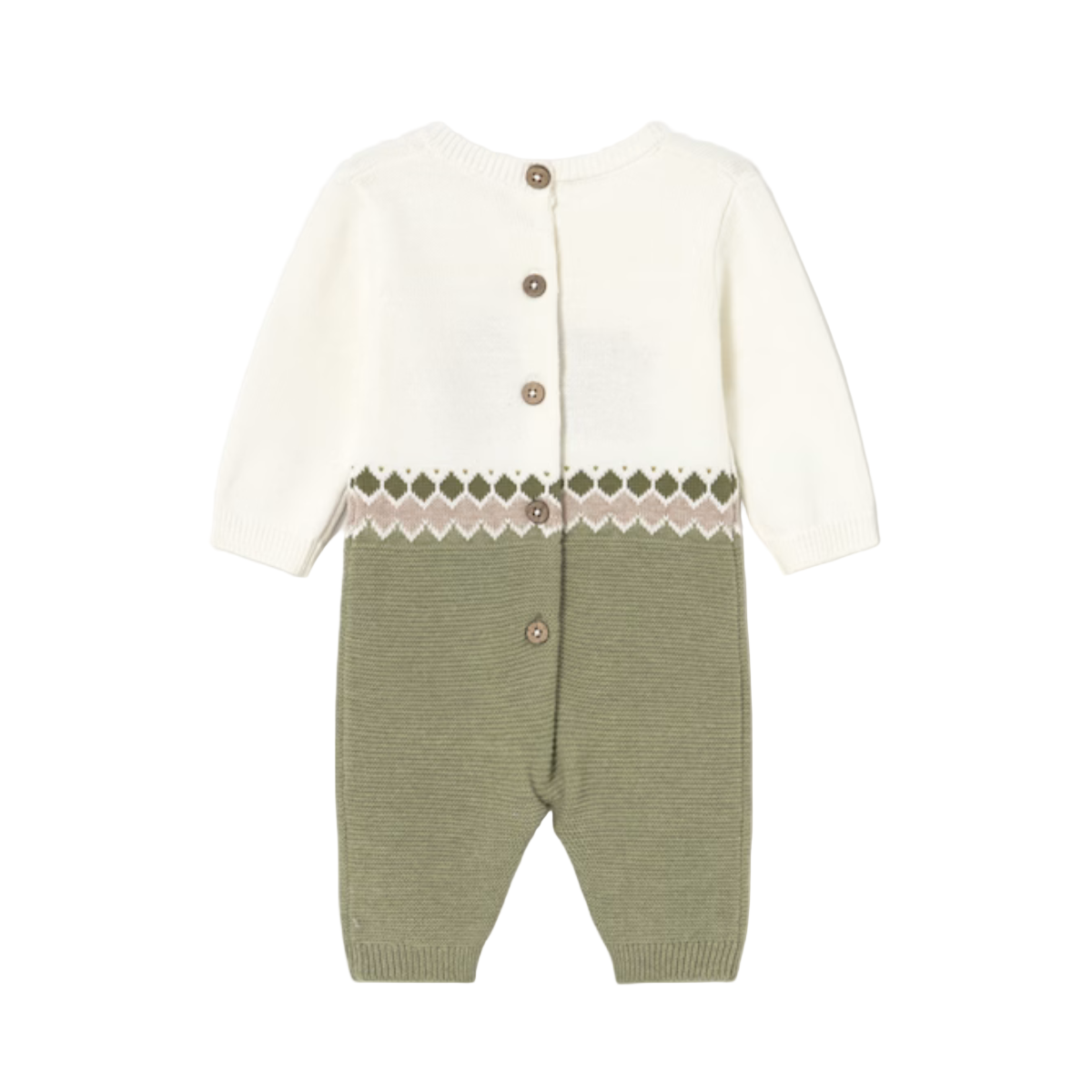 Long sleeved Romper for newborn. Round neckline. Snap button fastening at crotch for easy dressing. Button fastenings down the back to allow the garment to be put on and taken off easily. Knitted fabric, soft and pleasant to the touch.