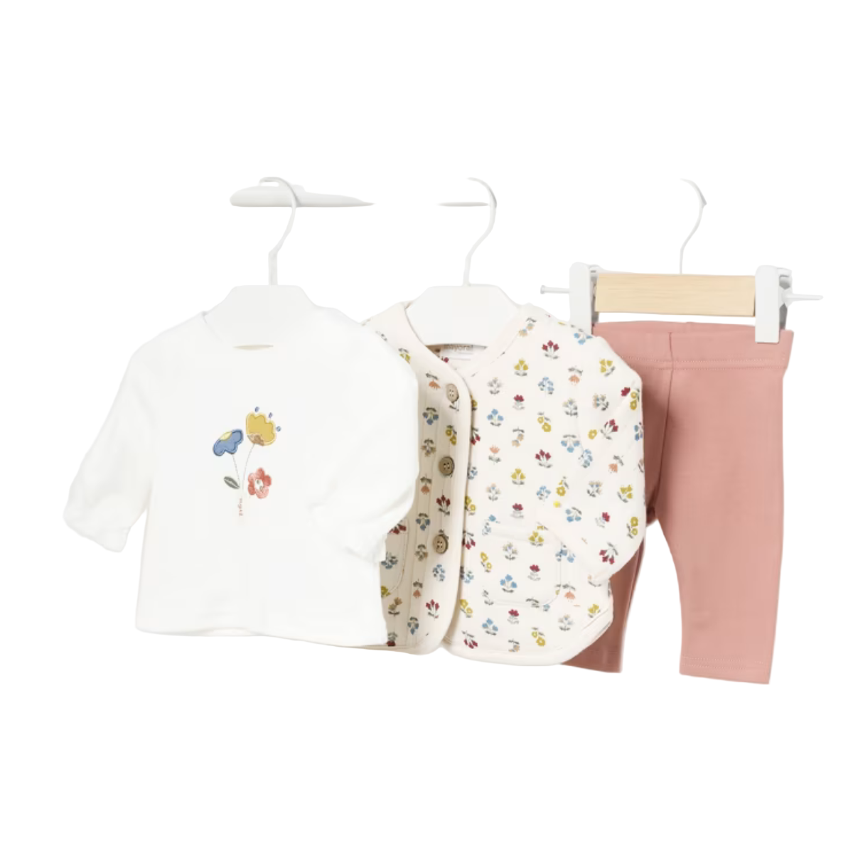 The Newborn Girl 3 Piece Floral Set is a sweet and stylish outfit, perfect for your baby’s first days. This charming set includes a soft long-sleeve top with delicate floral details, matching leggings, and a coordinating jacket for a complete, put-together look. Made from gentle, breathable fabrics, each piece is designed with comfort in mind, ensuring your little one stays cozy all day.