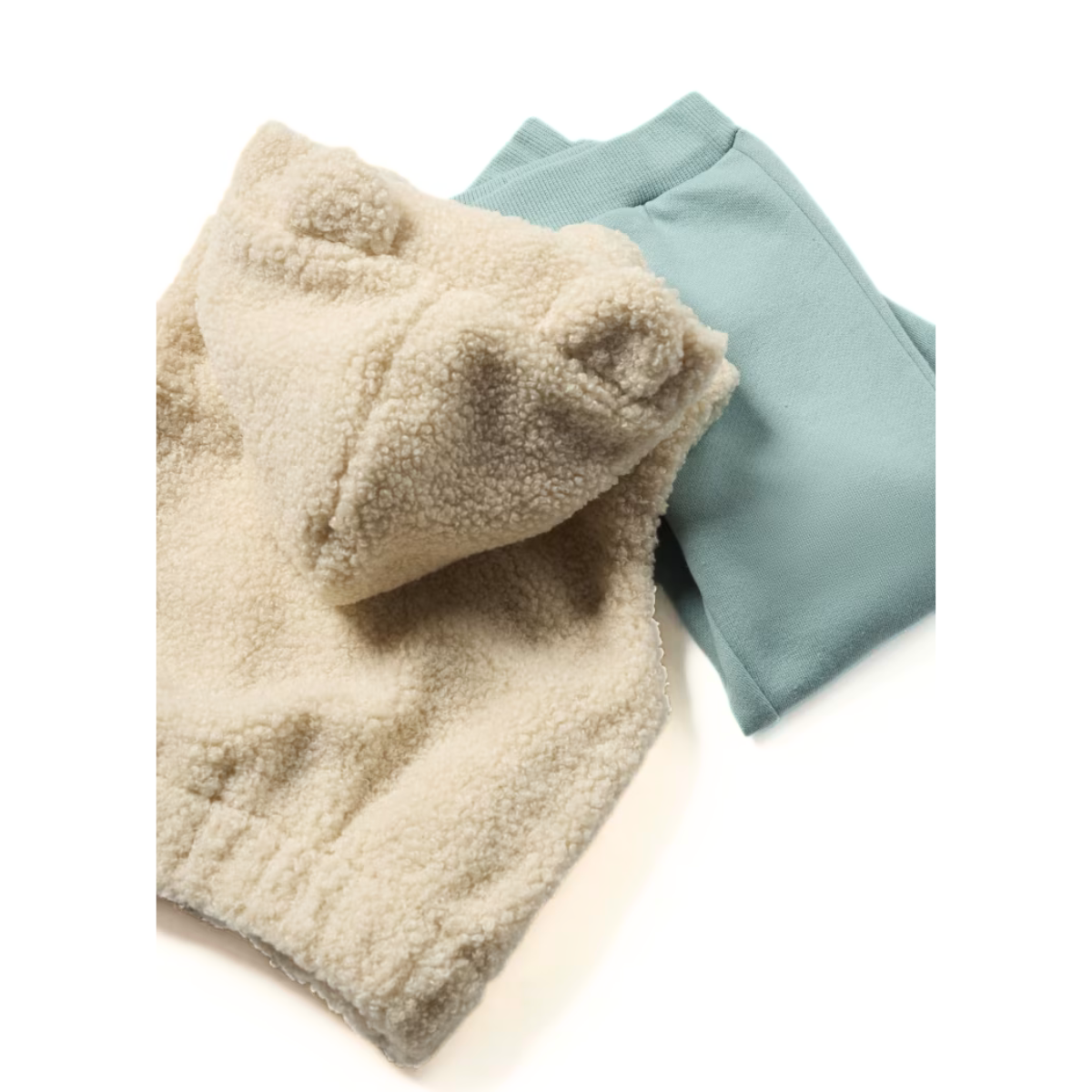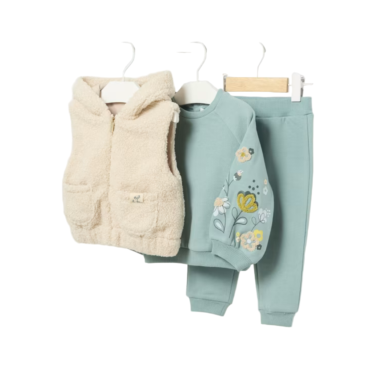 Get your little one ready for cozy adventures with this charming three-piece outfit. The Baby 3 Piece Tracksuit is a sleeveless vest features, a fun hood and a central zip closure, made from soft, fluffy fabric that’s perfect for keeping them warm and stylish. With an elastic hem for a snug fit and functional front pockets, it’s as practical as it is adorable. The long-sleeve sweatshirt showcases contrasting elastic cuffs and a snap-button closure at the back for easy dressing. Its playful print adds a delightful touch to any look. Completing the ensemble are the long sporty pants, designed for maximum comfort with an elastic waistband and elastic cuffs for a perfect fit. This outfit is a must-have for any fashionable baby ready to take on the world in style!