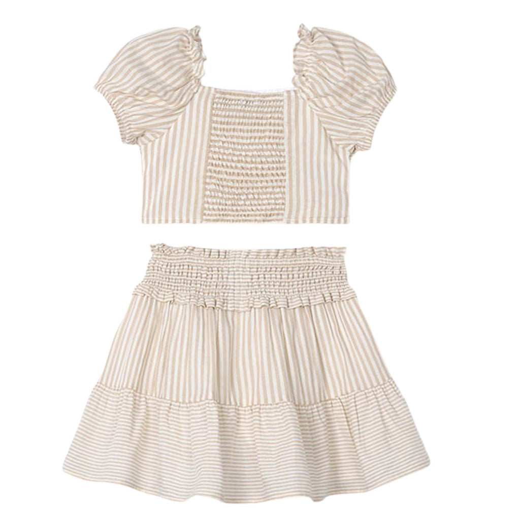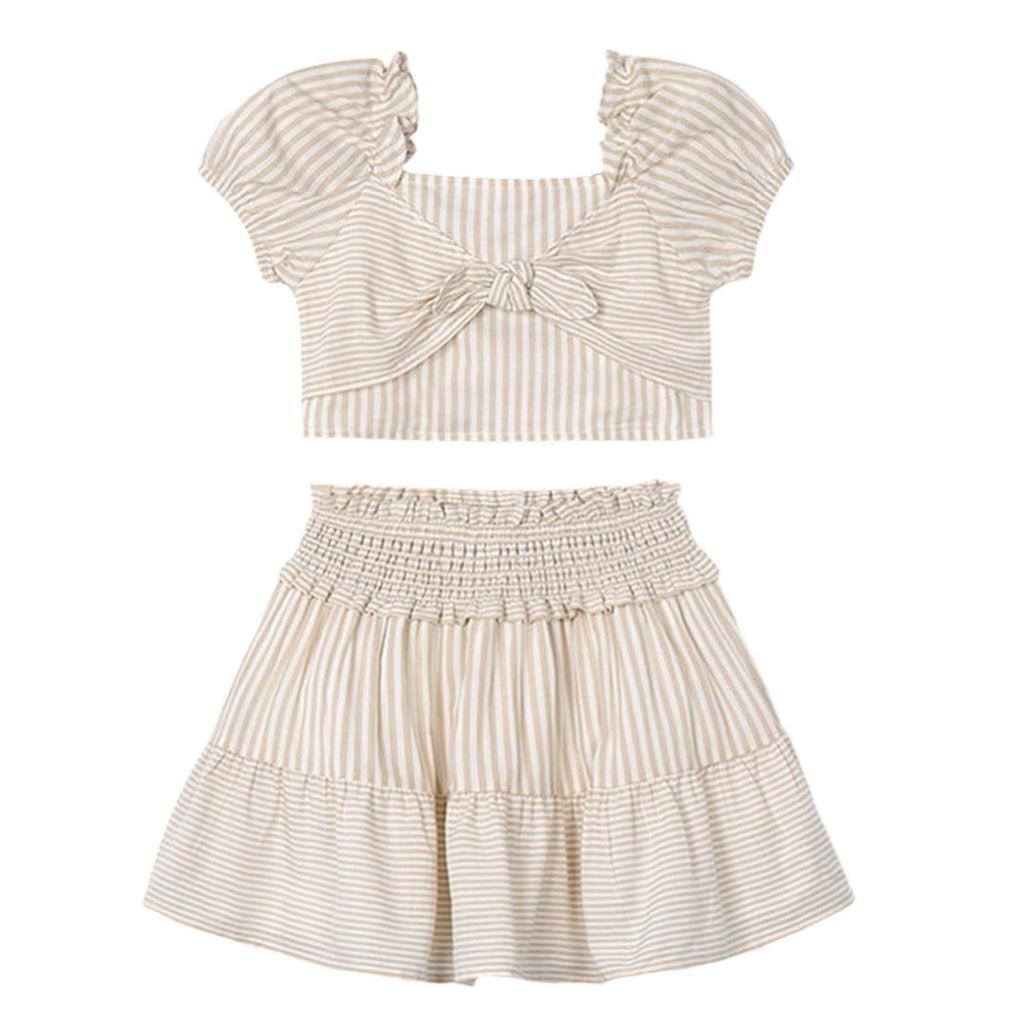 The Cinnamon Bow Skirt Set is a charming and playful outfit that combines style and comfort for your little one. The set includes a soft, lightweight skirt in a warm cinnamon hue, paired with a matching top featuring a cute bow detail at the waist.