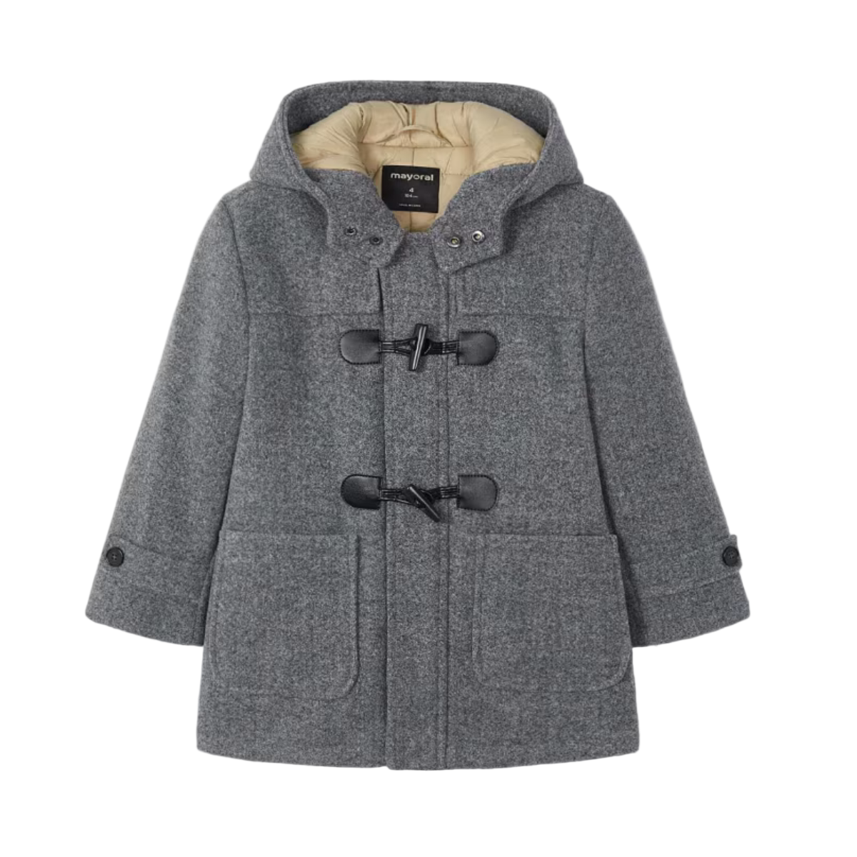 This stylish long-sleeve duffle coat for boys features a practical hood and a front zipper closure accented with classic toggles. The lightweight padded lining ensures superior thermal insulation, keeping your little one warm and cozy. Designed with functional front pockets, this coat combines both style and practicality, making it an essential outerwear piece for chilly days.