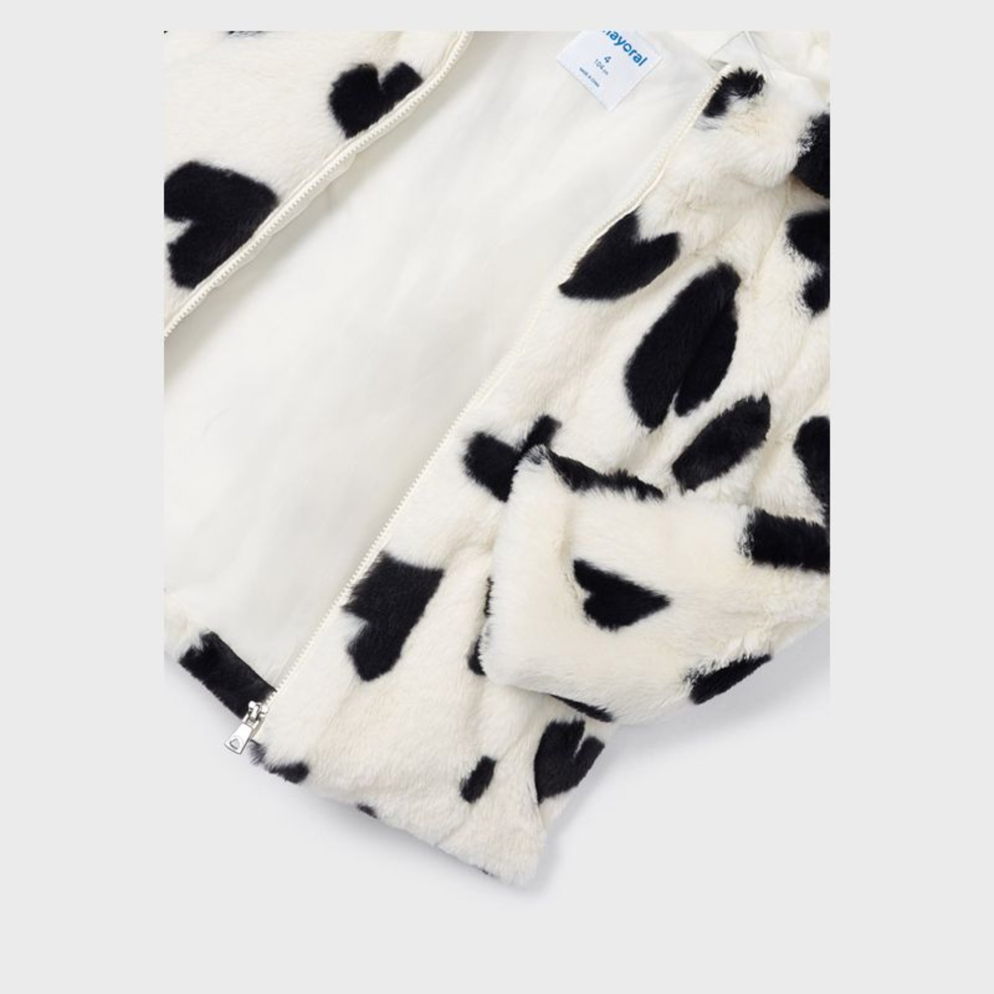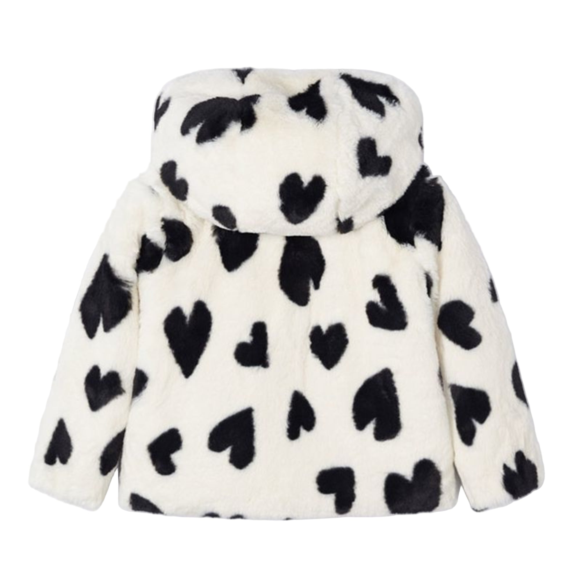A cozy and stylish outerwear piece designed to keep your little one warm and fashionable during the colder months. Crafted from soft faux fur, this coat features a charming all-over heart print that adds a playful touch to any winter outfit.