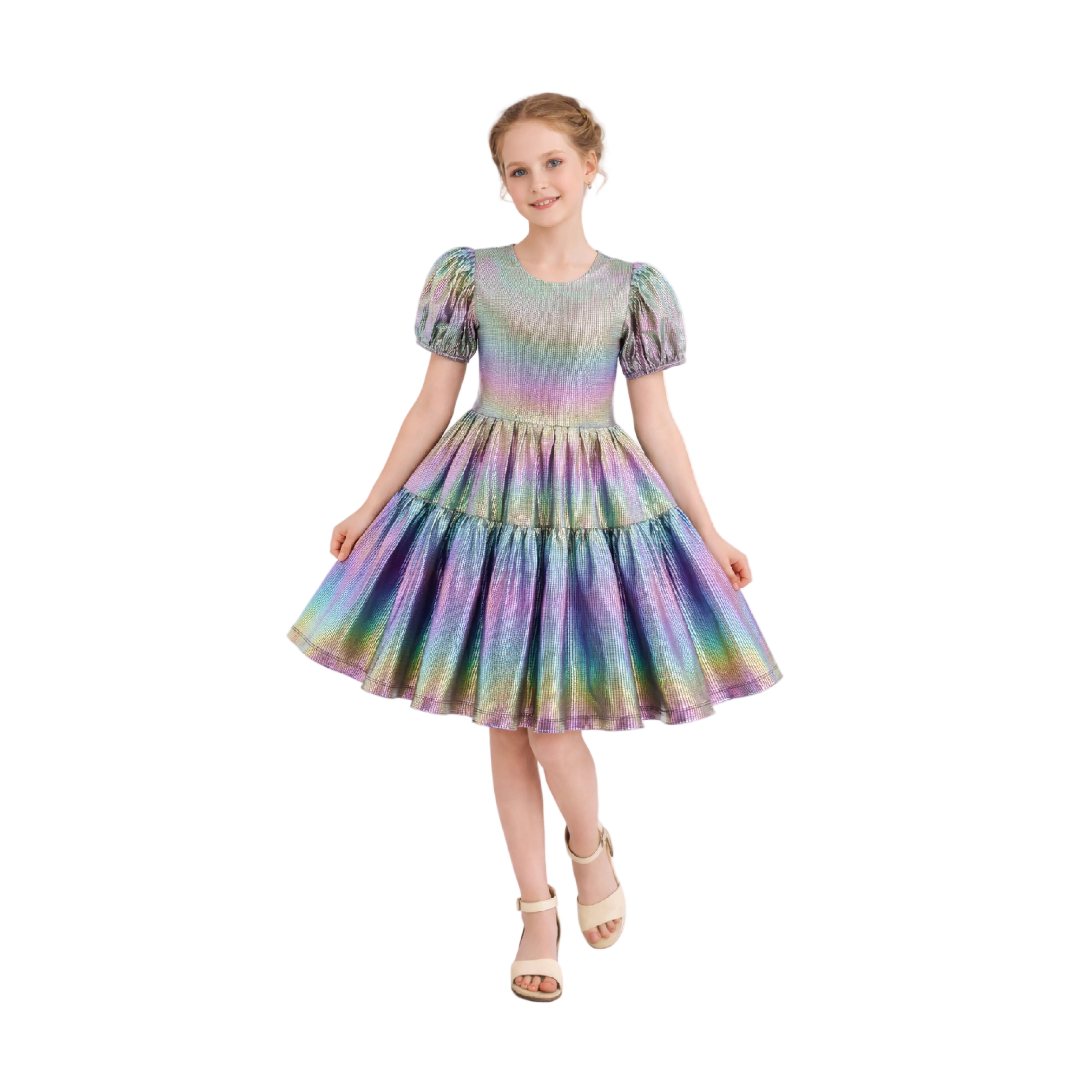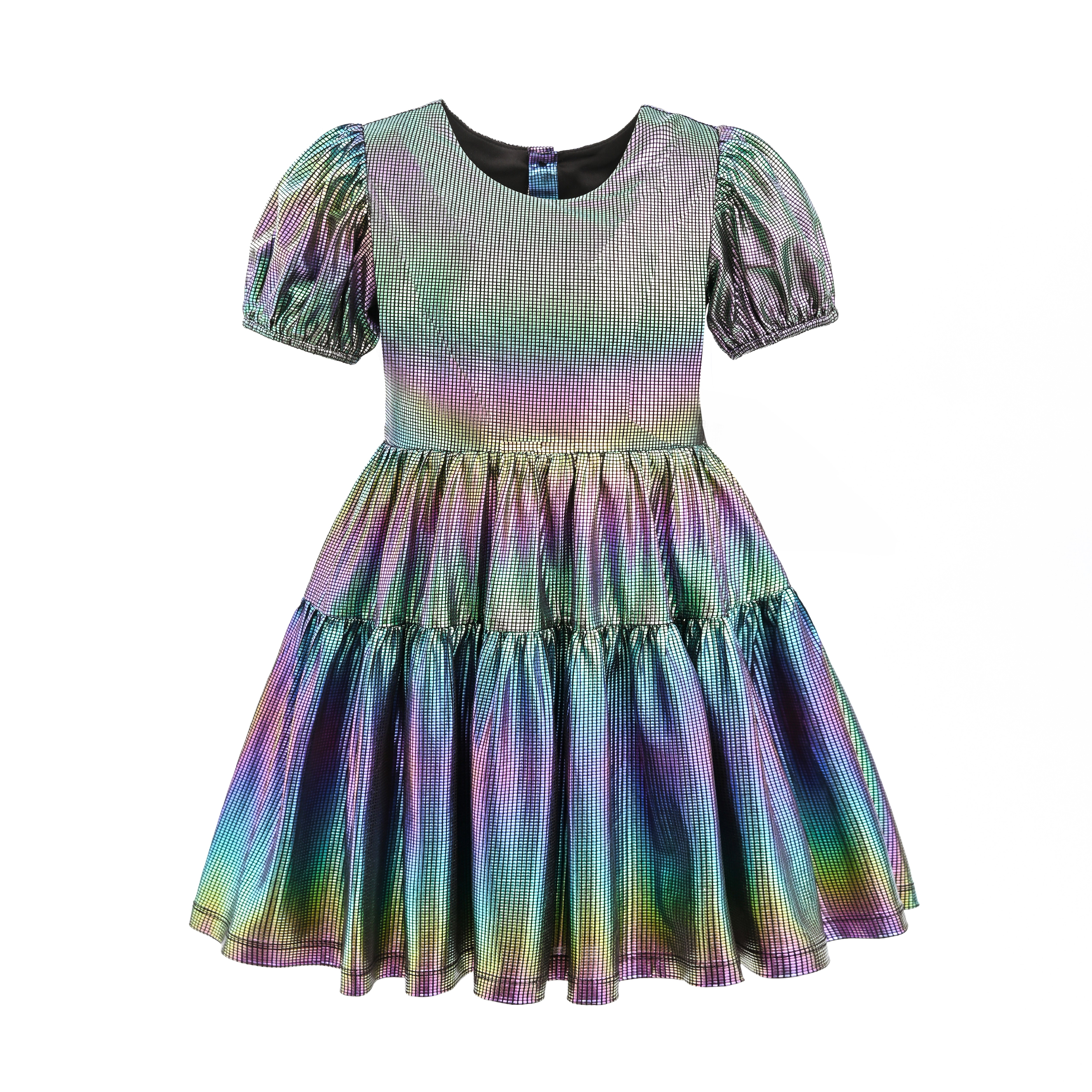 Retro Iridescent Puff-Sleeve Dress