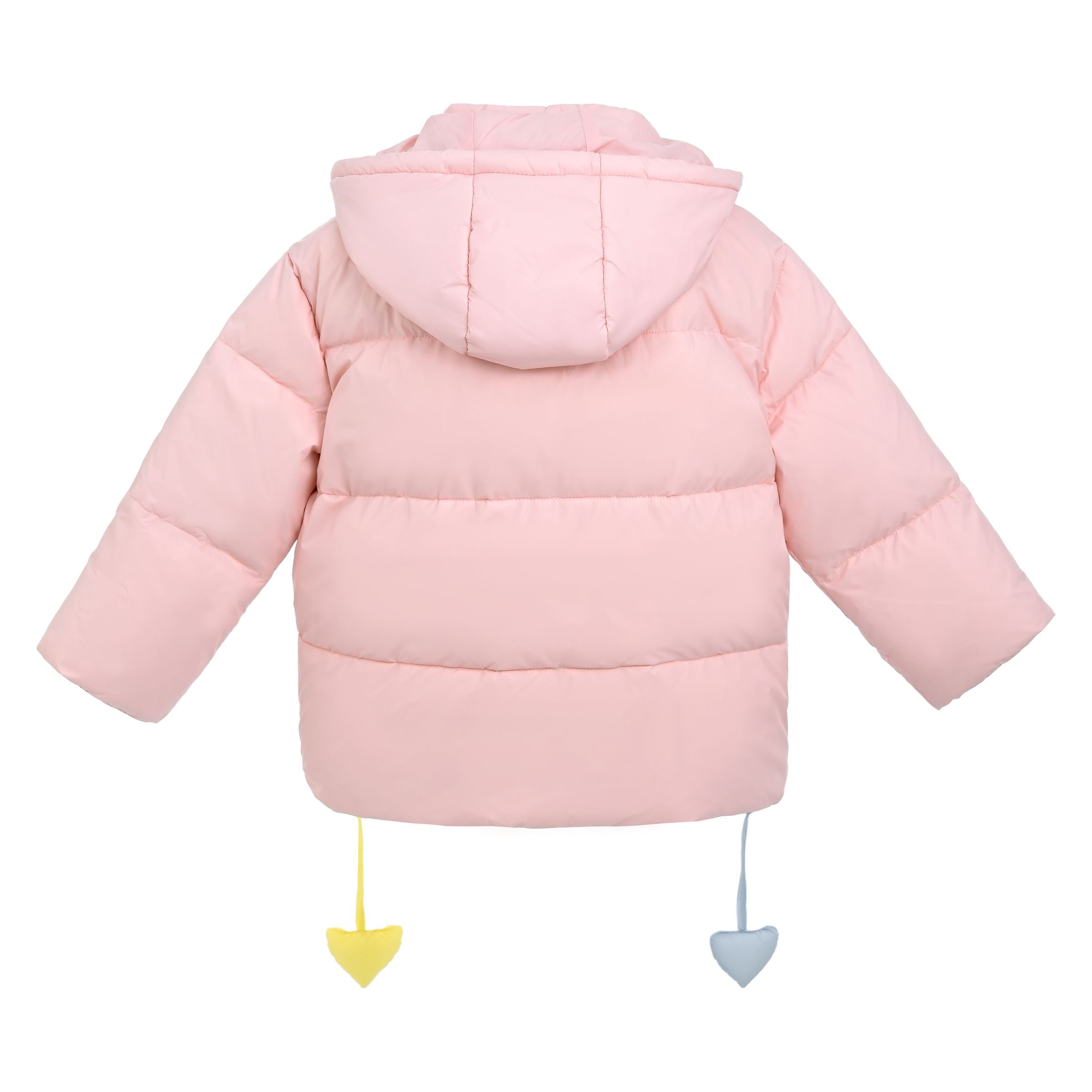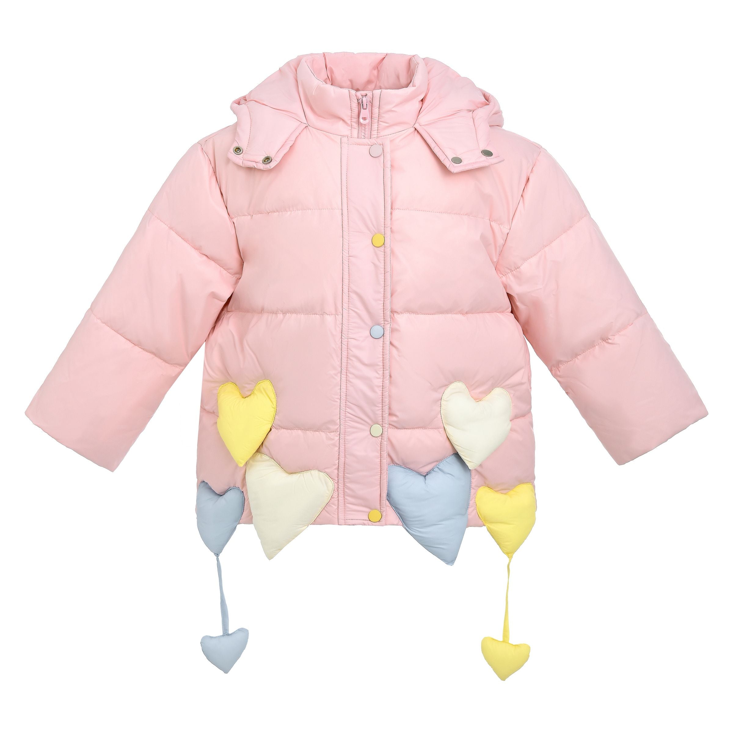 Bundle up in charm with this blush-pink puffer jacket, designed to delight. Featuring a cozy hood and playful multicolored snap buttons, it’s the six dangling pastel heart charms that steal the show—adding a touch of magic to every twirl and tumble. Perfect for chilly days with a sprinkle of imagination.