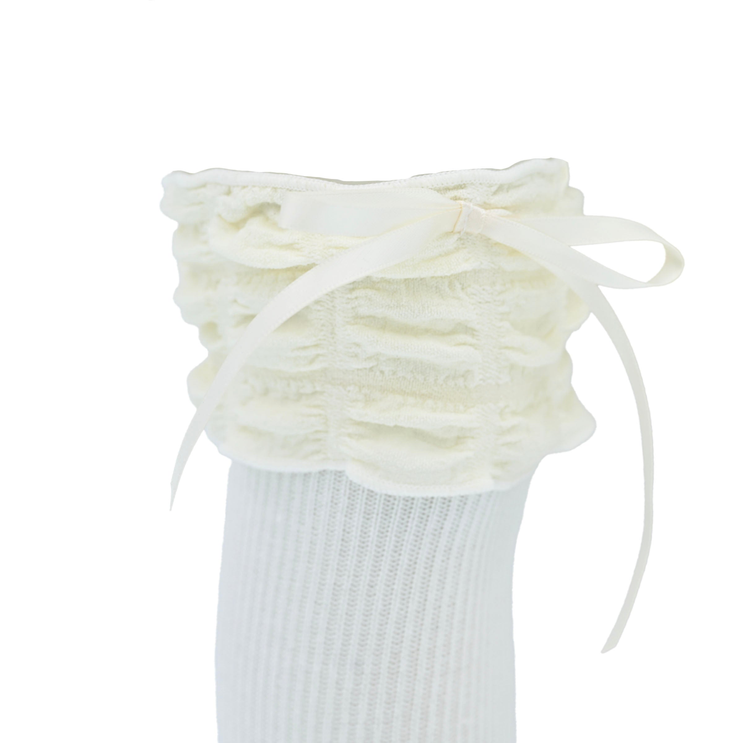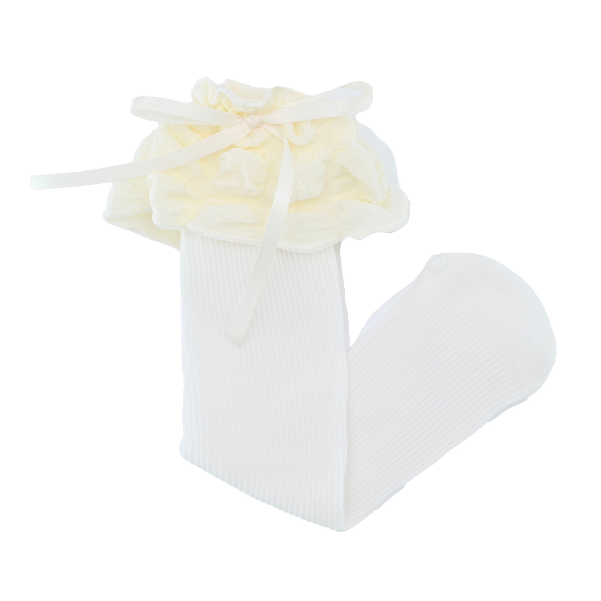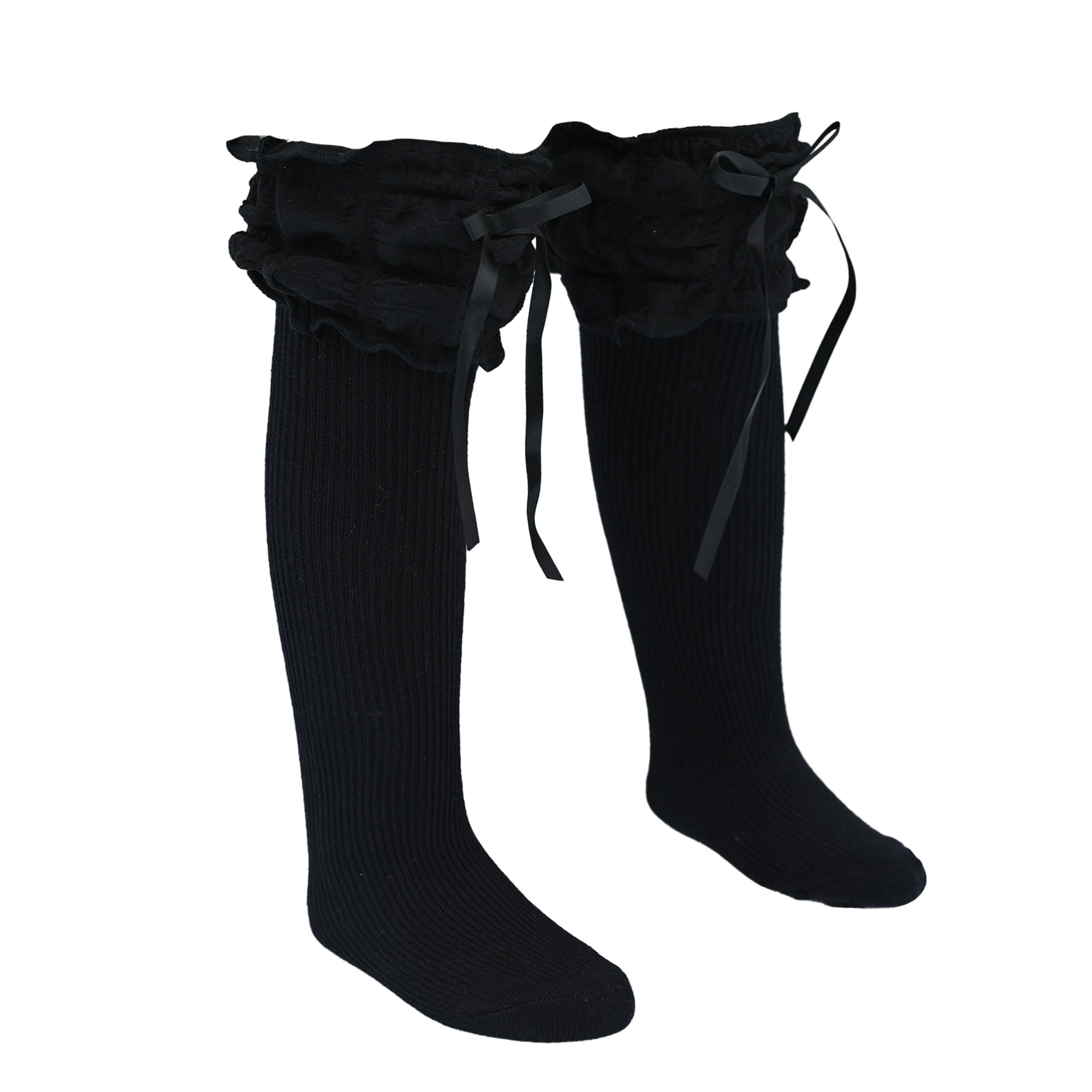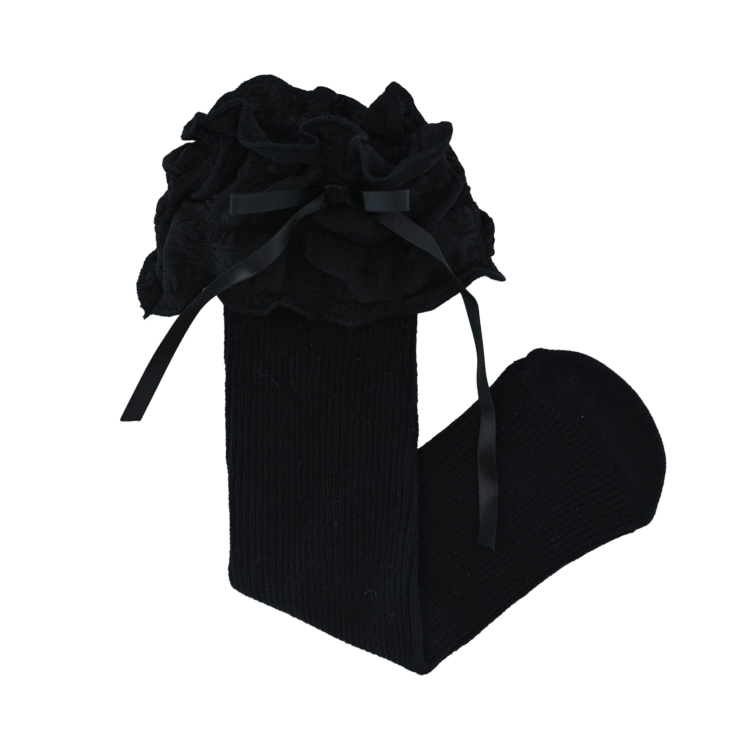 A gracefully cascading ruffle at the top enhances the design, while the satin ribbon detail adds a hint of refinement. Whether paired with a dress for a formal occasion or worn with a casual ensemble for an extra touch of charm, these socks bring a polished, stylish flair to any outfit.