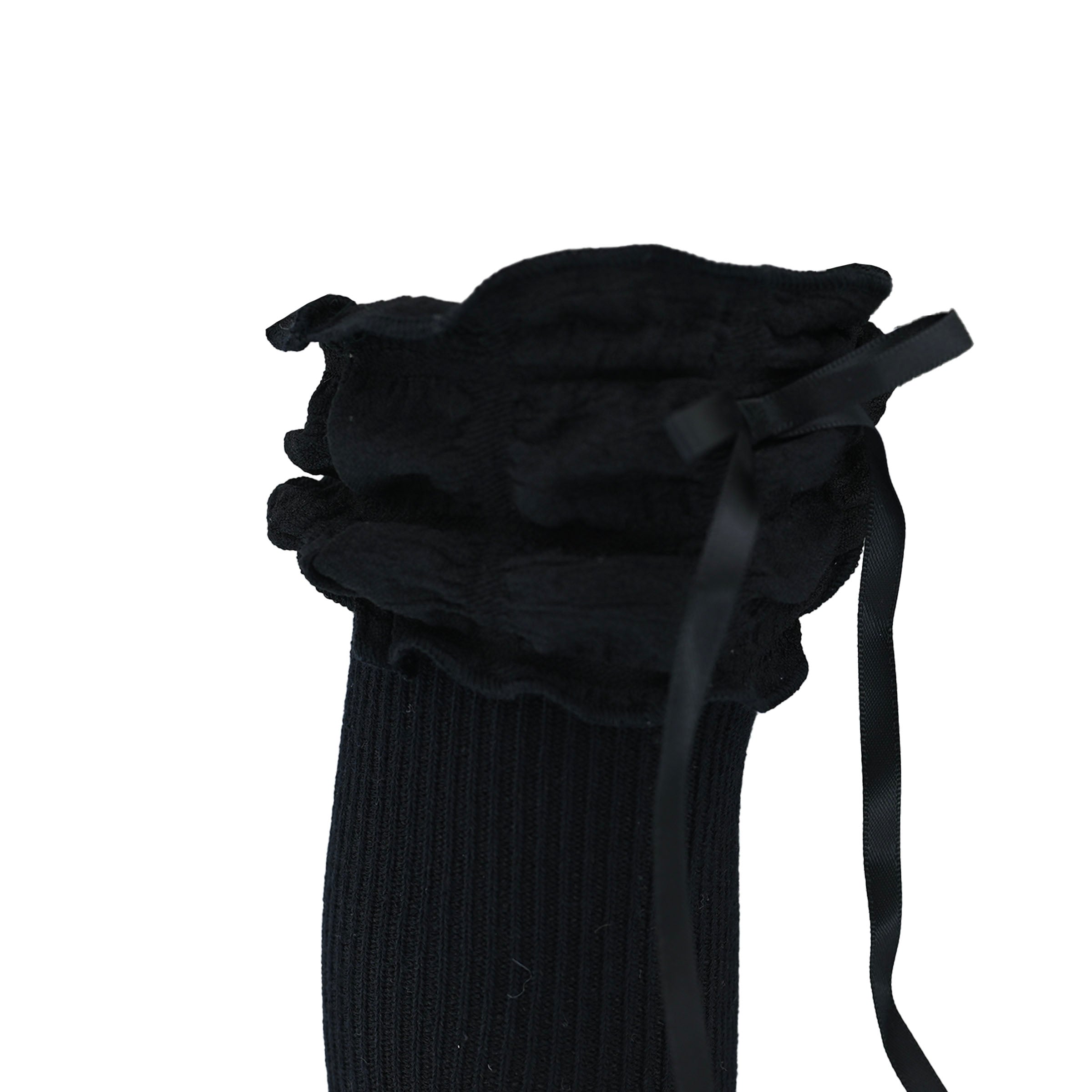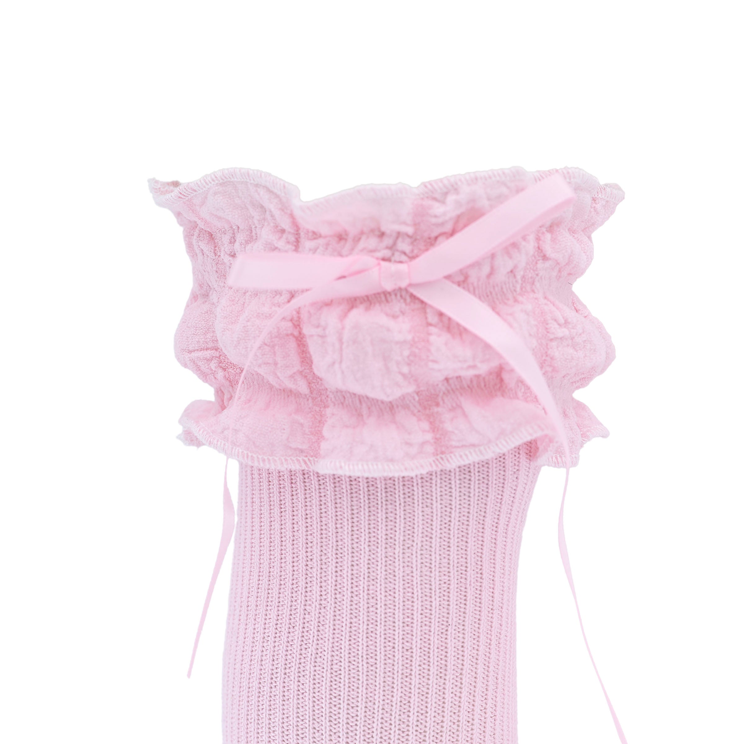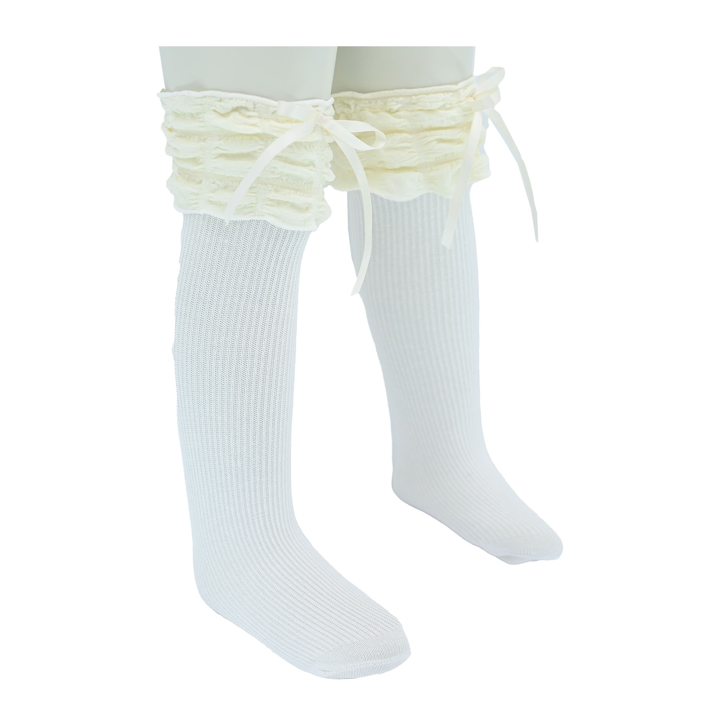 A gracefully cascading ruffle at the top enhances the design, while the satin ribbon detail adds a hint of refinement. Whether paired with a dress for a formal occasion or worn with a casual ensemble for an extra touch of charm, these socks bring a polished, stylish flair to any outfit.