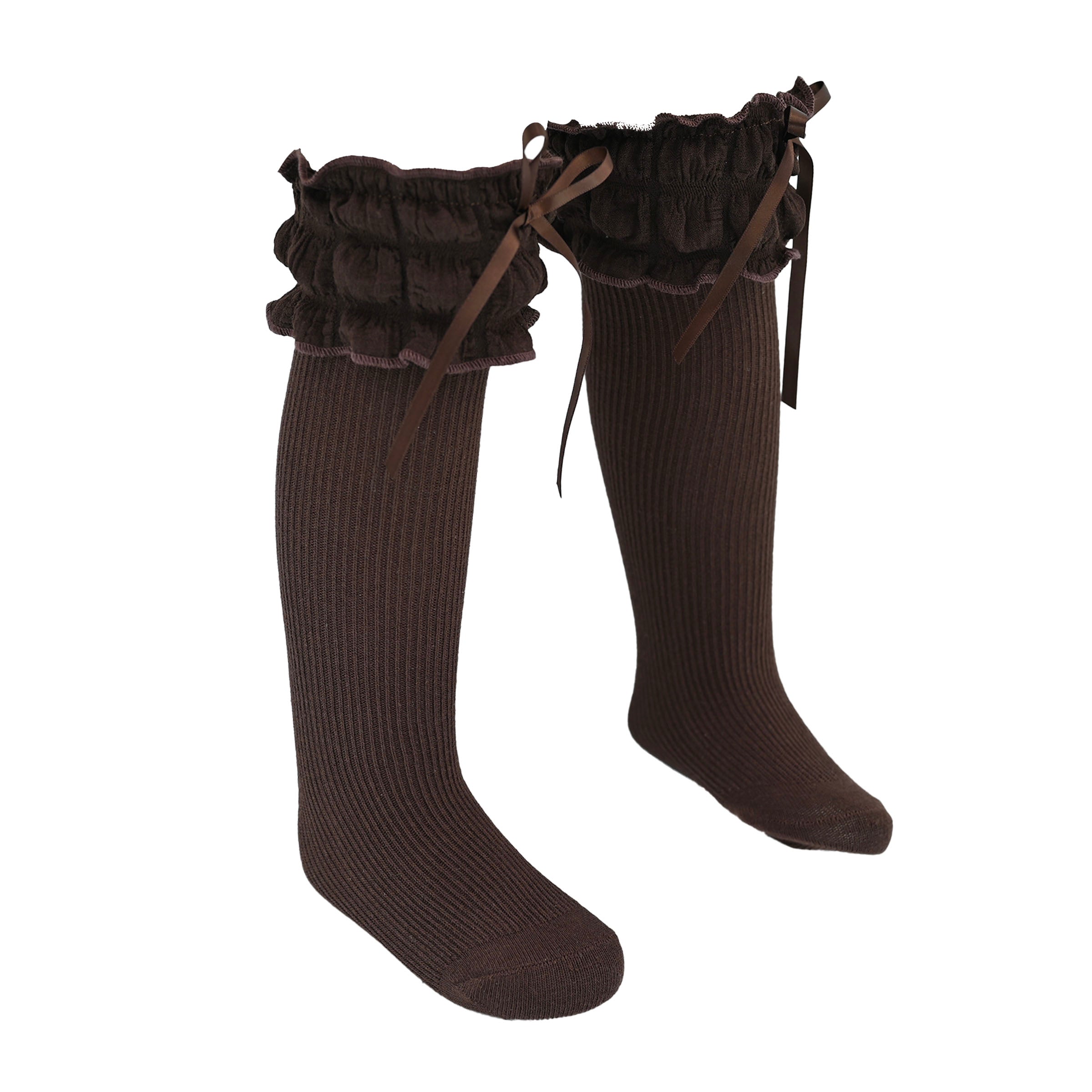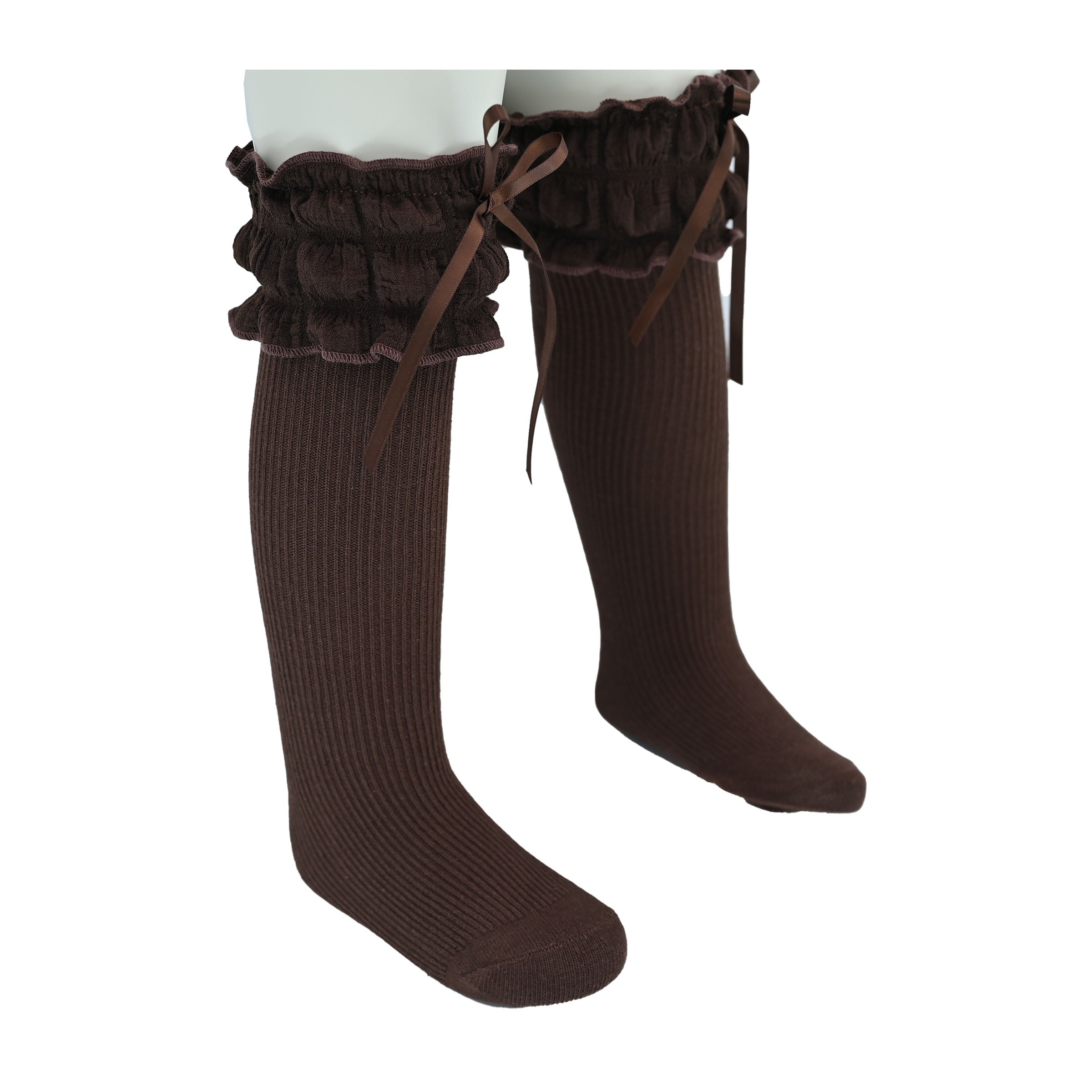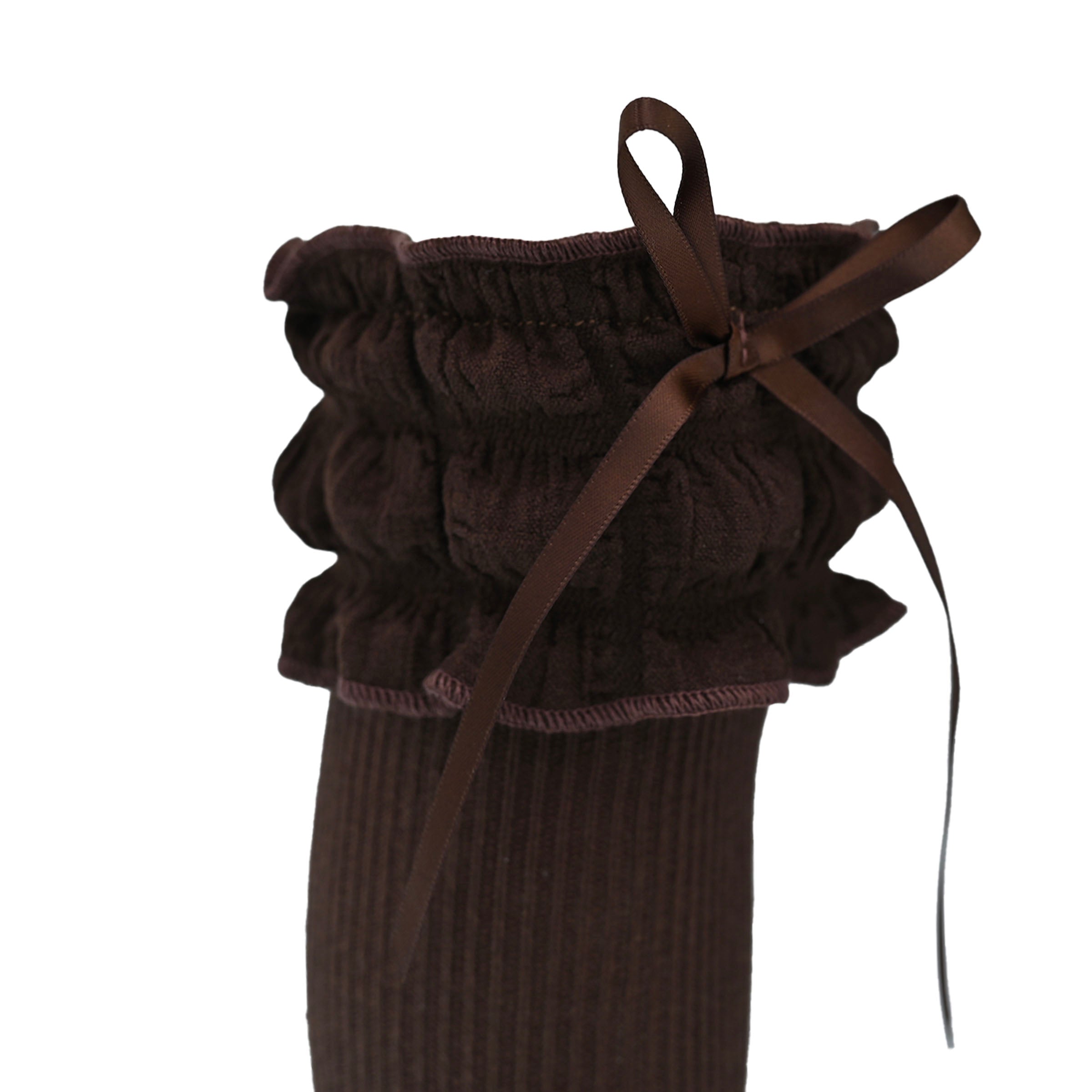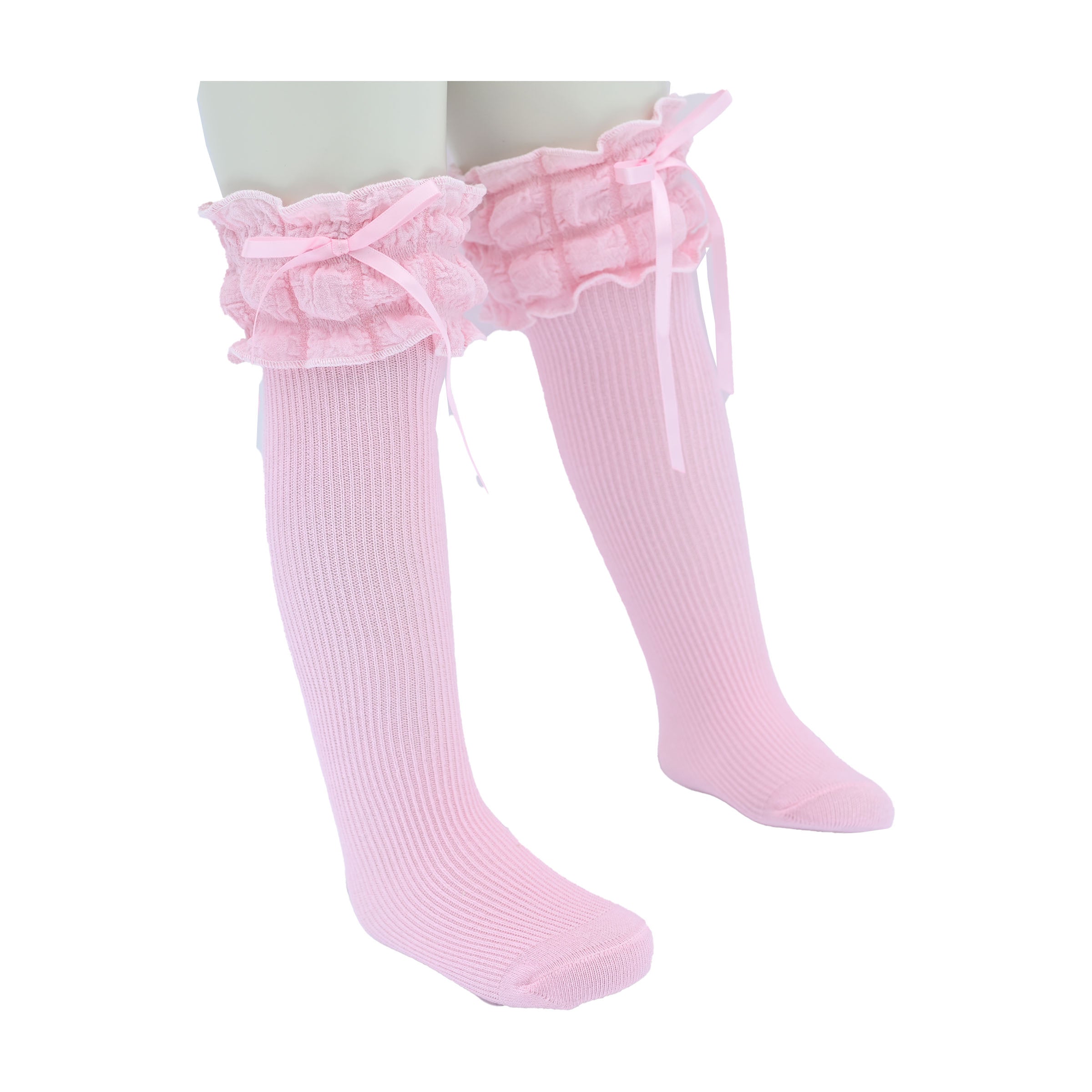 A gracefully cascading ruffle at the top enhances the design, while the satin ribbon detail adds a hint of refinement. Whether paired with a dress for a formal occasion or worn with a casual ensemble for an extra touch of charm, these socks bring a polished, stylish flair to any outfit.
