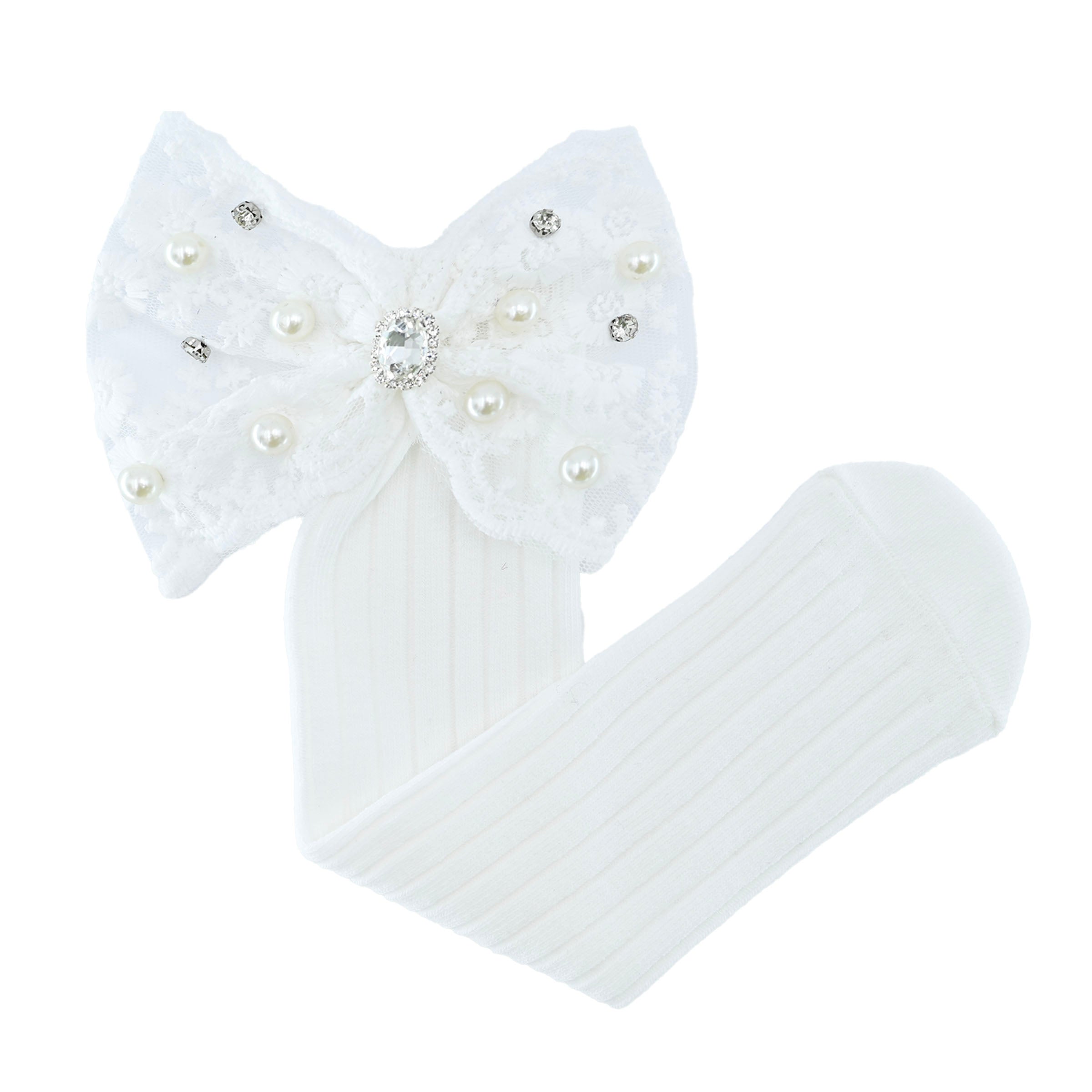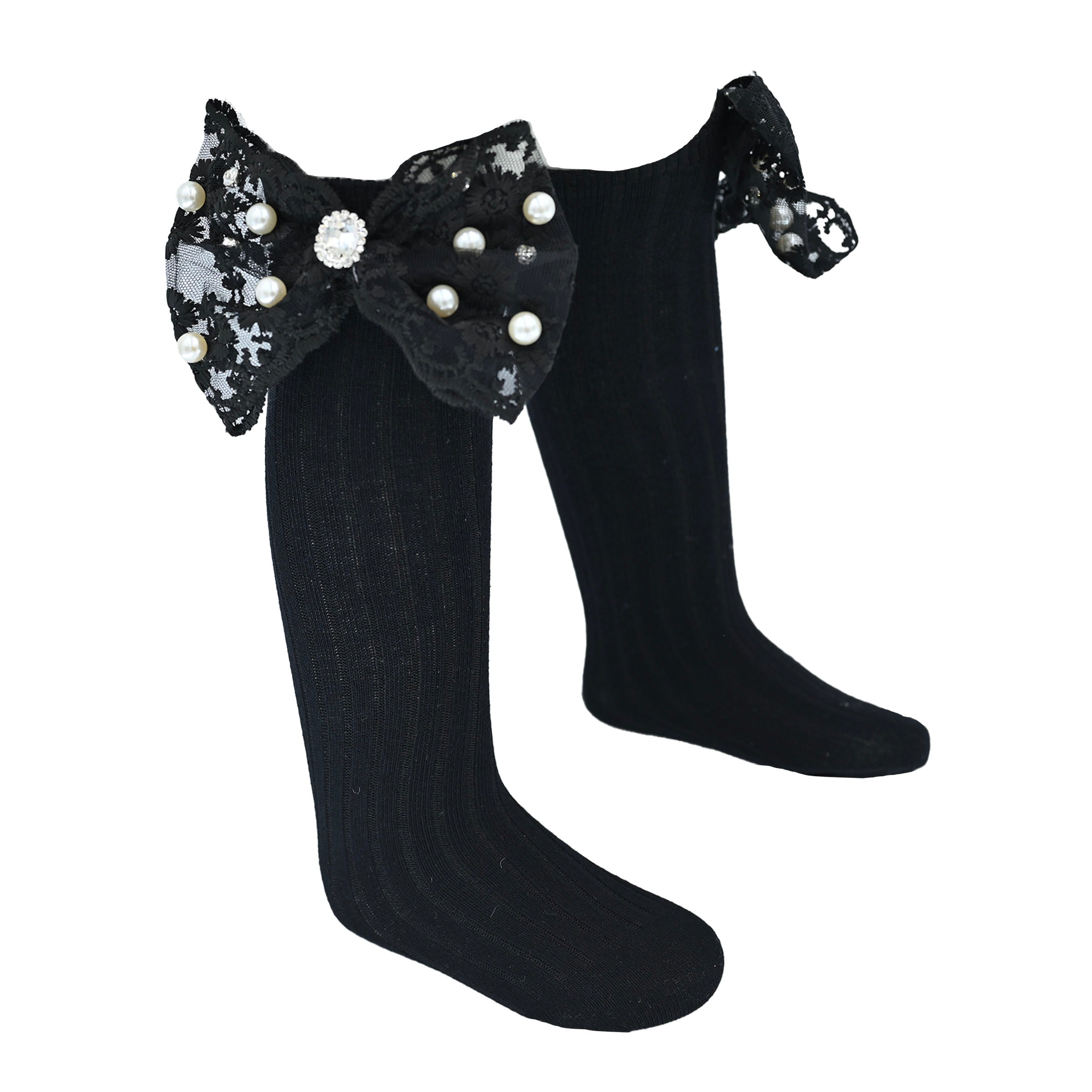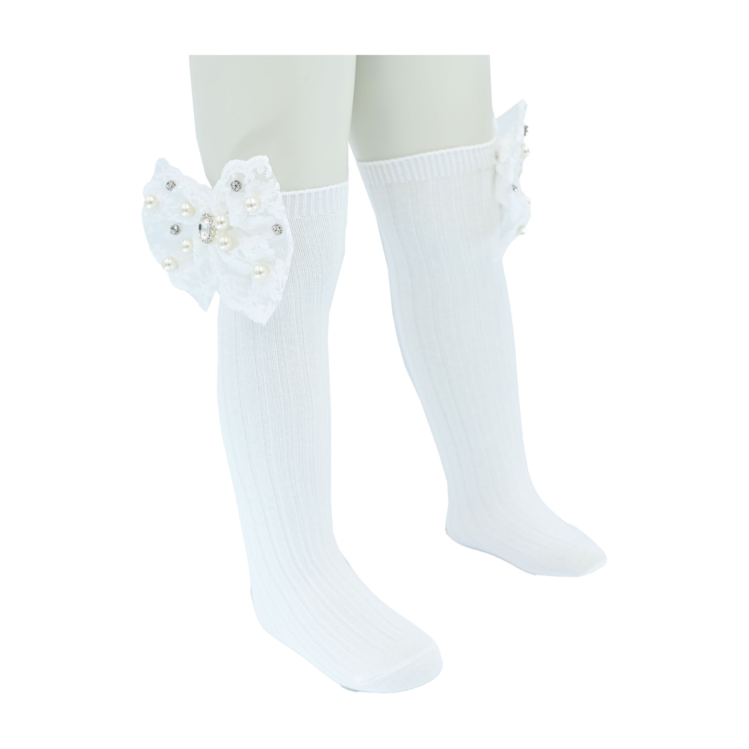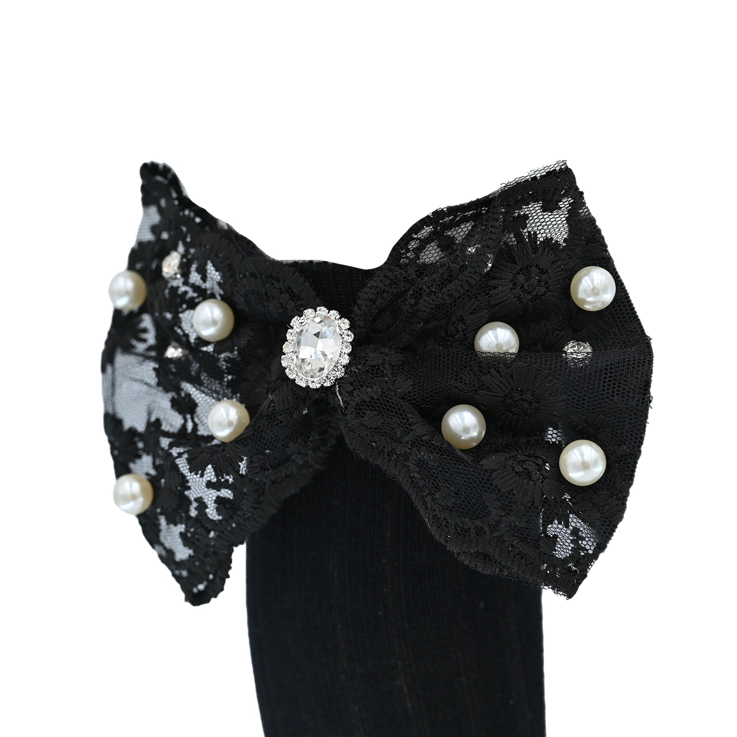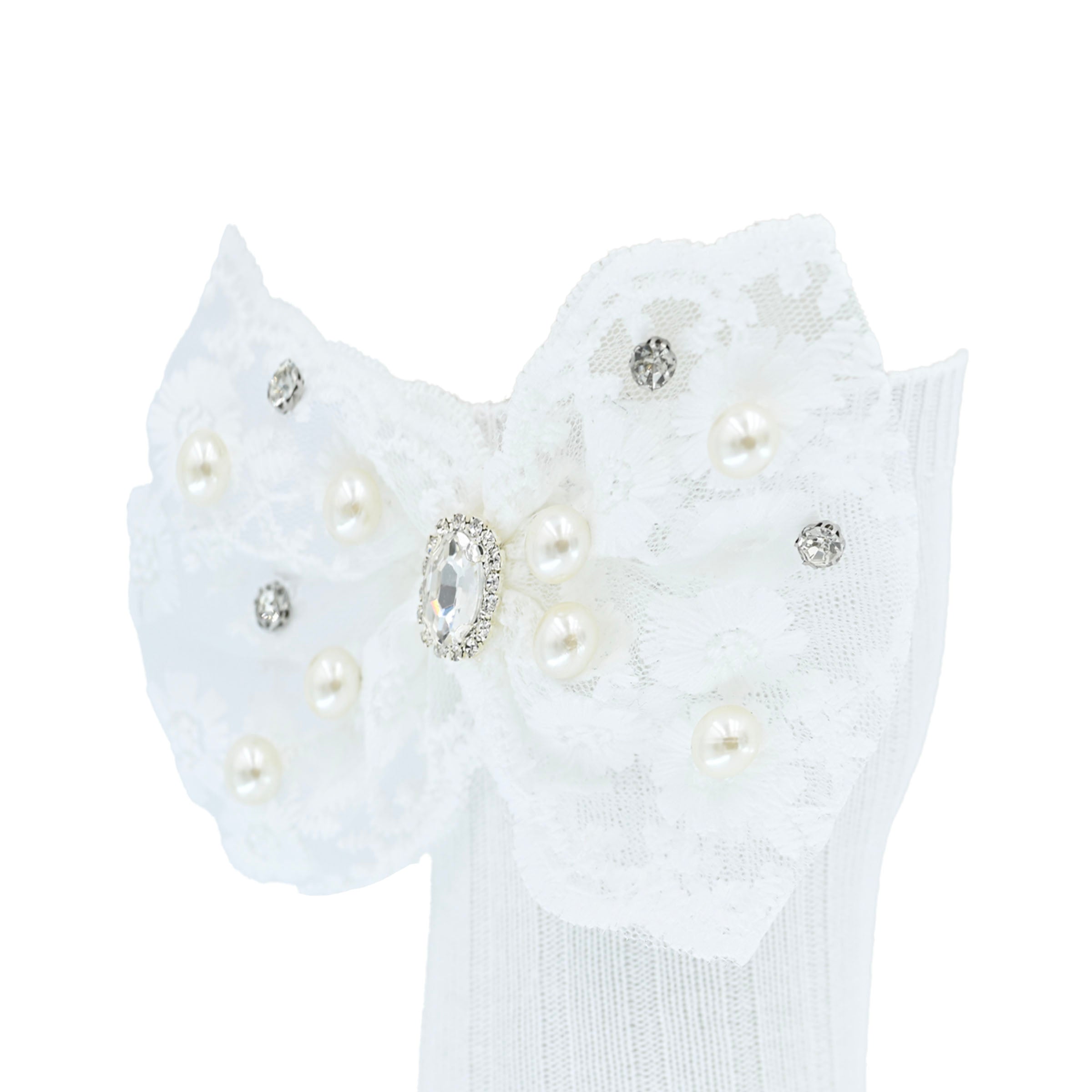 A beautifully crafted bow adorned with pearls and rhinestones sits gracefully at the ankle, adding a touch of sophistication to the design. The subtle shimmer enhances their refined appeal, while the gentle stretch ensures a secure yet comfortable fit. Whether paired with dressy shoes or worn as a statement piece, these socks effortlessly elevate any outfit.