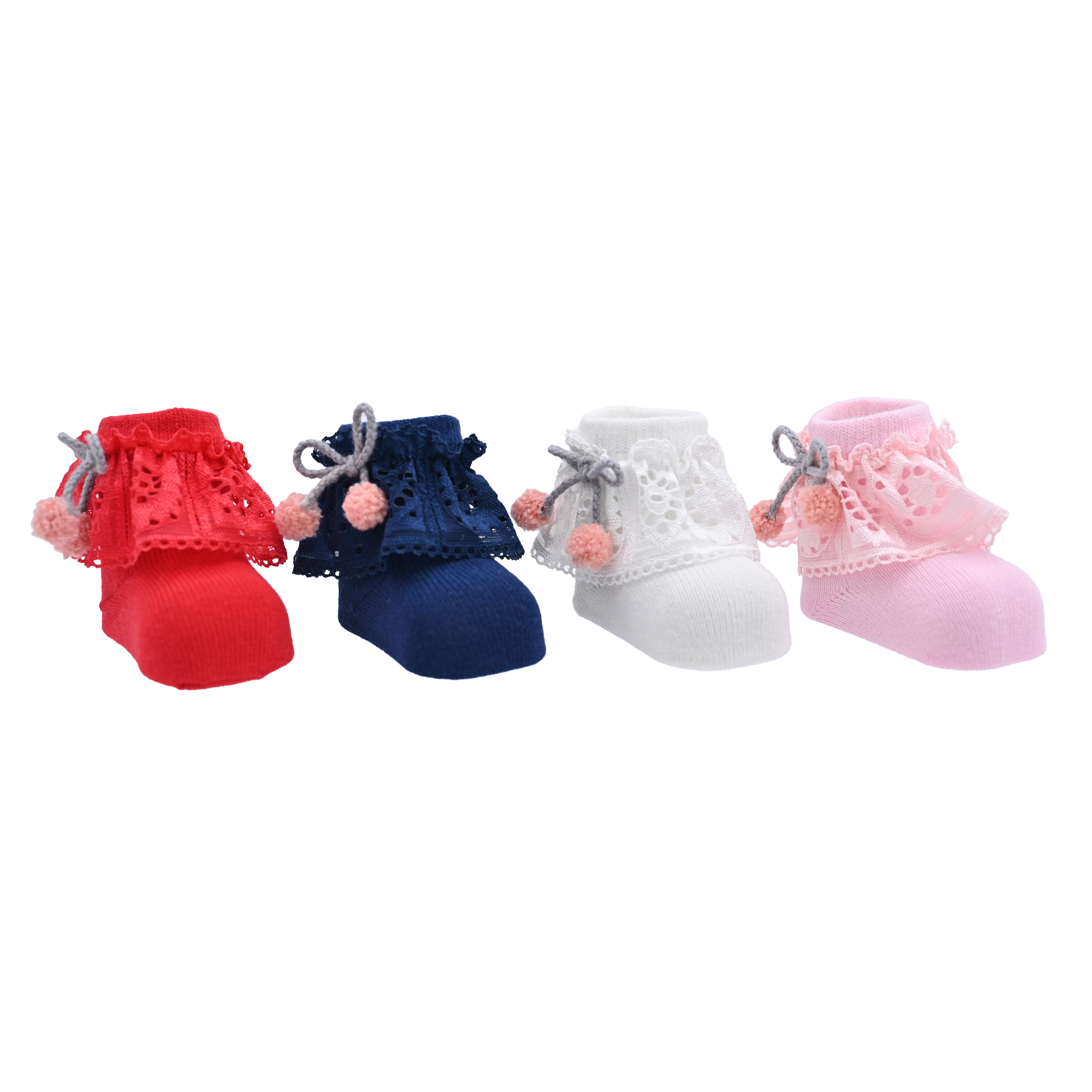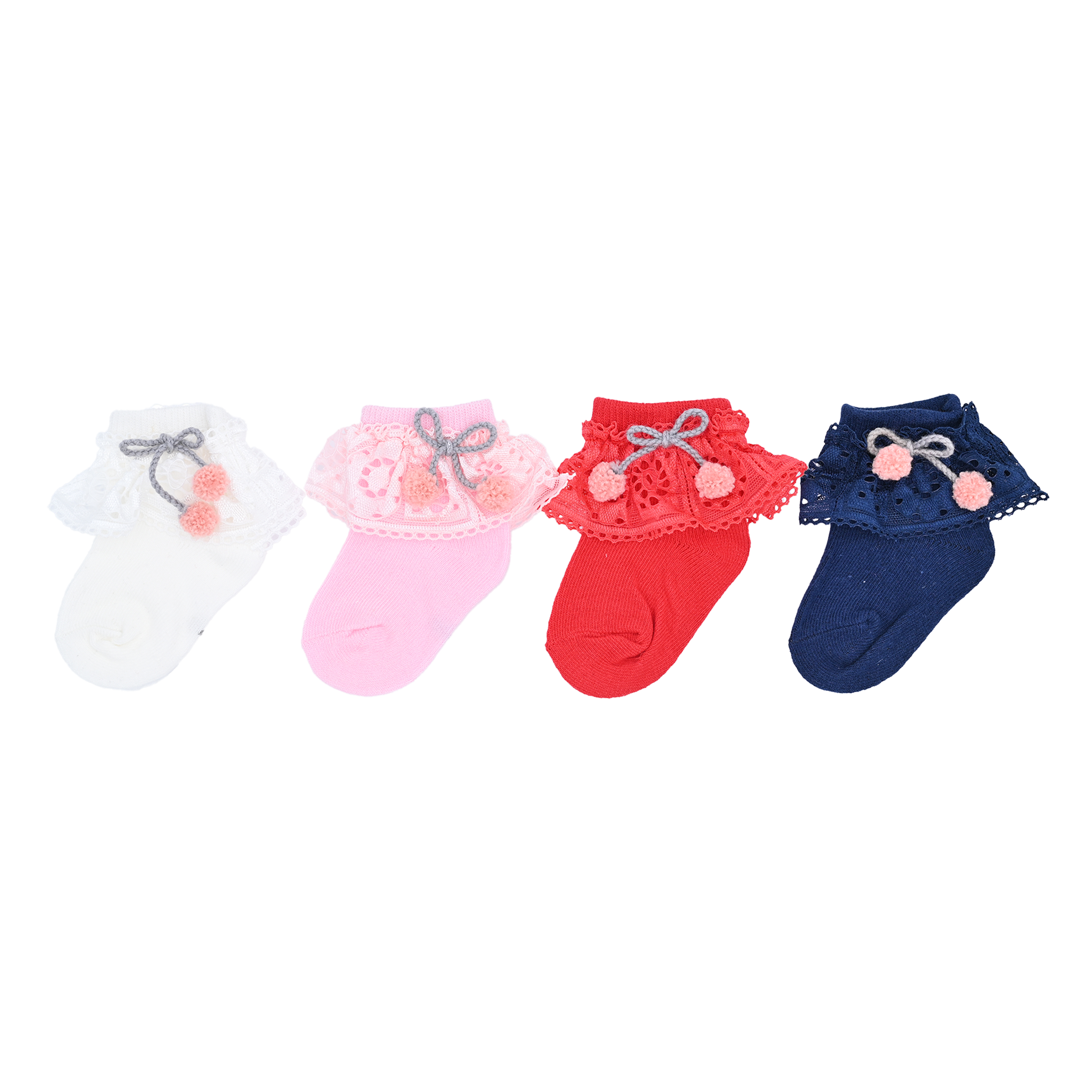 This set of four pairs features a lovely color selection of white, red, navy, and pink, making it easy to coordinate with a variety of outfits. Each pair is designed with a layered trim around the ankle and a sweet pom pom bow accent, adding an extra dose of whimsy to the design.
